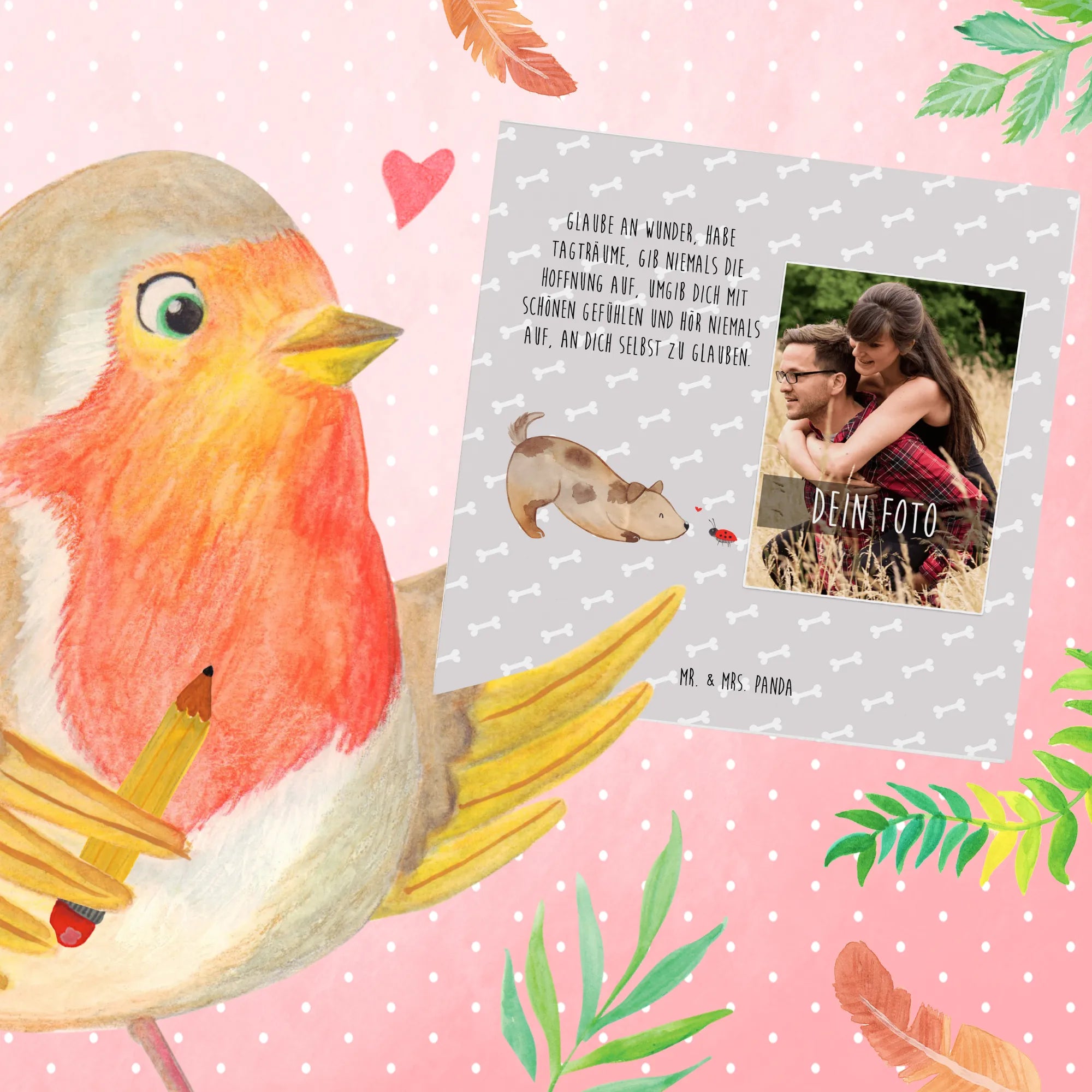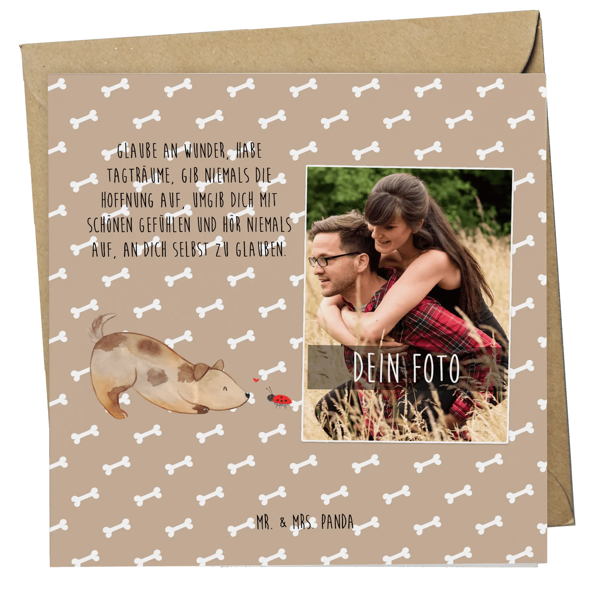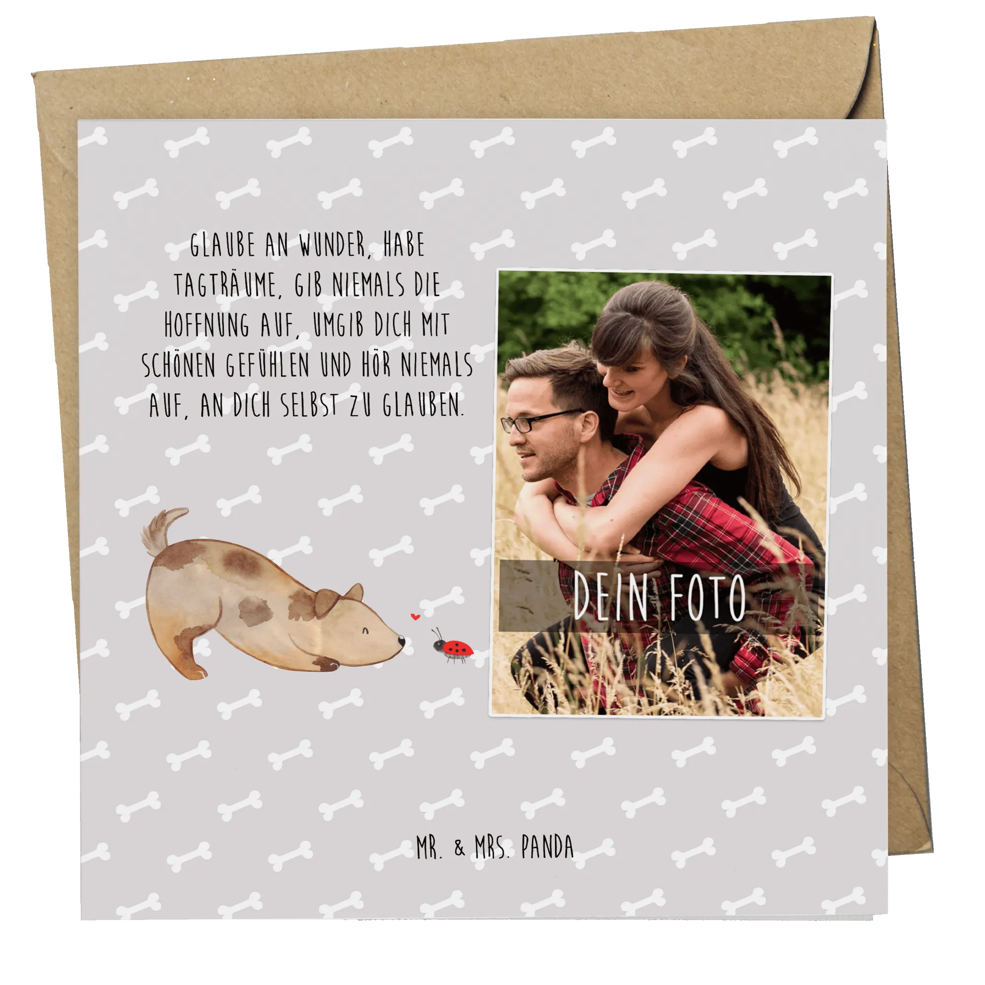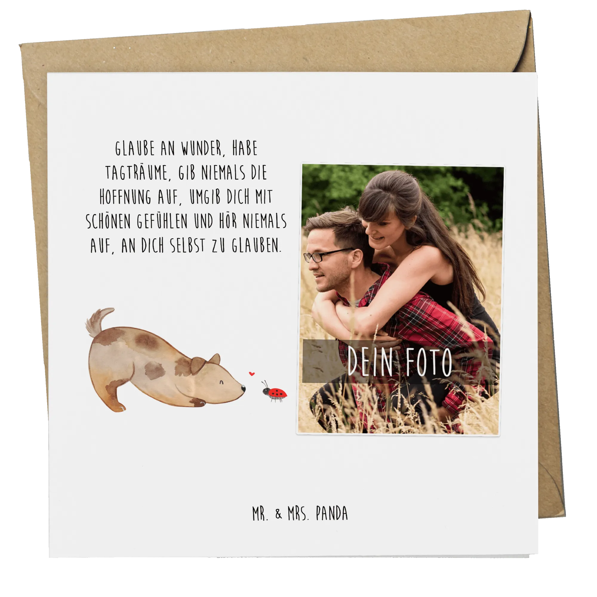 Die personalisierte Foto Deluxe Karte "Hund Marienkäfer" von Mr. & Mrs. Panda ist das perfekte Geschenk für alle Tierliebhaber und Hundebesitzer! Wenn du etwas Einzigartiges suchst, um deinen Freunden oder deiner Familie eine Freude zu machen, dann ist diese Karte genau das Richtige für dich!
