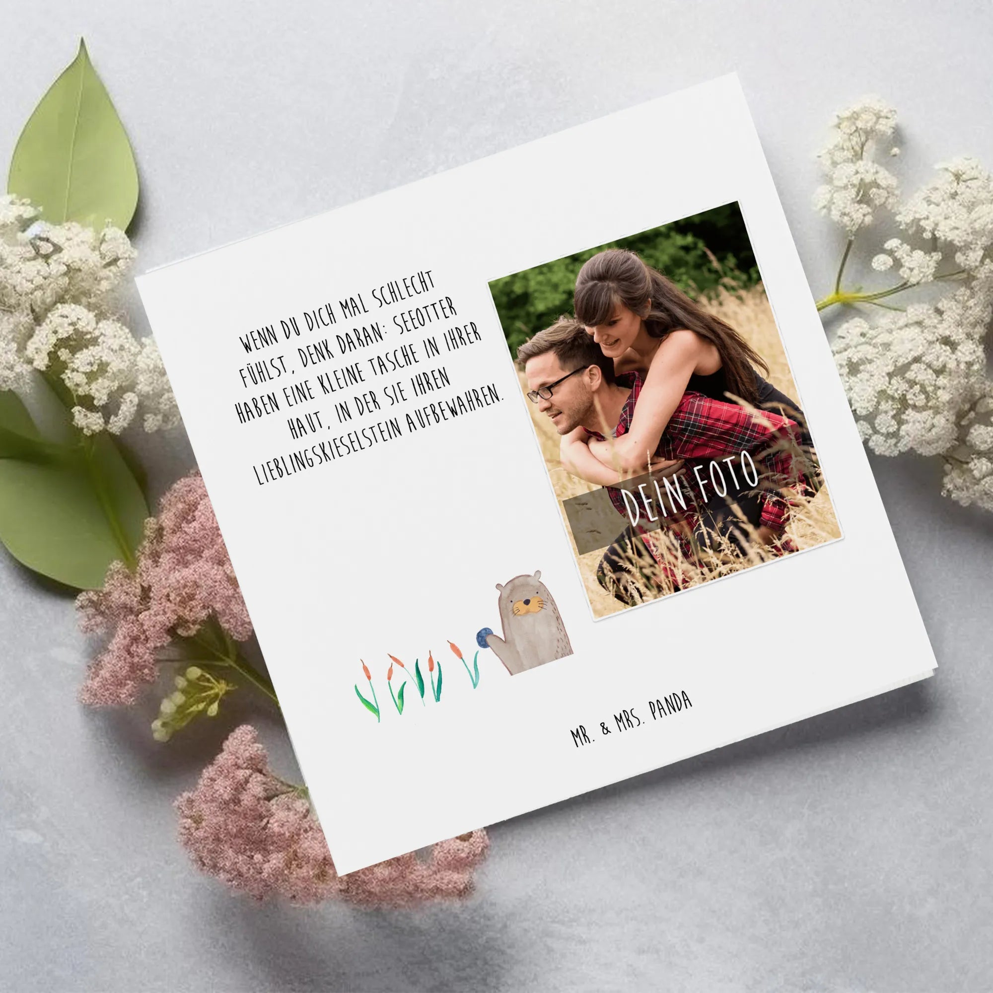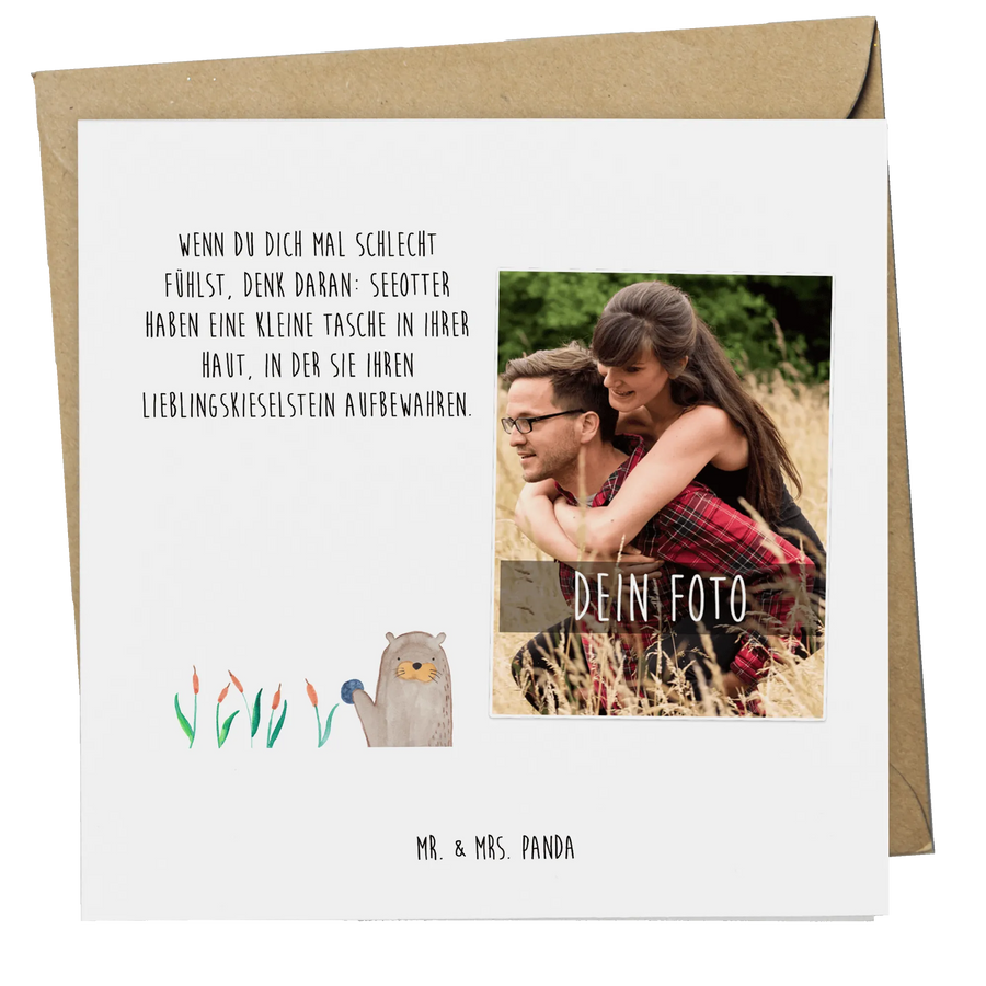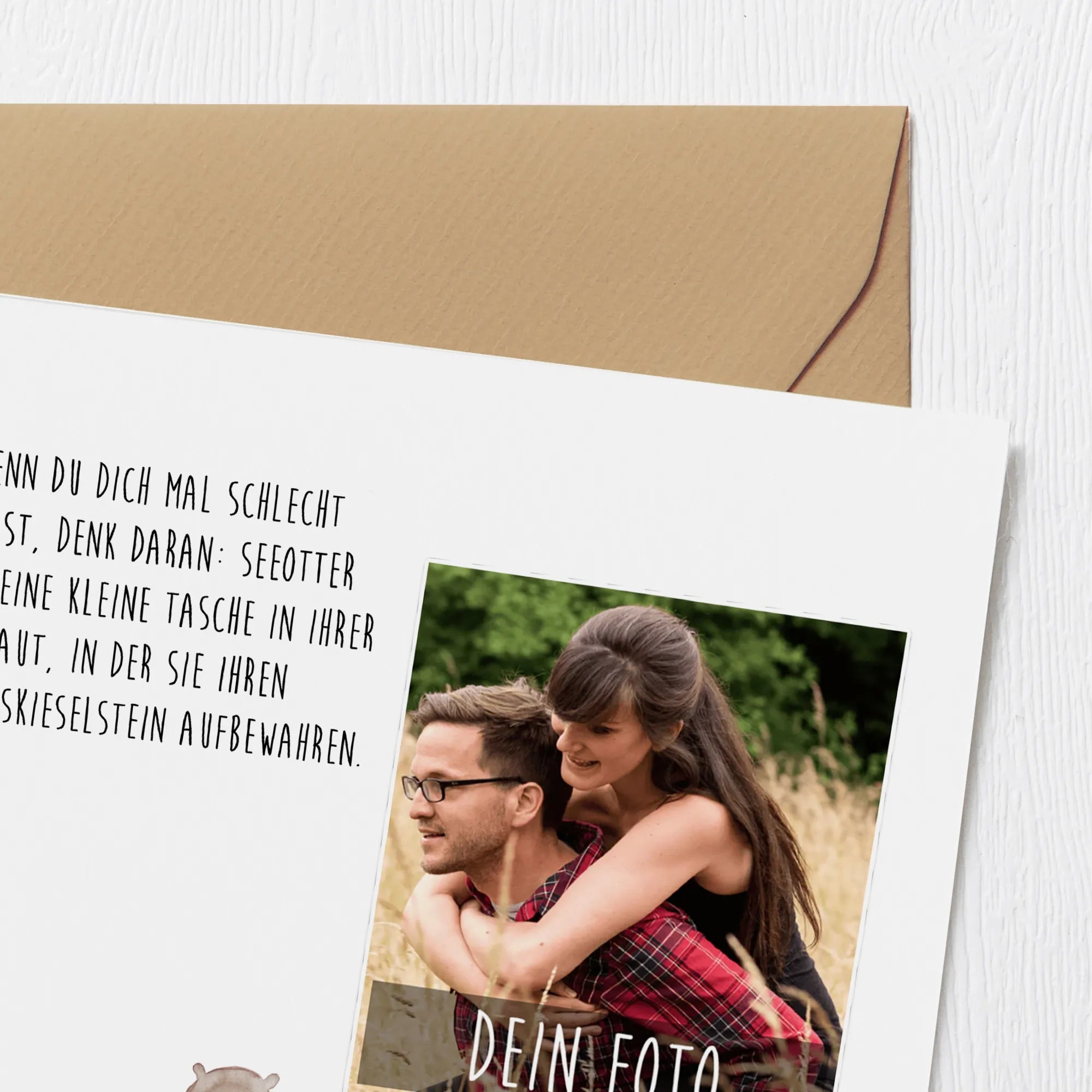 Egal ob für Geburtstage, Hochzeiten oder als kleine Aufmerksamkeit zwischendurch, diese personalisierte Karte ist immer die richtige Wahl. Bringe deine eigenen Fotos und Wünsche ein – die Innenseite bietet genügend Platz für persönliche Botschaften! Mit dem Slogan "Wenn du dich mal schlecht fühlst, denk daran: Seeotter haben eine kleine Tasche in ihrer Haut, in der sie ihren Lieblingskieselstein aufbewahren" wirst du das Herz des Empfängers sicherlich erobern.