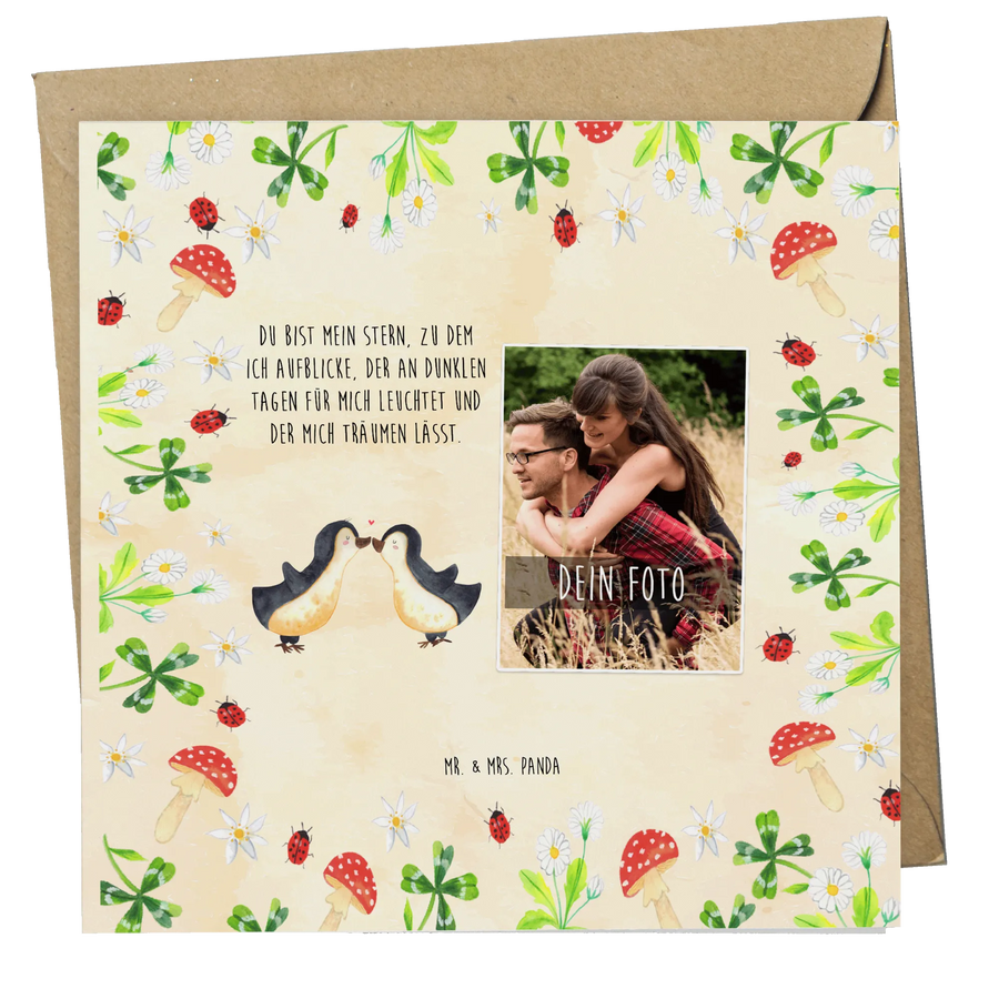 Dein individuelles Foto, ergänzt durch den emotionalen Spruch 'Du bist mein Stern, zu dem ich aufblicke, der an dunklen Tagen für mich leuchtet und der mich träumen lässt', macht diese Karte zu einem unvergesslichen Erinnerungsstück. Jeder Pinguin auf der Karte erzählt seine eigene Liebesgeschichte und schafft so ein besonderes Geschenk für deinen Partner oder deine Partnerin.