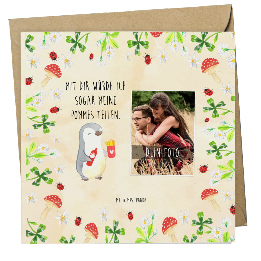 Die personalisierte Foto Deluxe Karte mit dem lieben Pinguin-Motiv "Pommes" von Mr. & Mrs. Panda ist die perfekte Geschenkidee für all deine besonderen Anlässe! Ob zum Valentinstag, Hochzeitstag oder Jahrestag, diese Karte wird das Herz deines Lieblings höher schlagen lassen. Mit dem Spruch "Mit dir würde ich sogar meine Pommes teilen" sorgt sie für ein Lächeln und ist zugleich ein echter Liebesbeweis.