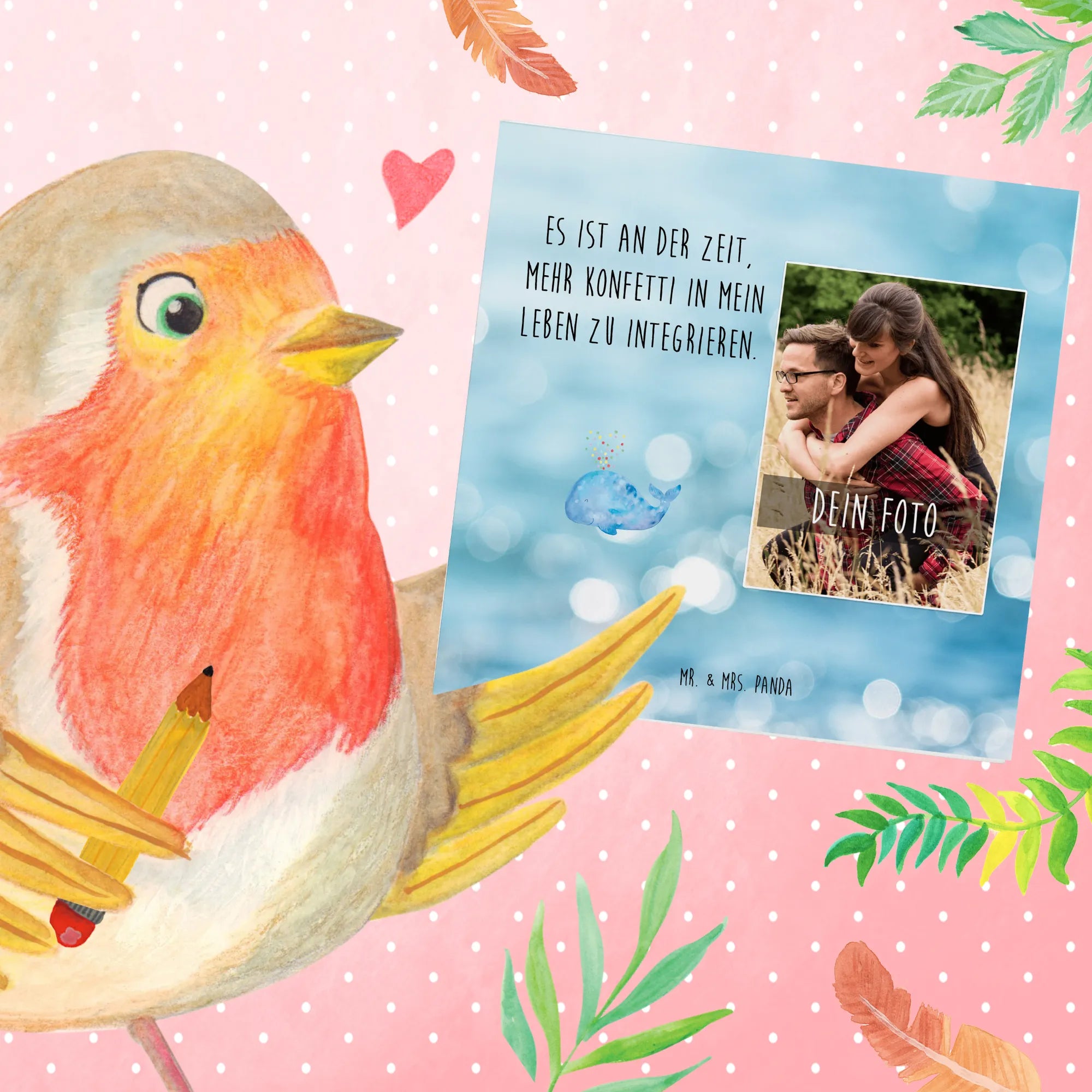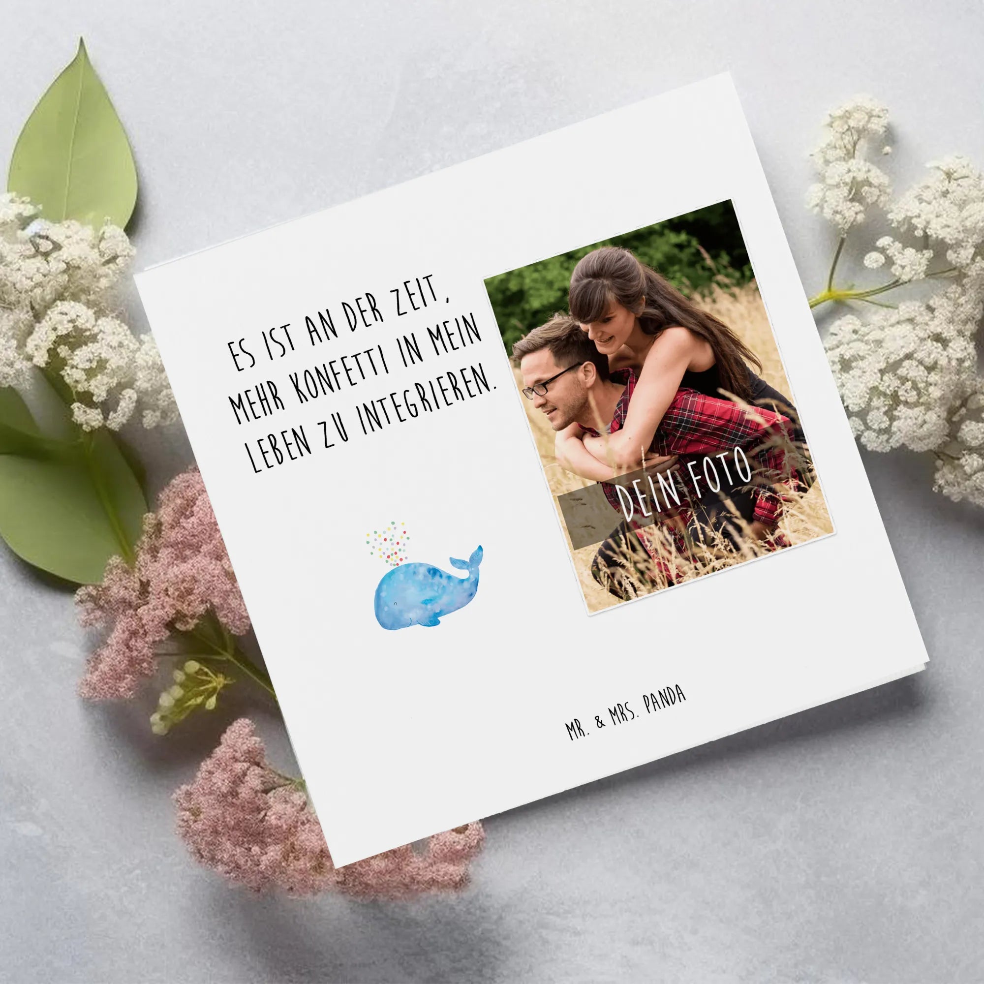 Die personalisierte Foto Deluxe Karte mit dem zauberhaften Motiv 'Wal Konfetti' aus der Meerestiere Kollektion von Mr. & Mrs. Panda ist das perfekte Geschenk für jeden Anlass. Ob als Geburtstagsüberraschung, zur Motivation nach einer Trennung oder einfach, um einen Neuanfang zu feiern – diese Karte bringt Freude in jedes Herz!