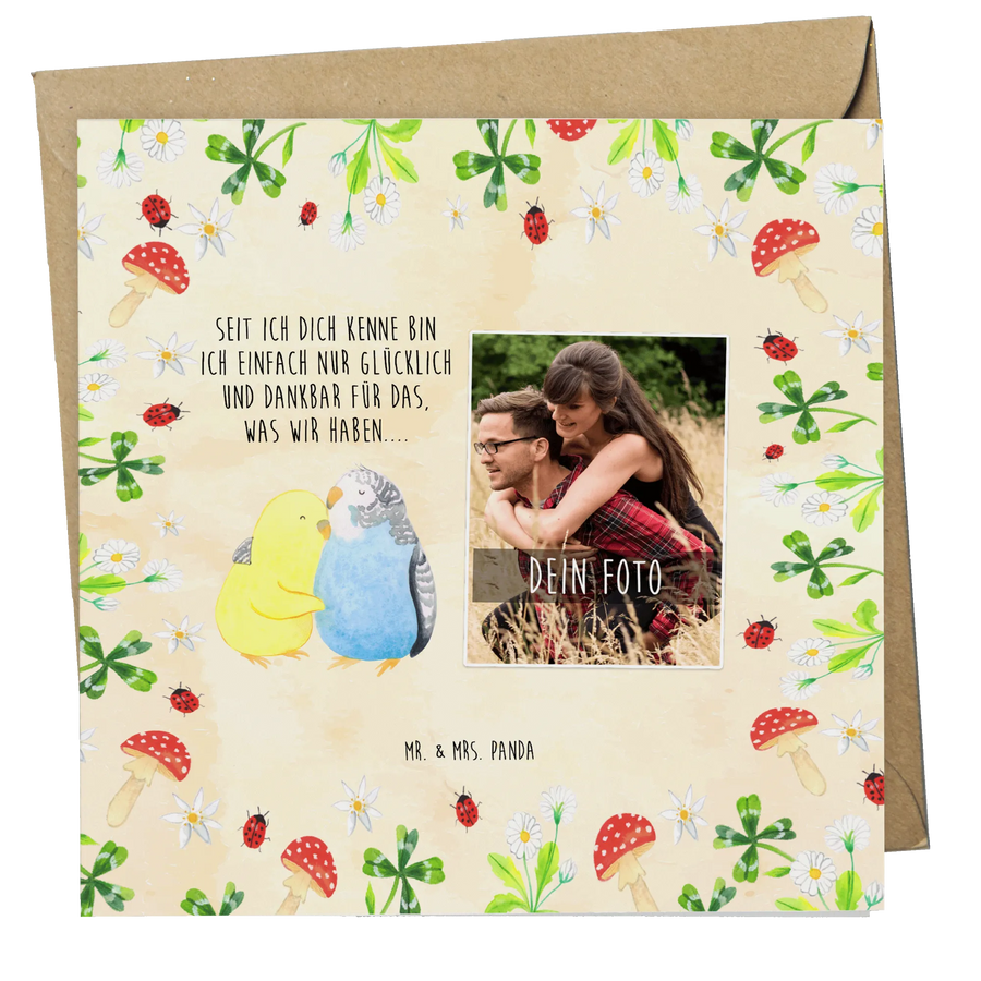 Die personalisierte Foto Deluxe Karte mit dem wundervollen Motiv "Wellensittich Liebe" von Mr. & Mrs. Panda ist der perfekte Weg, um Deine Gefühle für die ganz besonderen Menschen in Deinem Leben auszudrücken.
