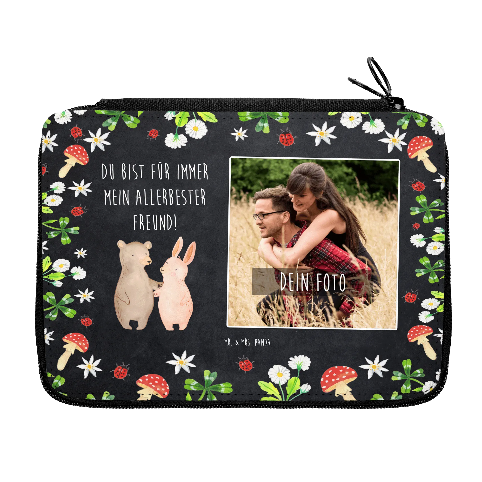 Die personalisierte Foto Federmappe von Mr. & Mrs. Panda ist mehr als nur ein einfaches Schreibutensil – sie ist ein herzliches Geschenk für deine besten Freunde, deinen Partner oder deine liebste Freundin. Mit dem entzückenden Motiv "Bär Hase Umarmen" aus unserer Liebe Kollektion zaubert diese Federmappe jedem ein Lächeln ins Gesicht. Der Bär und der Hase strahlen eine liebevolle Sympathie aus, die perfekt zu unserer Botschaft passt: "Du bist für immer mein allerbester Freund!".