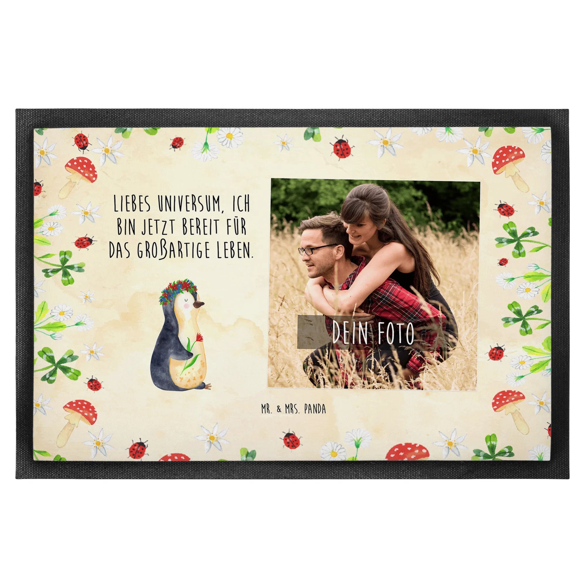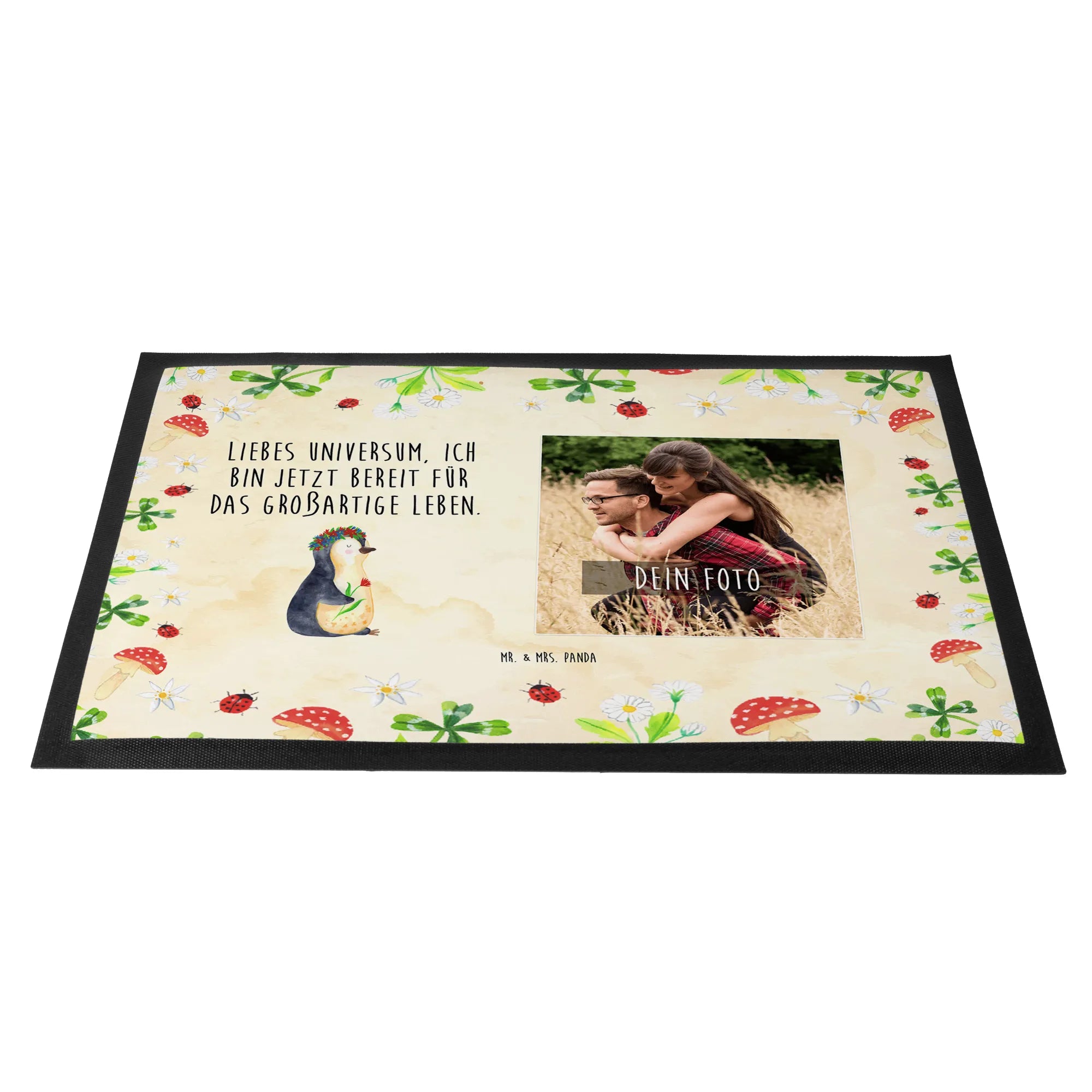 Die personalisierte Foto Fußmatte von Mr. & Mrs. Panda mit dem süßen Pinguin Blumenkranz ist mehr als nur eine Fußmatte – sie ist der perfekte Ausdruck von Lebensfreude und Motivation. Egal, ob du dein eigenes Zuhause aufpeppen oder jemandem eine besondere Freude machen möchtest, diese Fußmatte ist der ideale Weg, um positive Vibes ins Leben zu bringen.