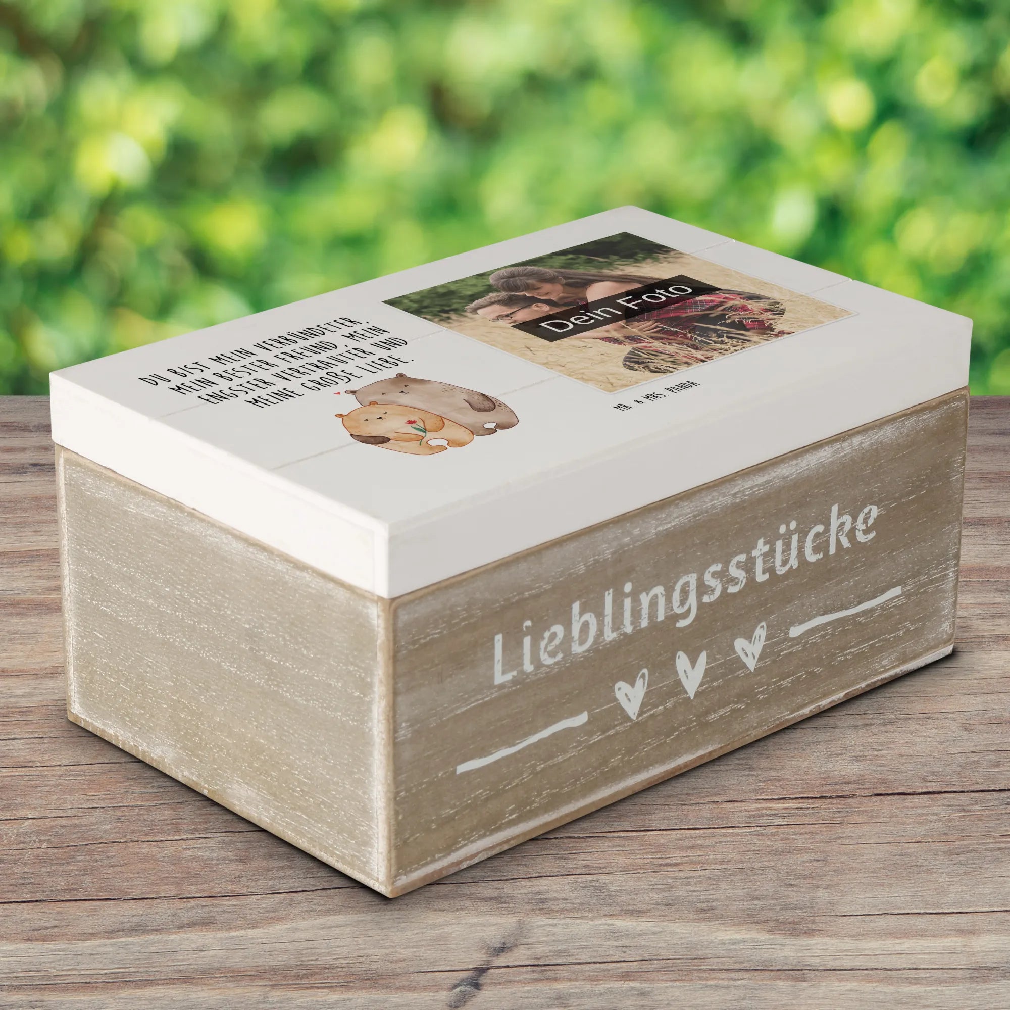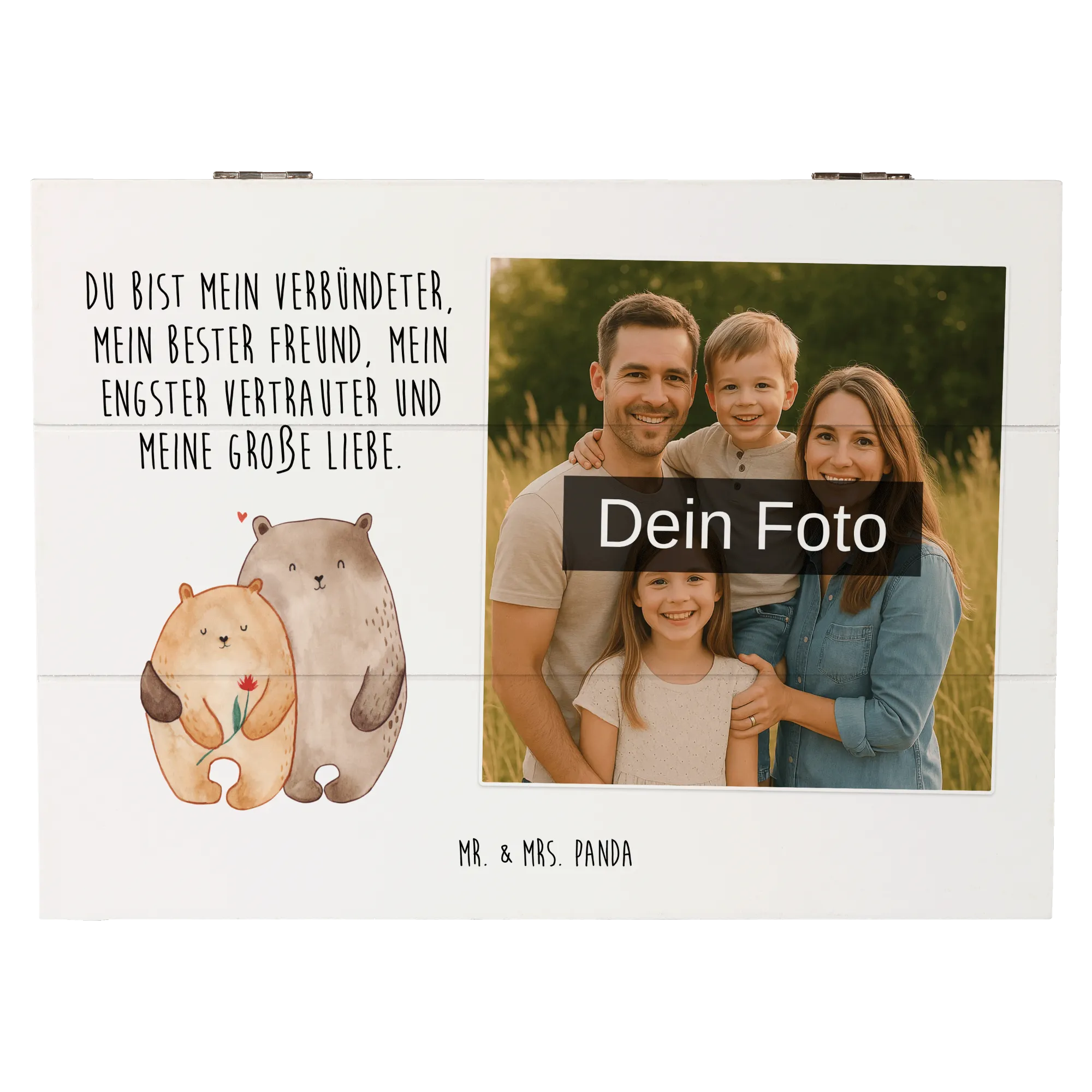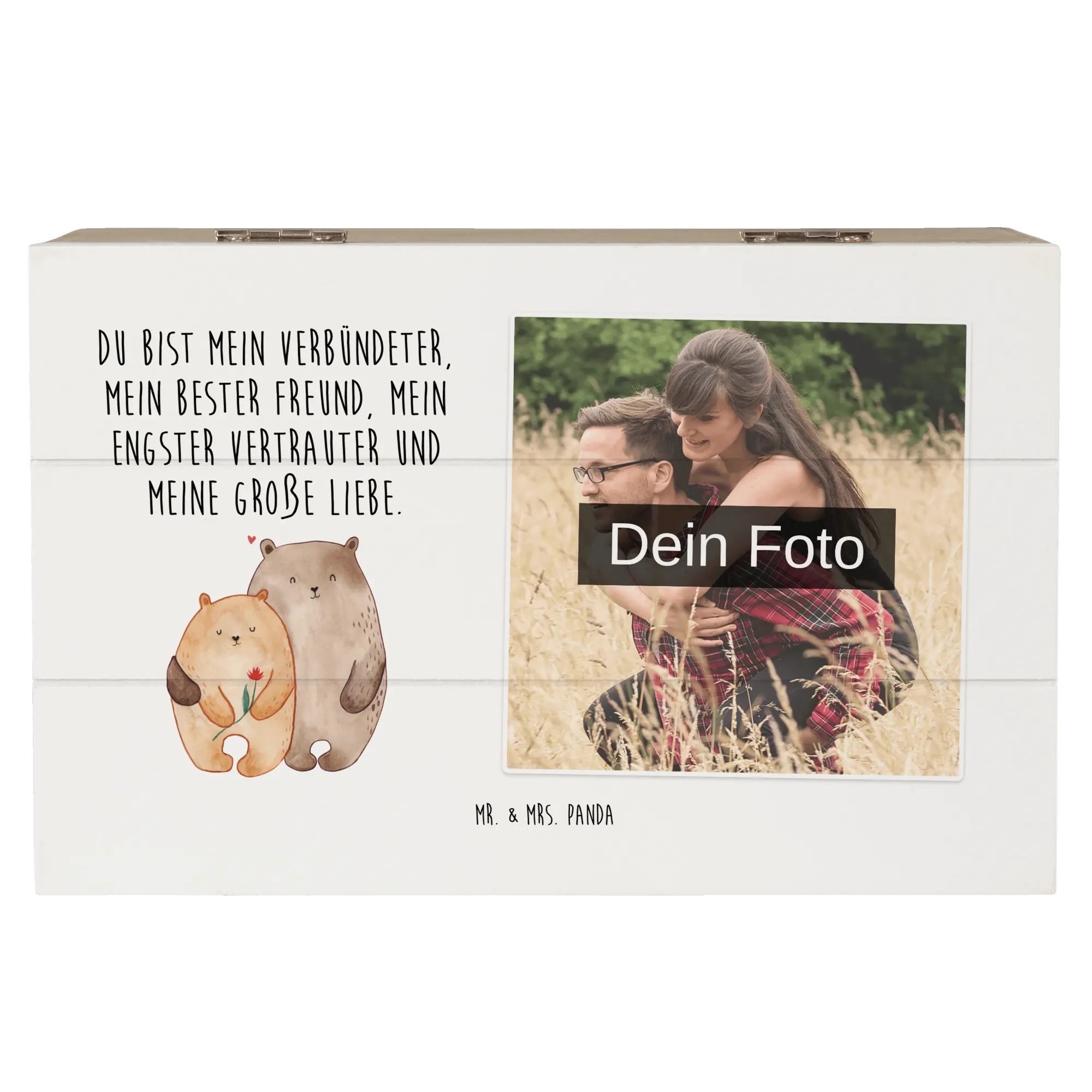 Die perfekte Möglichkeit, deine schönsten Erinnerungen zu bewahren, ist die personalisierte Foto Holzkiste von Mr. & Mrs. Panda! Mit einem traumhaften Motiv von verliebten Bären und dem inspirierenden Spruch 'Du bist mein Verbündeter, Mein bester Freund, mein engster Vertrauter und meine große Liebe.' verkörpert diese Kiste die tiefen Emotionen der Liebe.