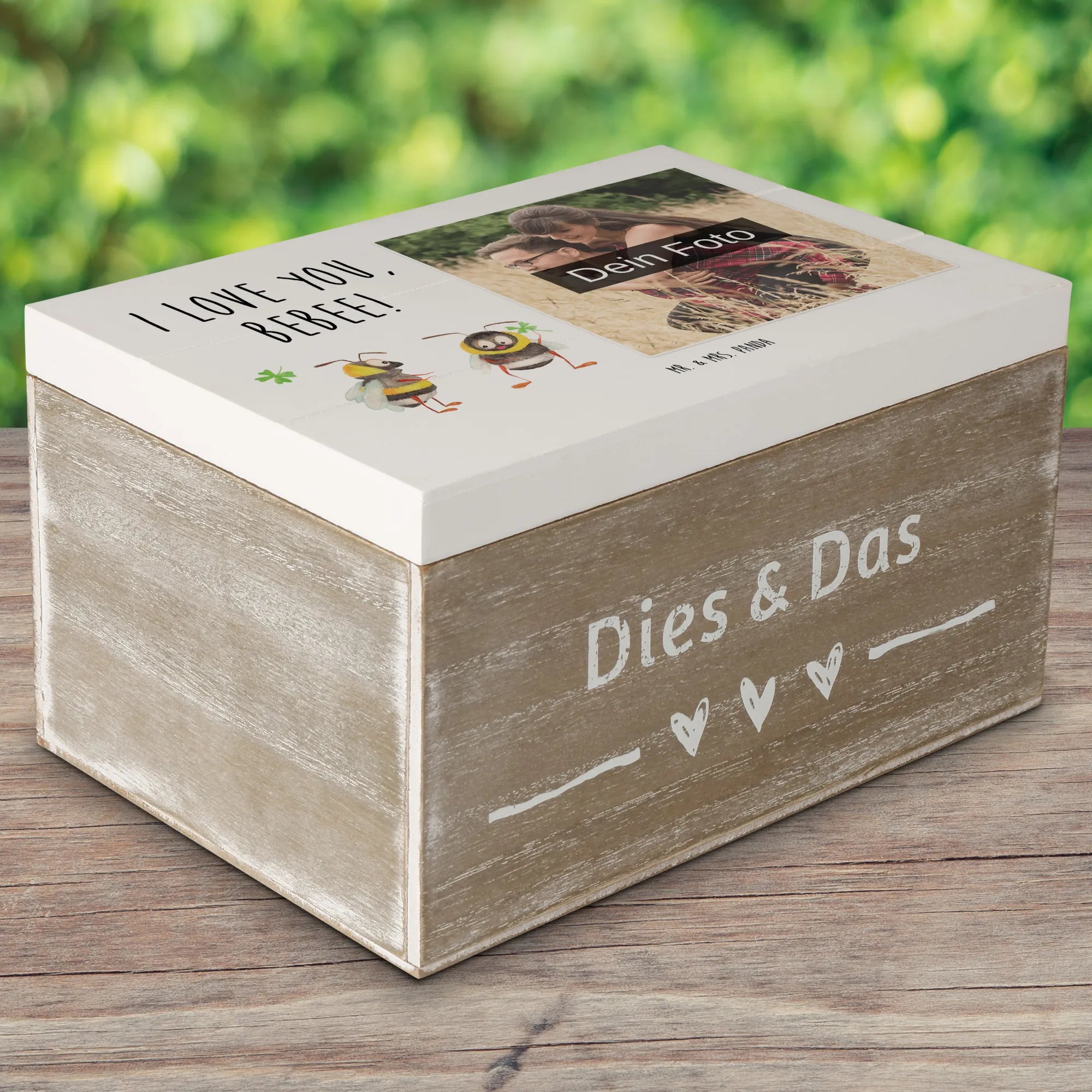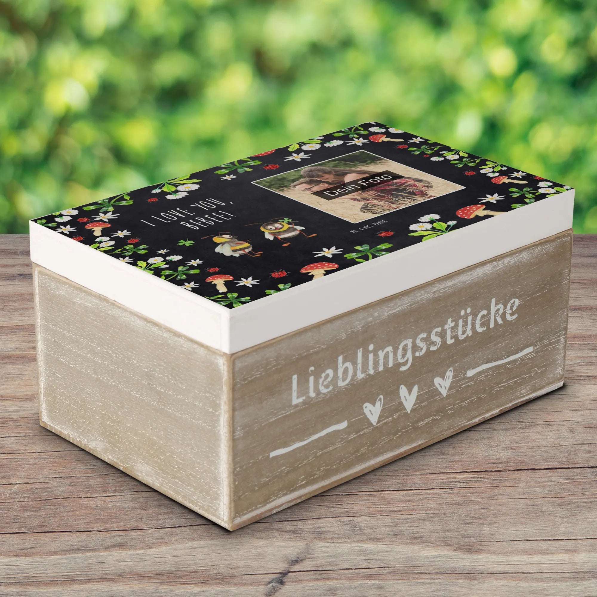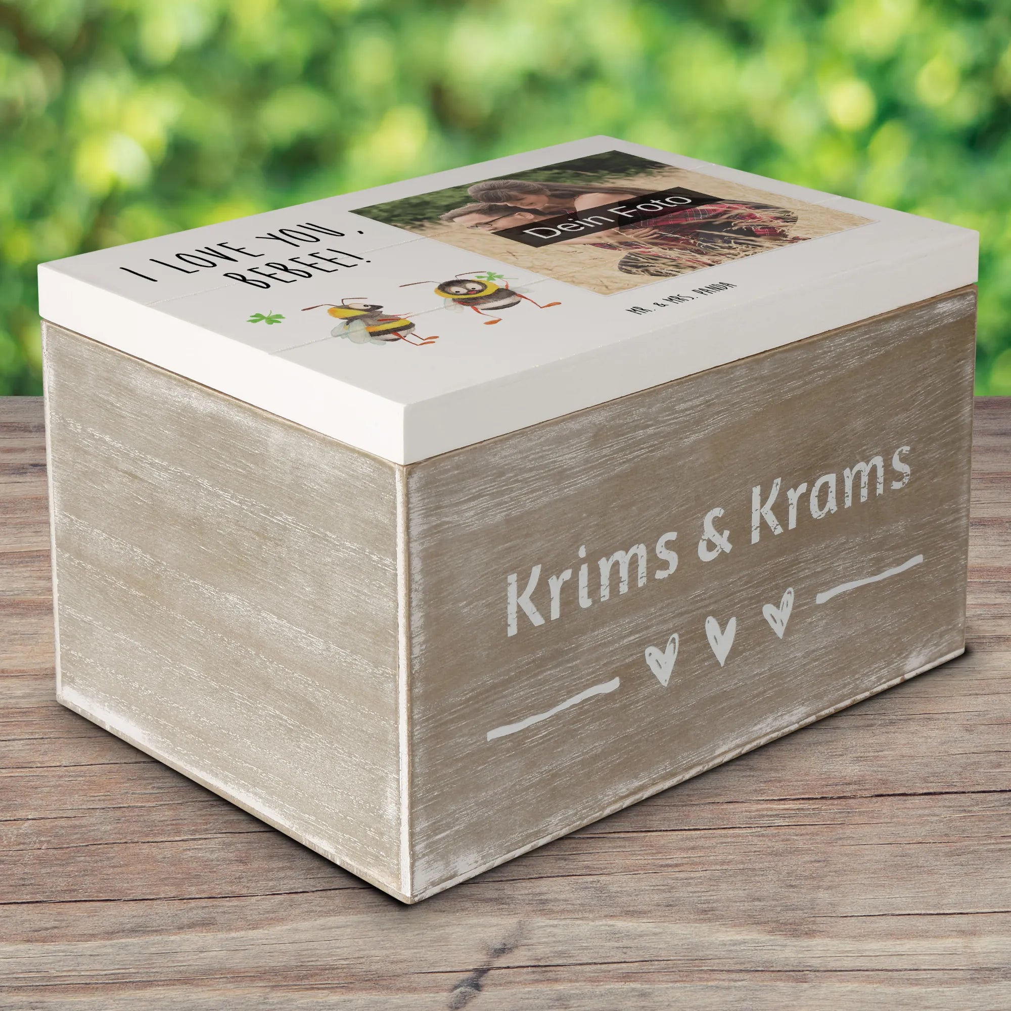 Mit einem wunderschönen Motiv von zwei verliebten Bienen, die voller Leben und Freude strahlen, wird diese Kiste zum absoluten Blickfang. Du kannst sie ganz nach deinen Wünschen gestalten: füge deinen eigenen Text oder ein persönliches Foto hinzu, um deine Emotionen festzuhalten und einen bleibenden Eindruck zu hinterlassen.