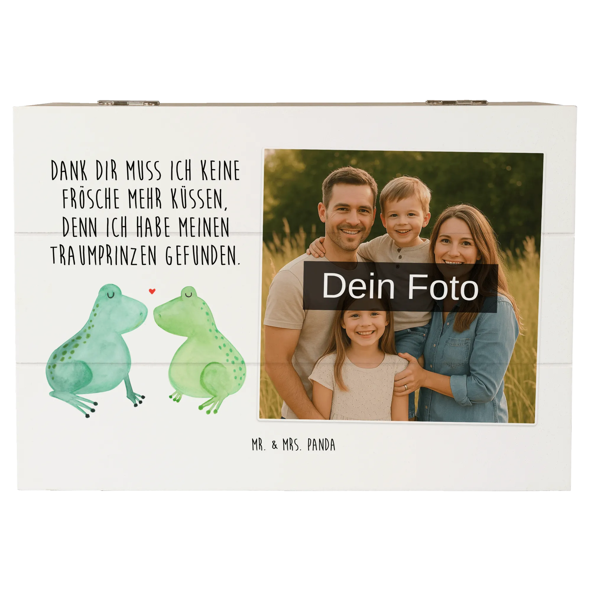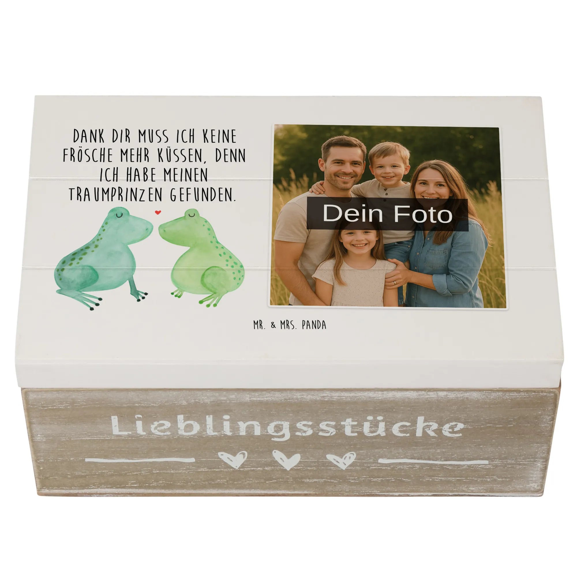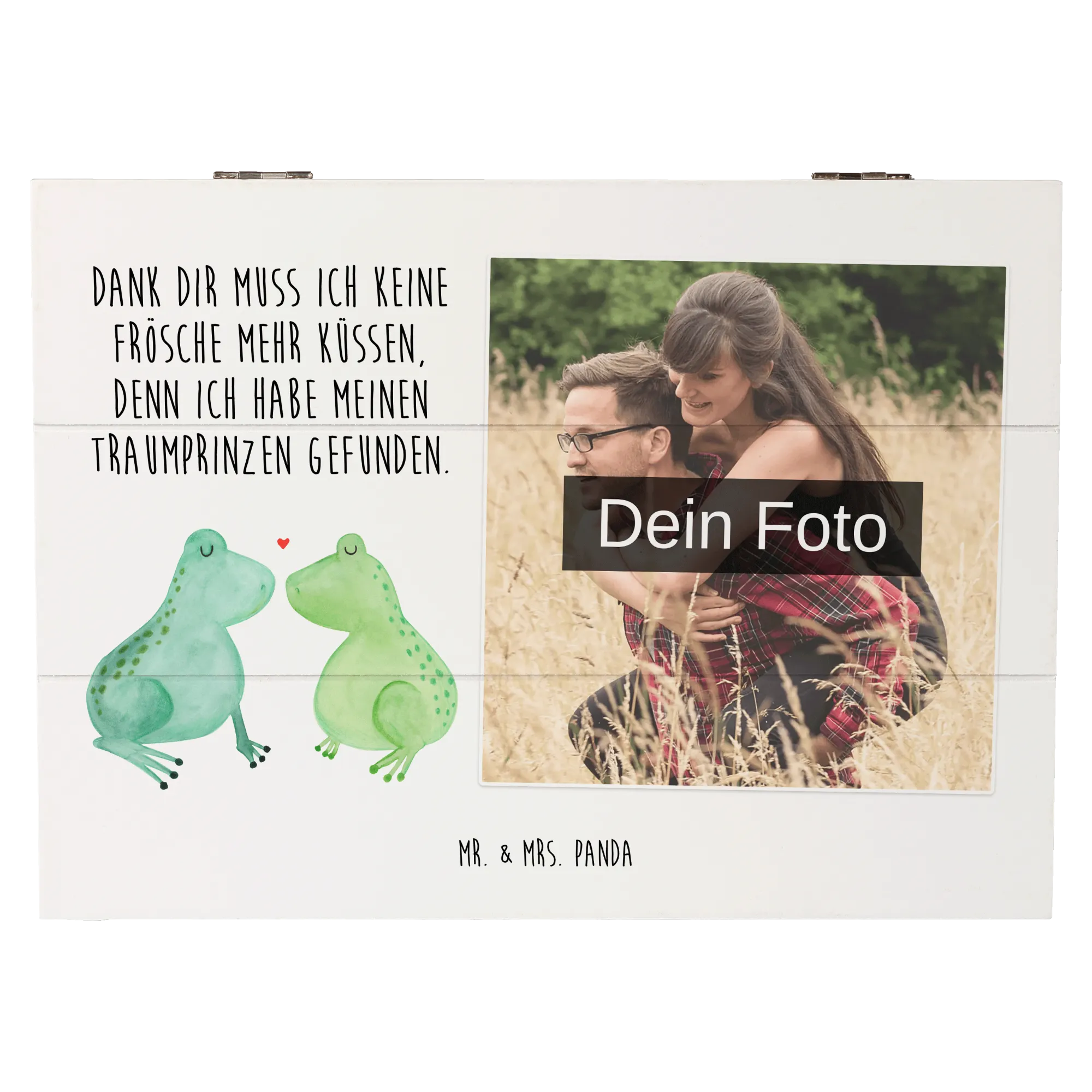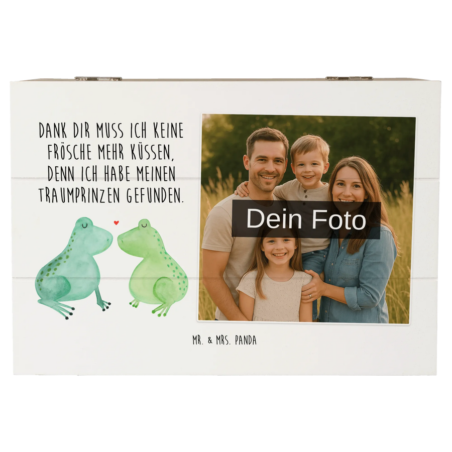 Die personalisierte Foto Holzkiste mit dem zauberhaften Motiv "Frosch Liebe" von Mr. & Mrs. Panda ist das perfekte Geschenk für Verliebte! Egal ob für den Jahrestag, die Verlobung oder einfach nur, um ein Zeichen der Liebe zu setzen - diese Kiste ist ein absoluter Liebesbeweis.