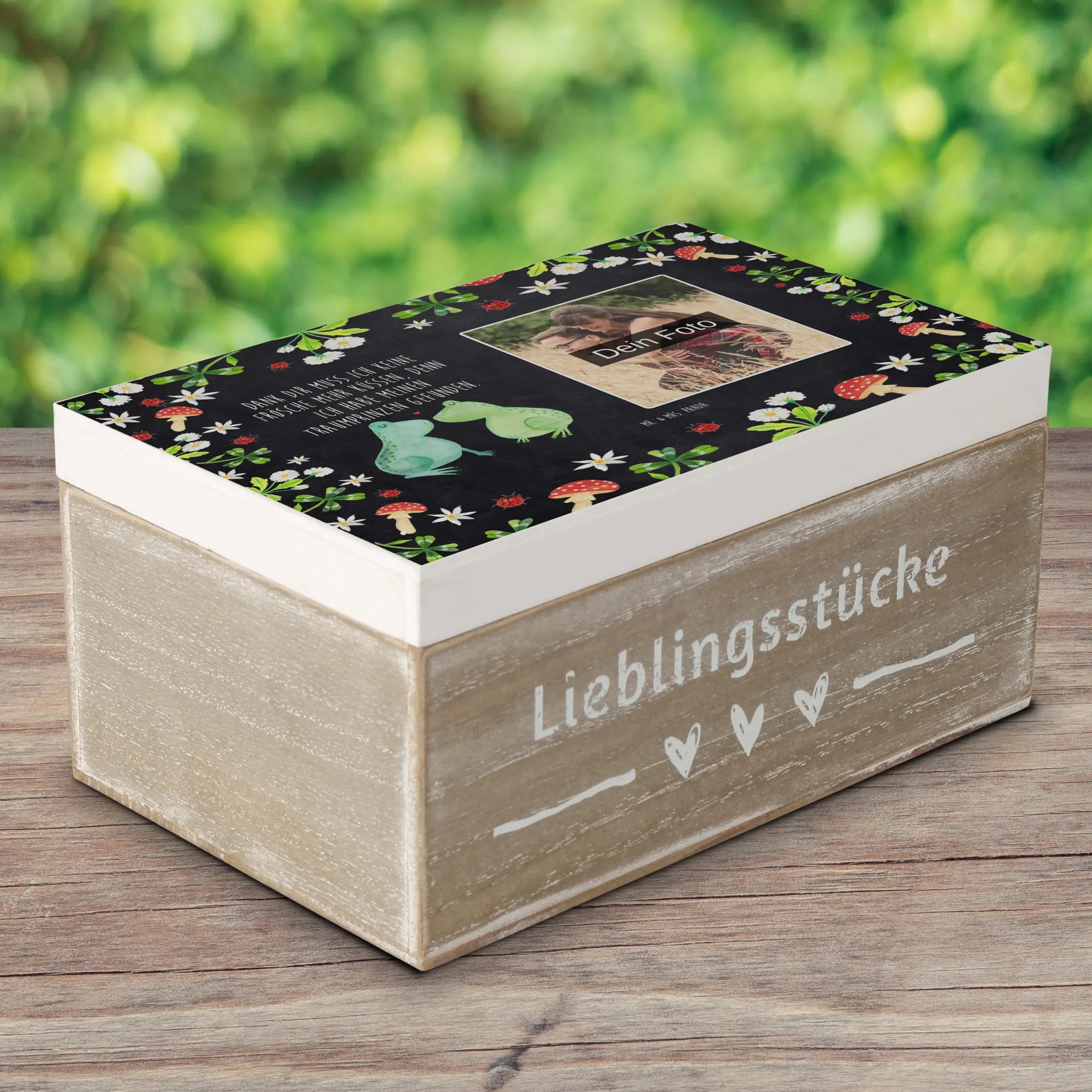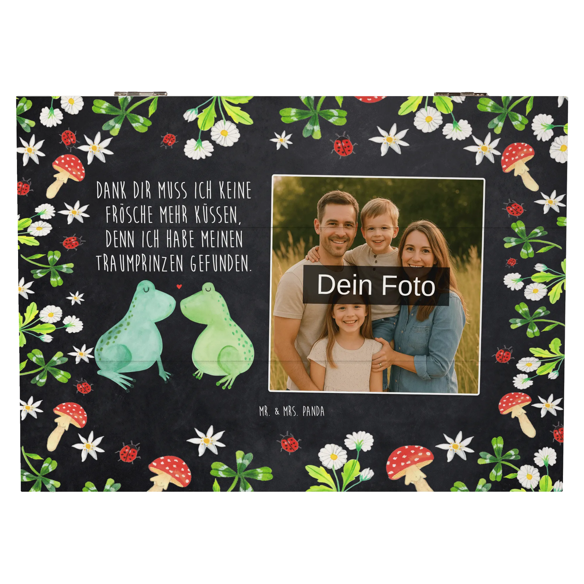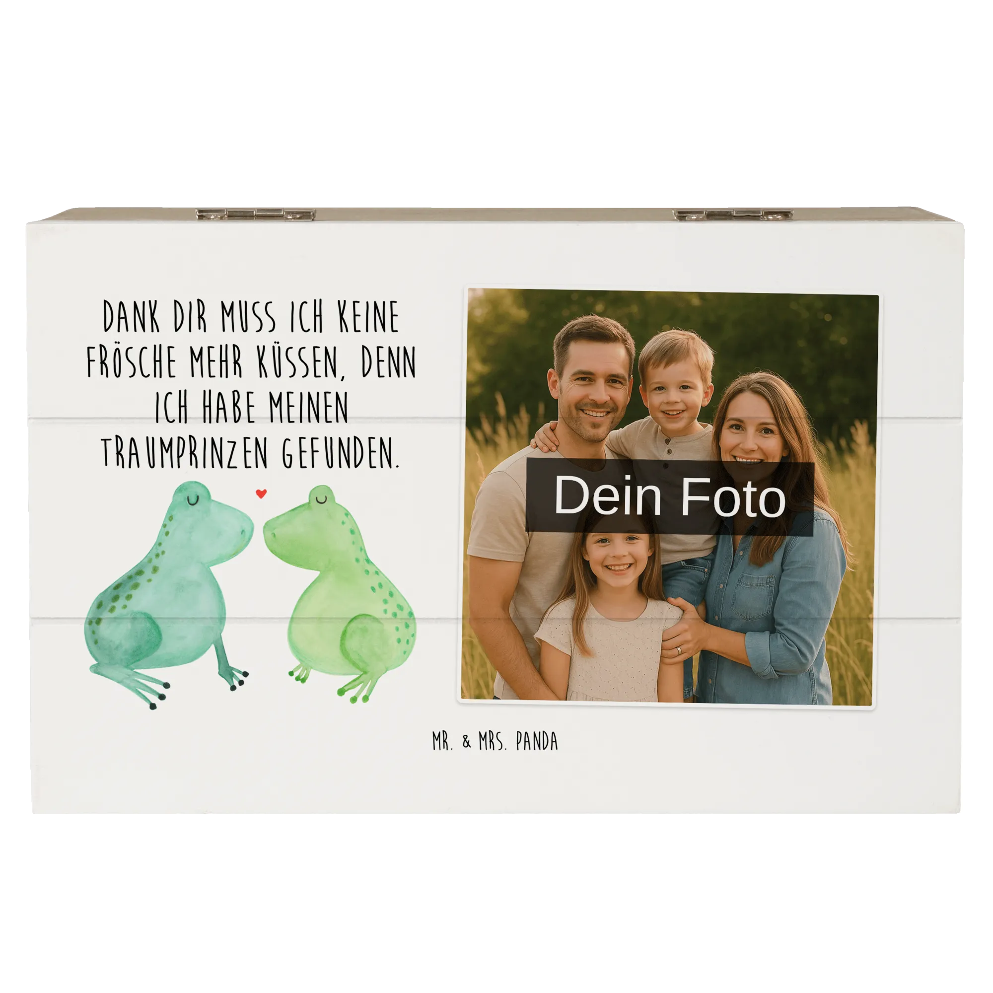 Die personalisierte Foto Holzkiste mit dem zauberhaften Motiv "Frosch Liebe" von Mr. & Mrs. Panda ist das perfekte Geschenk für Verliebte! Egal ob für den Jahrestag, die Verlobung oder einfach nur, um ein Zeichen der Liebe zu setzen - diese Kiste ist ein absoluter Liebesbeweis.