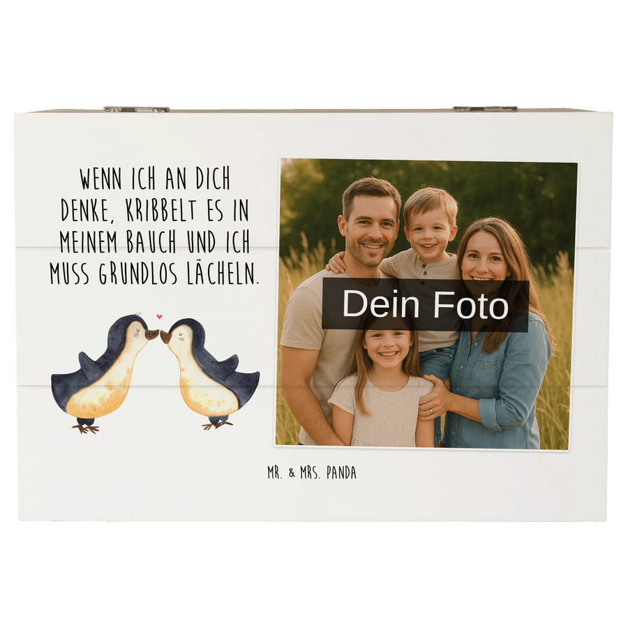 Die personalisierte Foto Holzkiste von Mr. & Mrs. Panda ist das perfekte Geschenk für jeden Anlass, ob zum Valentinstag, Jahrestag oder Hochzeitstag. Mit dem wunderschönen Motiv der Pinguine, die sich zärtlich küssen, versprüht die Kiste Liebe und Zuneigung.