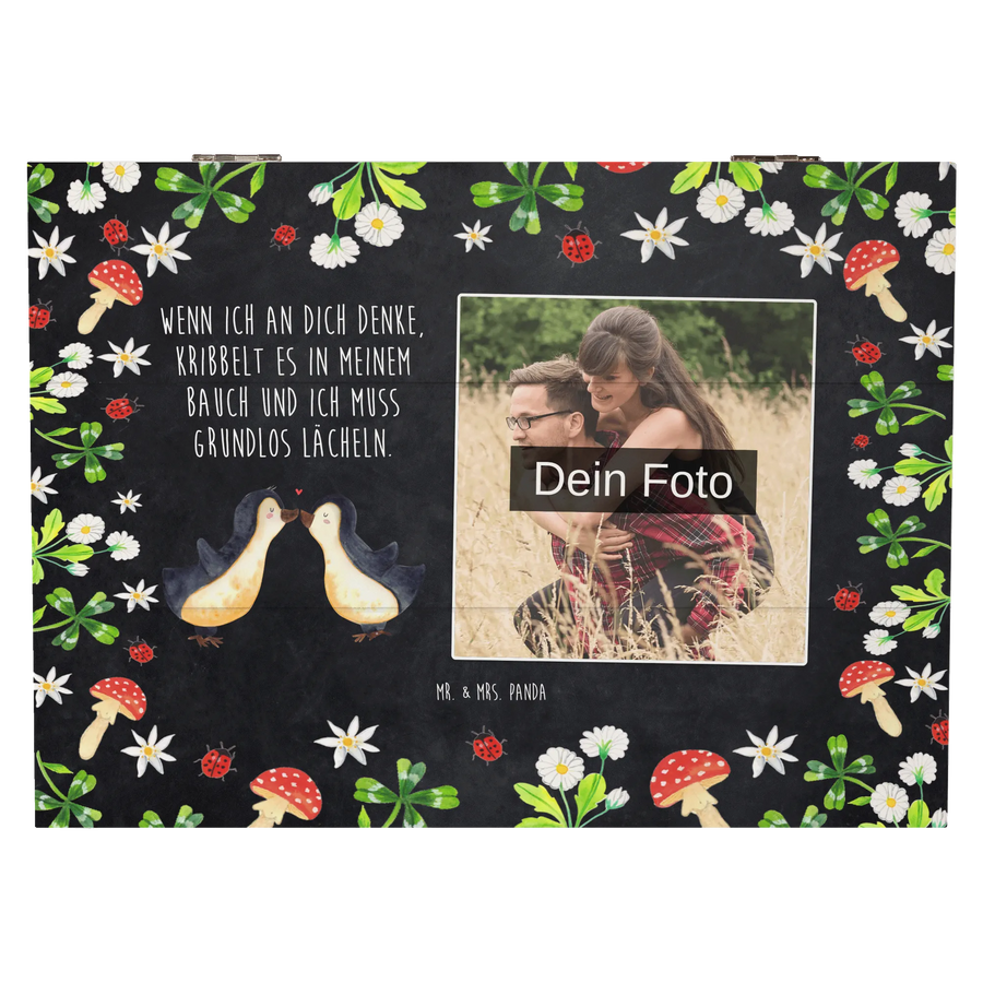 Die personalisierte Foto Holzkiste von Mr. & Mrs. Panda ist das perfekte Geschenk für jeden Anlass, ob zum Valentinstag, Jahrestag oder Hochzeitstag. Mit dem wunderschönen Motiv der Pinguine, die sich zärtlich küssen, versprüht die Kiste Liebe und Zuneigung.