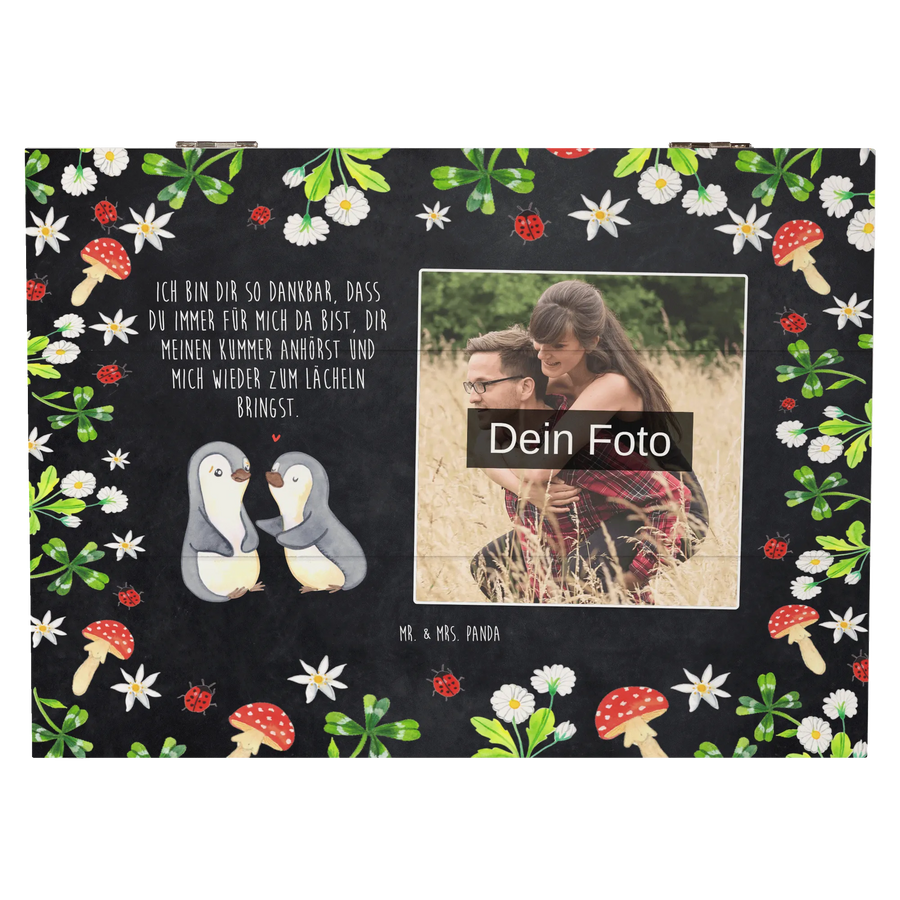 Suchst du nach dem perfekten Geschenk für deine Freundin, deinen Freund oder deinen Partner? Unsere liebevoll designte Foto Holzkiste aus der Liebe-Kollektion von Mr. & Mrs. Panda vereint zärtliche Illustration und persönliche Note. Auf der Kiste schmiegen sich zwei Pinguine zärtlich aneinander und zusammen mit dem Spruch „Ich bin dir so dankbar, dass du immer für mich da bist, dir meinen Kummer anhörst und mich wieder zum Lächeln bringst.“ entsteht ein echter Liebesbeweis. 💕🐧