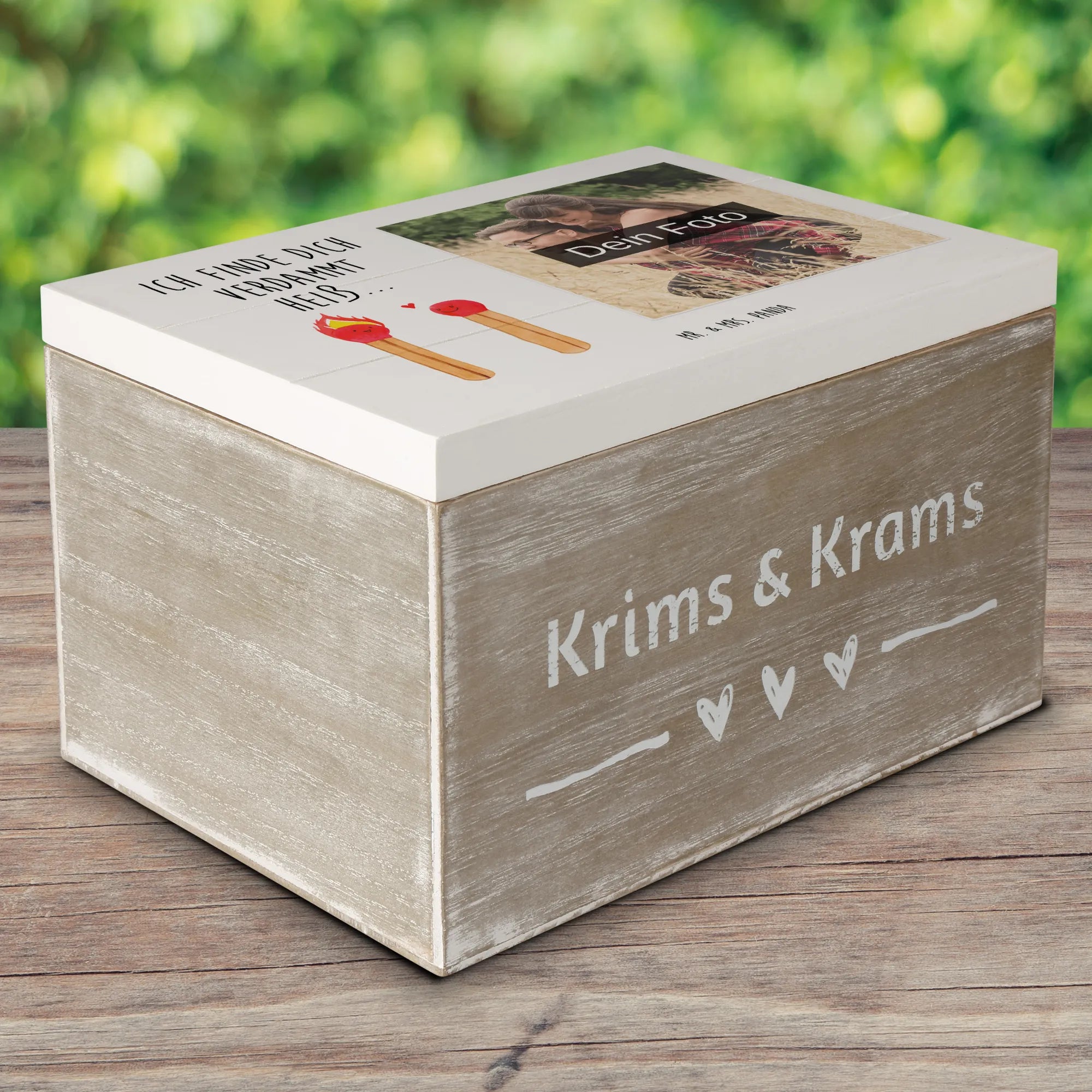 Mit dem süßen Motiv der Streichhölzer, die symbolisch für die Wärme und Leidenschaft der Liebe stehen, ist diese Kiste ein echtes Statement. Der Slogan „Ich finde dich verdammt heiß...“ bringt das besondere Gefühl perfekt zum Ausdruck und zaubert jedem ein Lächeln ins Gesicht.