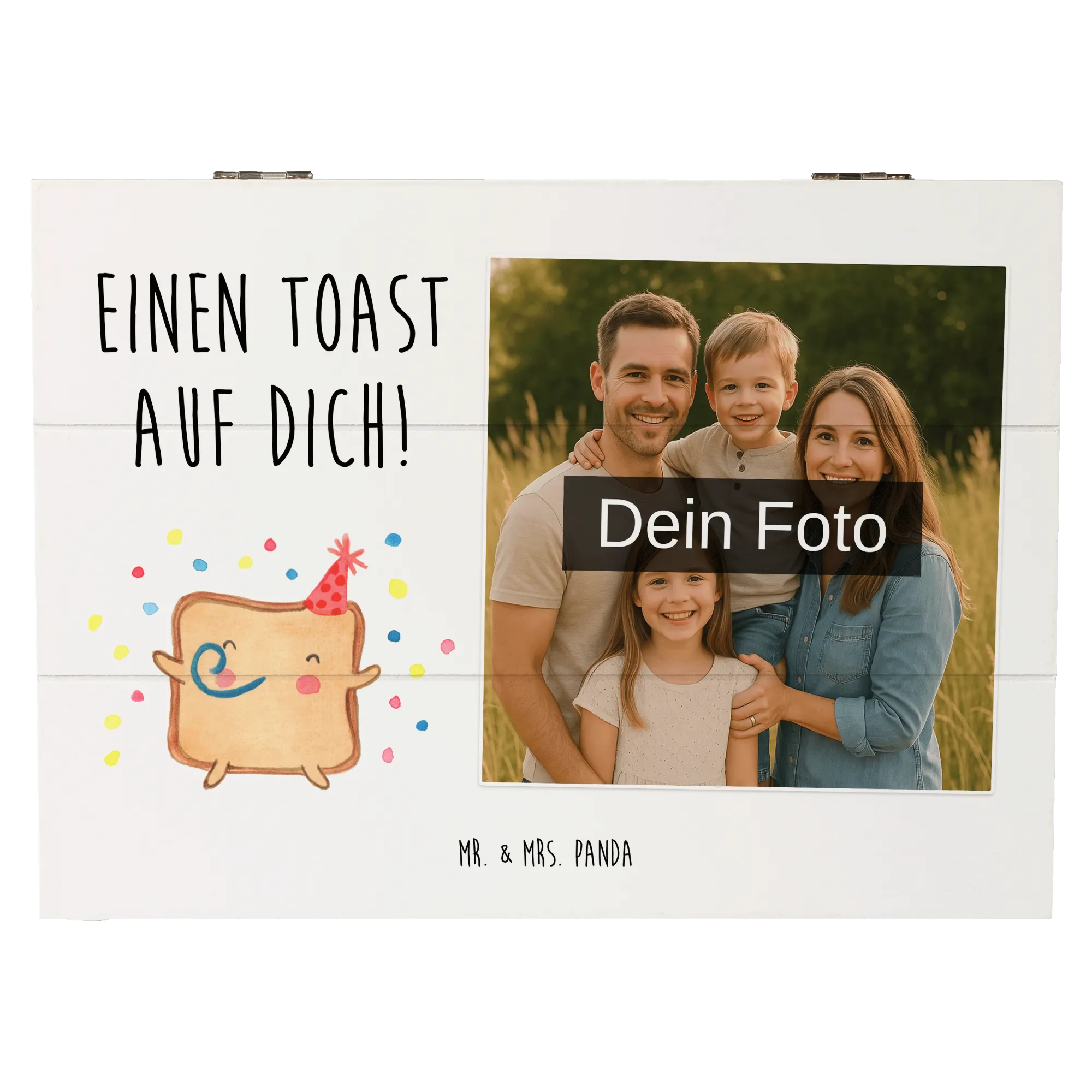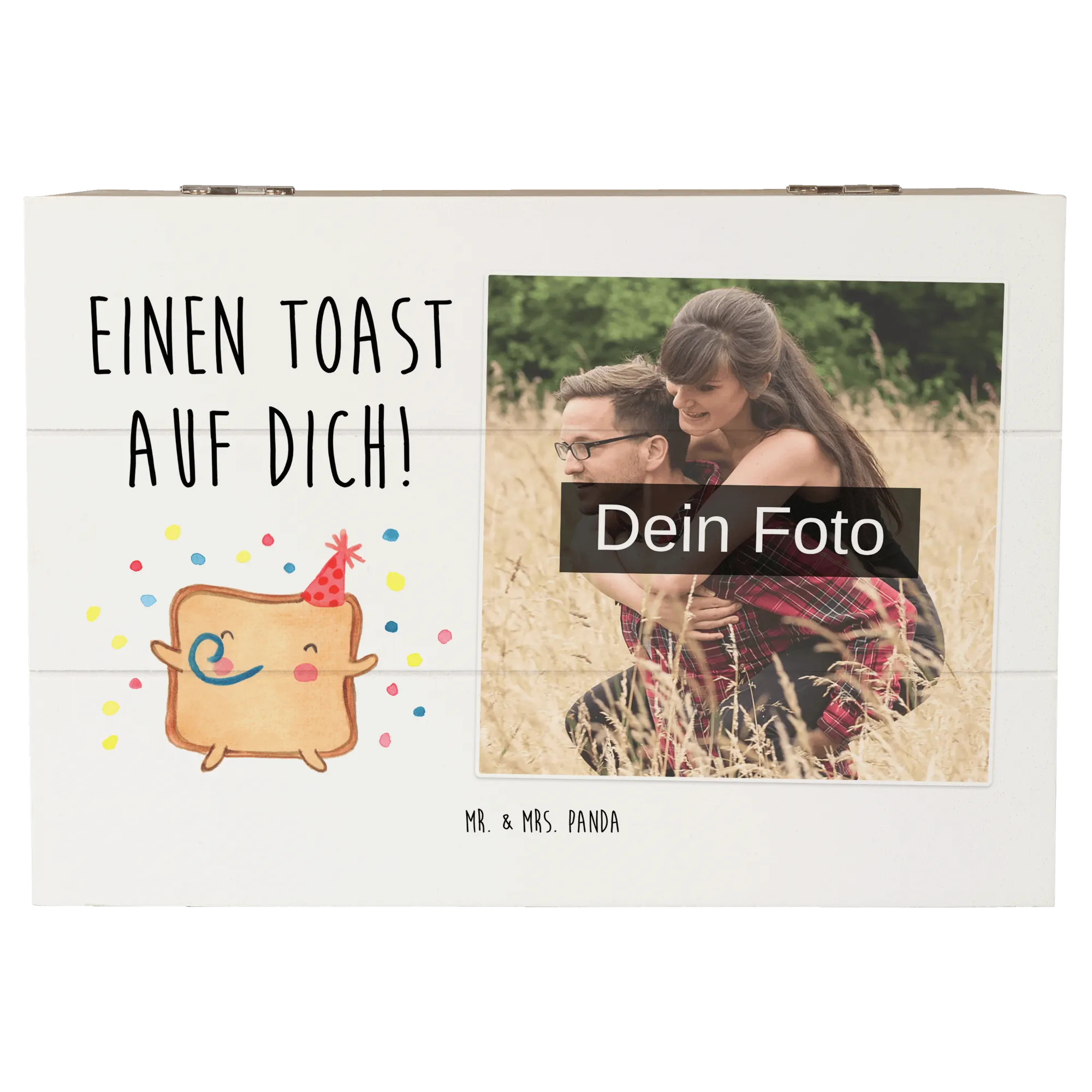 Die personalisierte Foto Holzkiste "Toast Party" von Mr. & Mrs. Panda ist das perfekte Geschenk für all jene, die die Liebe zelebrieren möchten. Egal ob zum Valentinstag, Jahrestag oder Hochzeitstag – diese wunderschöne Holzkiste ist ein einzigartiges Liebesgeschenk, das von Herzen kommt. Mit dem zauberhaften Motiv eines lächelnden Toasts, der einen Partyhut trägt, und dem liebevollen Slogan "Einen Toast auf dich!" bringt sie Freude und Liebe in jedes Zuhause.