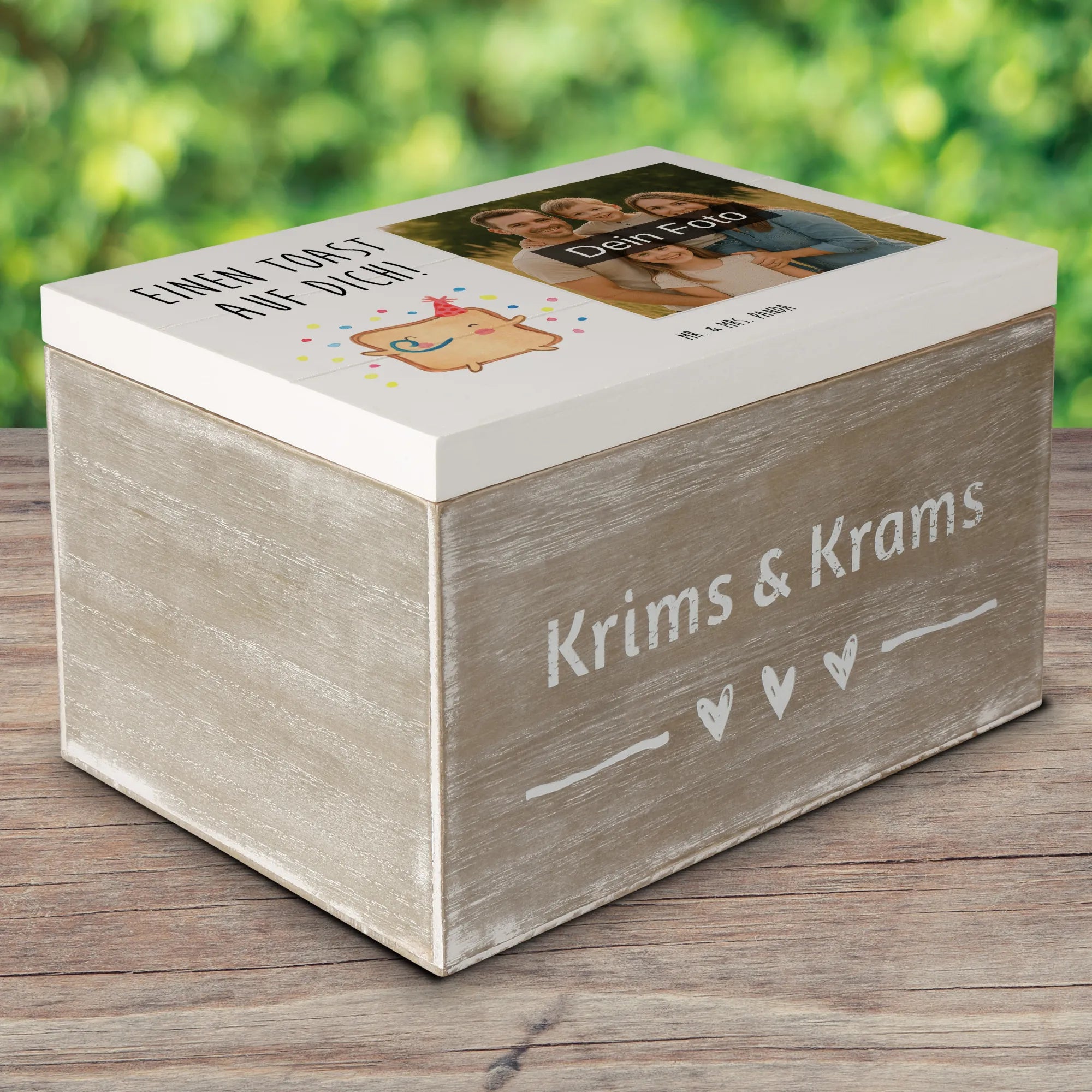 Die Kiste ist nicht nur für Verliebte eine großartige Wahl. Sie ist ideal als nachhaltige und wiederverwendbare Geschenkbox für jeden Anlass: ob Geburtstagsgeschenke für Freunde oder als persönliche Erinnerungskiste für die Kinder zur Kommunion oder Konfirmation. Sie hält all die kleinen Wunder fest, die es im Leben zu sammeln gilt. Also, dir gefällt die Idee, deinen Liebsten eine Freude zu machen? Verschenke die personalisierte Foto Holzkiste "Toast Party" und schenke Freude, die von Herzen kommt! Diese Kiste ist nicht nur ein praktisches Geschenk, sondern auch ein liebevoller Liebesbeweis, der lange in Erinnerung bleibt.