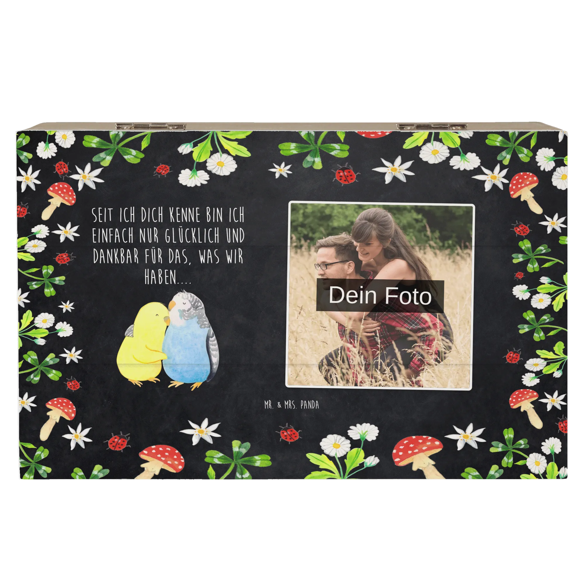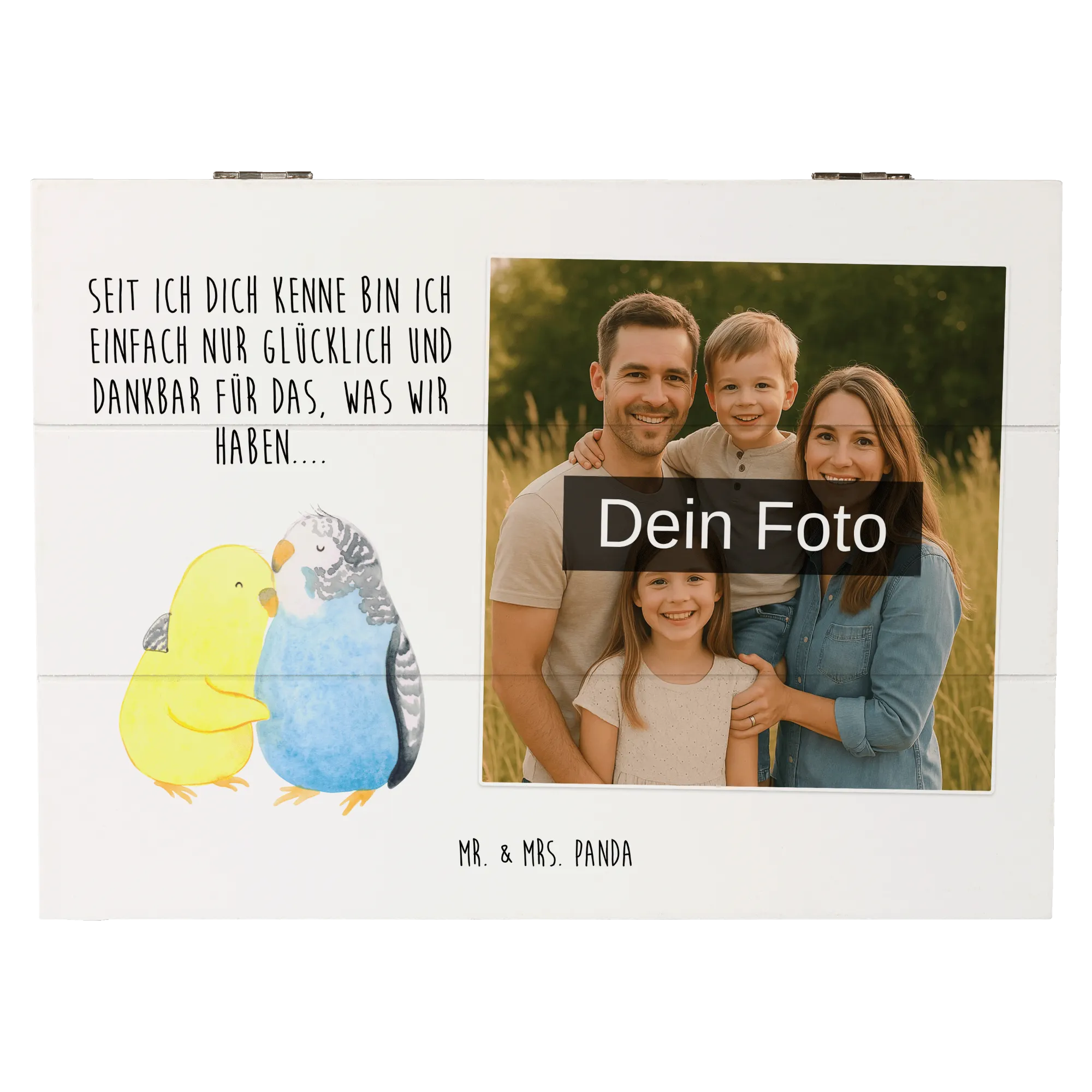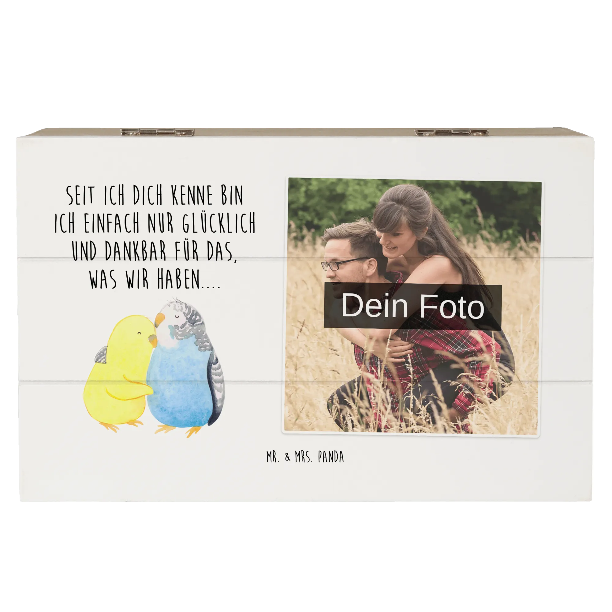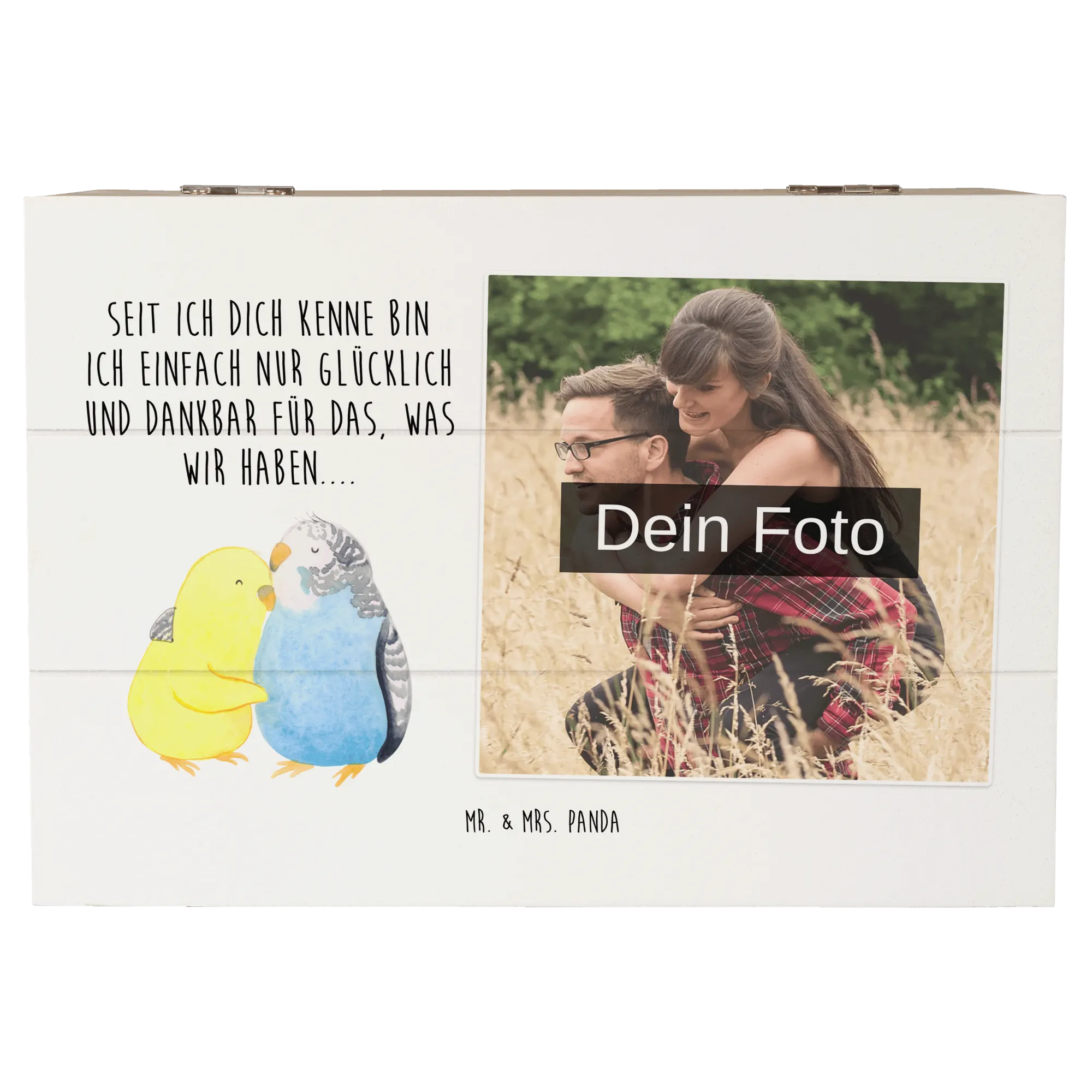 Entdecke die perfekte Möglichkeit, deine liebevollen Erinnerungen stilvoll zu verwahren – mit unserer personalisierten Foto Holzkiste im bezaubernden Design "Wellensittich Liebe" von Mr. & Mrs. Panda!