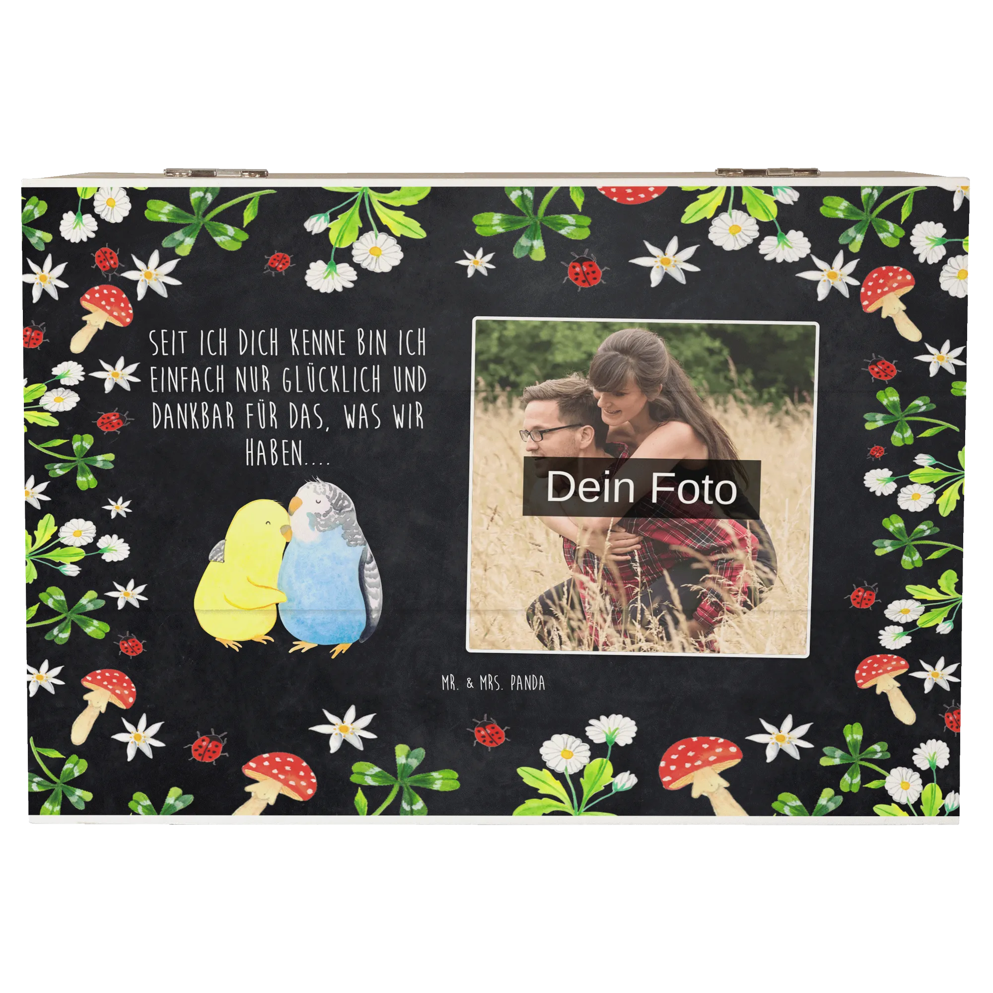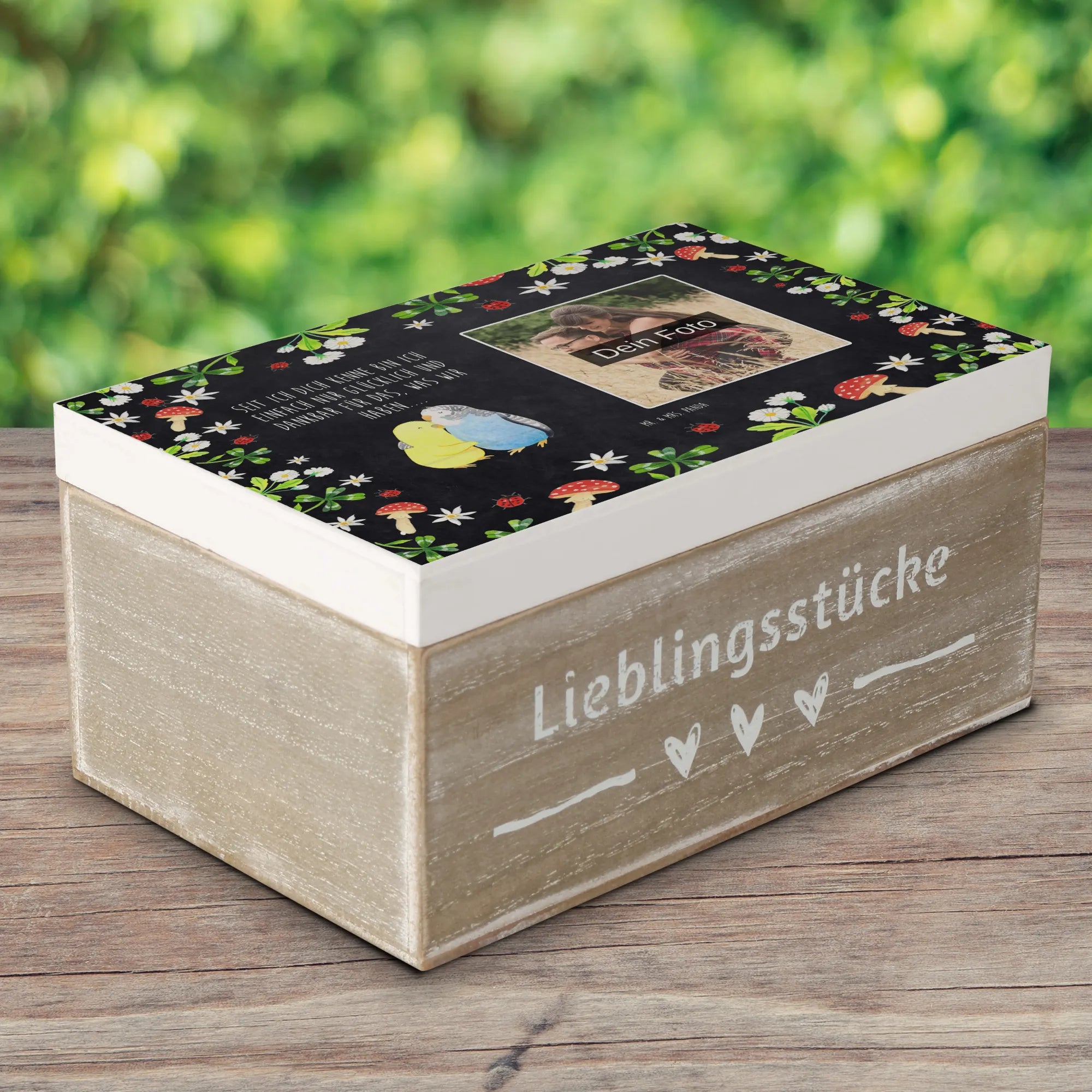 Die personalisierte Foto Holzkiste "Wellensittich Liebe" von Mr. & Mrs. Panda ist der ideale Geschenkartikel für Verliebte und romantische Seelen. Diese wunderschöne Kiste ist nicht nur ein praktischer Aufbewahrungsort für all deine kostbaren Schätze, sondern auch ein liebevolles Andenken an die besonderen Momente deines Lebens.