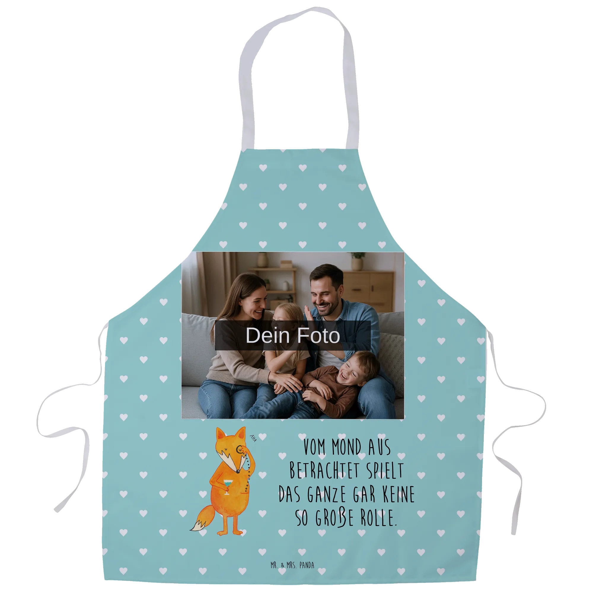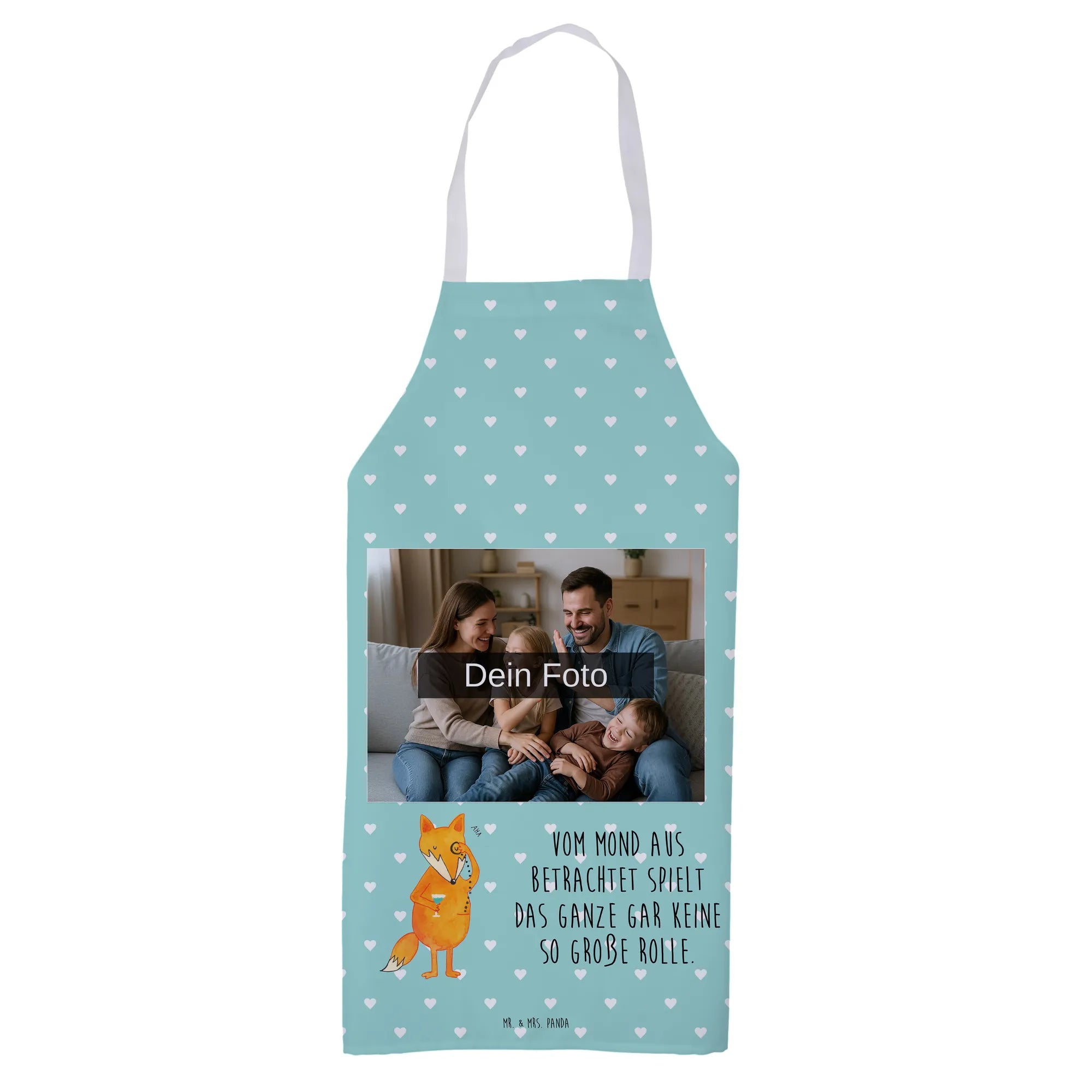 Entdecke die wunderschöne personalisierte Foto Kochschürze von Mr. & Mrs. Panda! Diese Schürze ist nicht nur praktisch, sondern auch ein echter Hingucker in deiner Küche. Hergestellt aus hochwertiger Premium Kunstfaser, misst sie 950 mm x 700 mm und hat zusätzlich eine 950 mm lange Nackenschlaufe. Sie ist mit süßen Motiven und Sprüchen bedruckt, die dein Kochen zu einem Erlebnis machen. Du kannst sie mit deinem ganz persönlichen Wunschfoto individuell gestalten. Achte darauf, dass das hochgeladene Bild in hoher Auflösung vorliegt, damit das Druckergebnis klar und wunderschön ist. Stelle sicher, dass der Bildausschnitt gut gewählt ist, damit alle wichtigen Details sichtbar bleiben. Wenn Personen auf dem Foto zu sehen sind, lade nur Bilder hoch, bei denen du die Rechte besitzt. Die Schürze verfügt über stabile Nackenschlaufen und Seitenbänder, um den perfekten Sitz zu gewährleisten. Sie ist samtweich, atmungsaktiv und hat eine praktische große Fronttasche. Nach dem Kochen kannst du sie einfach bei 30°C in der Maschine waschen. Verwöhne dich oder deine liebsten Menschen mit einem persönlich gestalteten Geschenk, das sowohl praktisch als auch einzigartig ist!