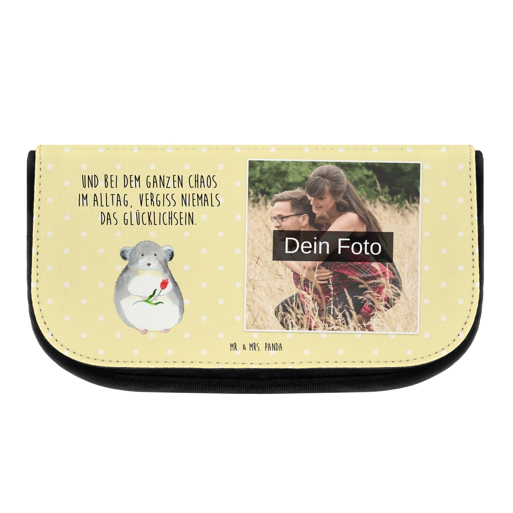 Mach deine Kosmetiktasche einmalig mit der personalisierten Foto Kosmetiktasche von Mr. & Mrs. Panda! Mit den Maßen 220 mm x 130 mm x 70 mm bietet sie genug Platz für deine Beauty-Artikel und mehr. Hochwertig bedruckt mit süßen Mr. & Mrs. Panda Motiven, wird deine Tasche durch dein persönliches Foto zum echten Unikat. Achte darauf, dass dein Bild in hoher Auflösung vorliegt, um ein schönes Druckergebnis zu erzielen. Stelle sicher, dass du die Rechte an allen Bildern besitzt, insbesondere bei Fotos mit Personen. Die Tasche hat praktische, getrennte Fächer für deine Kosmetik, und mit dem sicheren Reißverschluss bleibt alles bestens verstaut. Sie ist perfekt für unterwegs und lässt sich mit einem feuchten Tuch einfach reinigen.