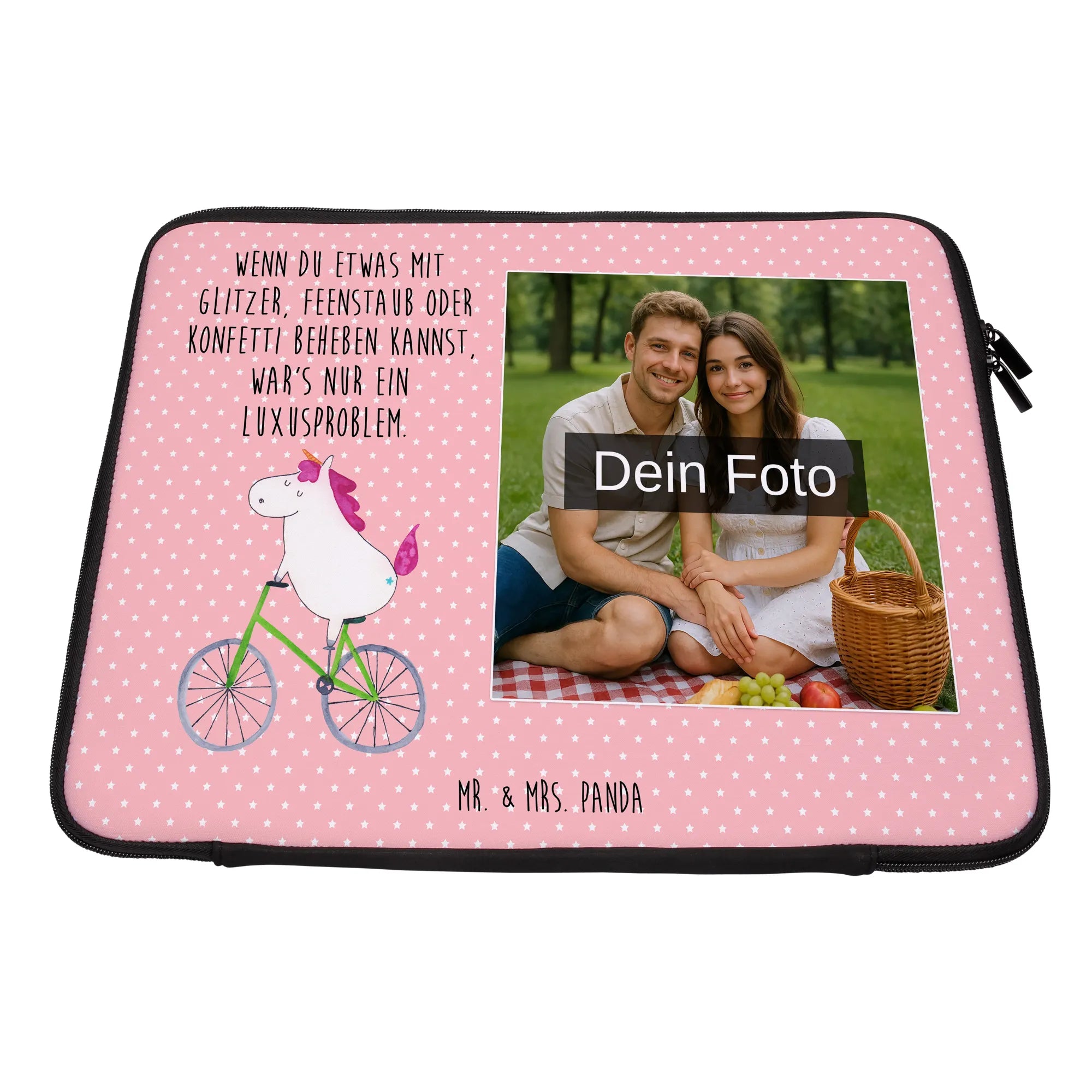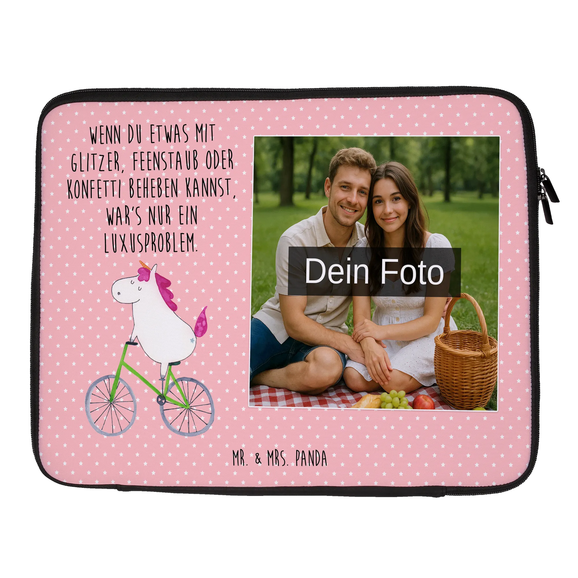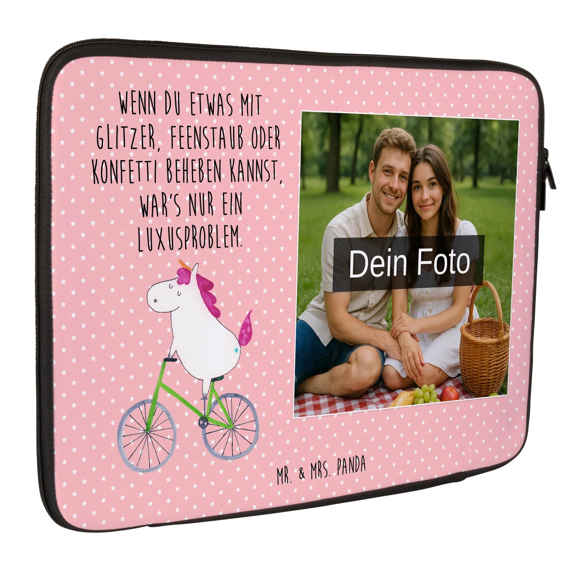 Die personalisierte Foto Notebook Tasche von Mr. & Mrs. Panda ist der optimale Schutz für deine elektronischen Geräte! Diese stilvolle und praktische Tasche misst 360 mm x 270 mm x 30 mm und besteht aus wasserabweisendem Neopren. Ihr leichtes Design macht sie perfekt für unterwegs! Die Vorder- und Rückseite sind aufwendig mit entzückenden Motiven und Sprüchen bedruckt. Du kannst die Tasche ganz individuell mit deinem eigenen Foto gestalten. Denke daran, ein Bild in hoher Auflösung hochzuladen, damit das Druckergebnis gestochen scharf ist. Der robuste Reißverschluss sorgt dafür, dass dein Gerät sicher verstaut ist und schnell zugänglich bleibt, während die Tasche gleichzeitig Schutz vor Kratzern, Staub und weiteren Beschädigungen bietet. Pflege sie ganz einfach mit einem feuchten Tuch — sie sollte nicht in die Waschmaschine! Perfekt für das geschäftige Leben oder als durchdachtes Geschenk für Freunde und Familie! Verleihe deinem Laptop eine persönliche Note mit unserer einzigartigen Tasche, die dich immer begleitet.