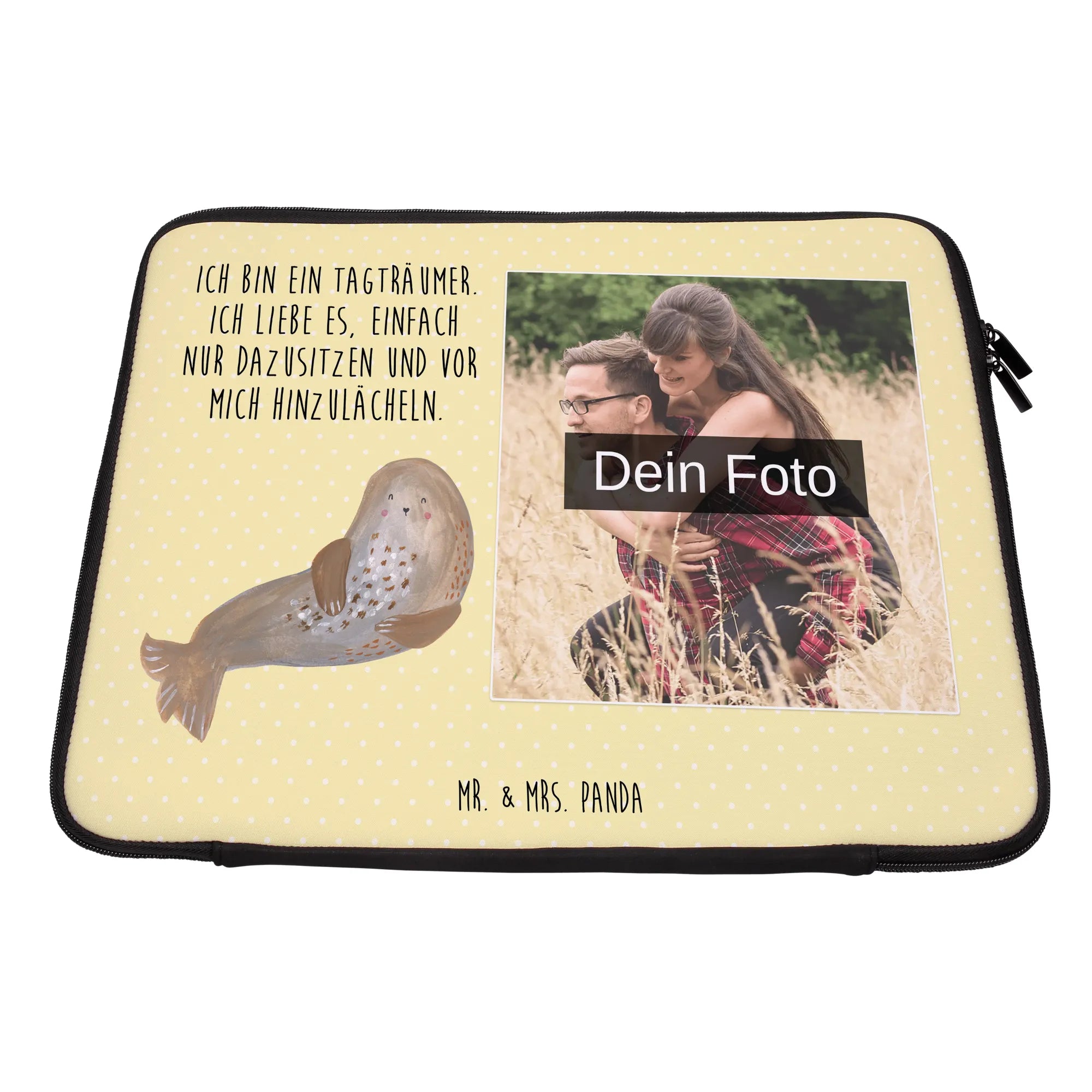 Die personalisierte Foto Notebook Tasche von Mr. & Mrs. Panda ist der optimale Schutz für deine elektronischen Geräte! Diese stilvolle und praktische Tasche misst 360 mm x 270 mm x 30 mm und besteht aus wasserabweisendem Neopren. Ihr leichtes Design macht sie perfekt für unterwegs! Die Vorder- und Rückseite sind aufwendig mit entzückenden Motiven und Sprüchen bedruckt. Du kannst die Tasche ganz individuell mit deinem eigenen Foto gestalten. Denke daran, ein Bild in hoher Auflösung hochzuladen, damit das Druckergebnis gestochen scharf ist. Der robuste Reißverschluss sorgt dafür, dass dein Gerät sicher verstaut ist und schnell zugänglich bleibt, während die Tasche gleichzeitig Schutz vor Kratzern, Staub und weiteren Beschädigungen bietet. Pflege sie ganz einfach mit einem feuchten Tuch — sie sollte nicht in die Waschmaschine! Perfekt für das geschäftige Leben oder als durchdachtes Geschenk für Freunde und Familie! Verleihe deinem Laptop eine persönliche Note mit unserer einzigartigen Tasche, die dich immer begleitet.
