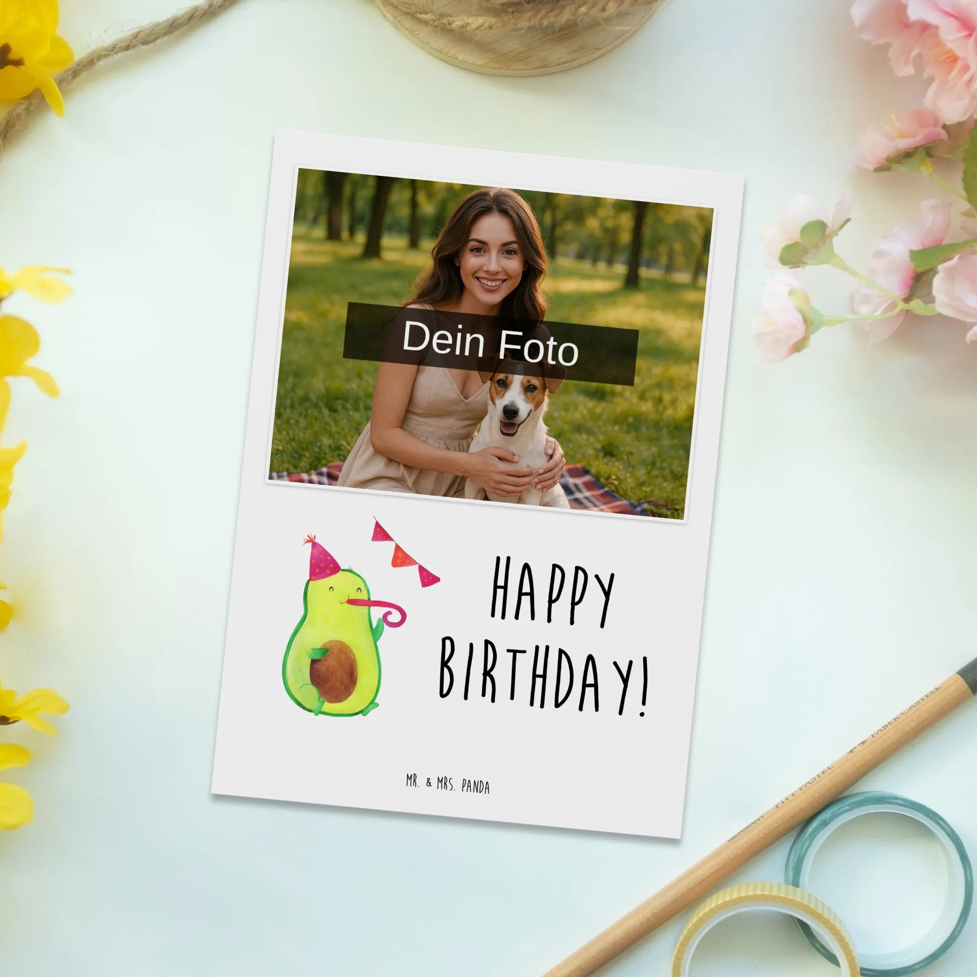 Die personalisierte Foto Postkarte "Avocado Birthday" aus der bezaubernden Avocado Kollektion von Mr. & Mrs. Panda ist das perfekte Geschenk für alle, die Avocados und gute Laune lieben! Mit ihrem einzigartigen Design präsentiert sie eine süße Avocado, die stolz einen Partyhut auf dem Kopf trägt und fröhlich in eine Partypfeife pustet. Diese Postkarte wird nicht nur deine liebevolle Botschaft übermitteln, sondern auch als lebensfrohe Deko in jedem Raum glänzen.