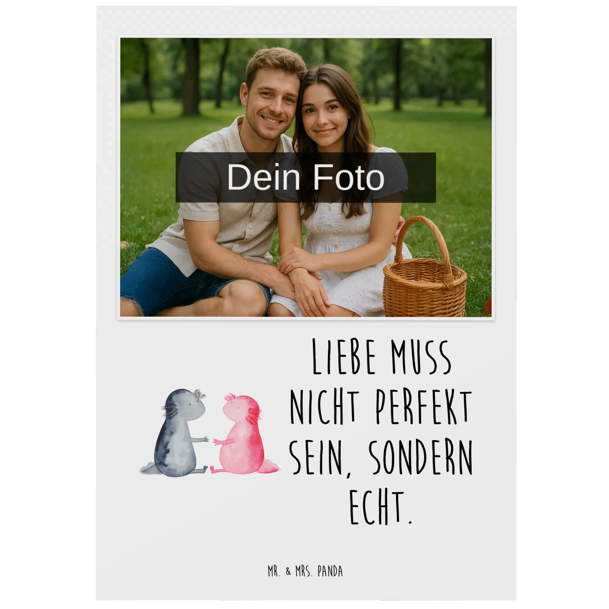 Entdecke die zauberhafte, personalisierte Foto Postkarte mit einem hinreißenden Axolotl-Motiv von Mr. & Mrs. Panda! Diese besondere Postkarte eignet sich perfekt als Geschenk für die große Liebe oder für einen Freund, um Deine Gefühle auszudrücken. Die süßen Axolotl, die sich gegenüber sitzen und Händchen halten, strahlen eine romantische Atmosphäre aus. Mit dem liebevollen Slogan 'Liebe muss nicht perfekt sein, sondern echt' wird jedes Herz erweicht und Du kannst Deine Wertschätzung ganz individuell ausdrücken.