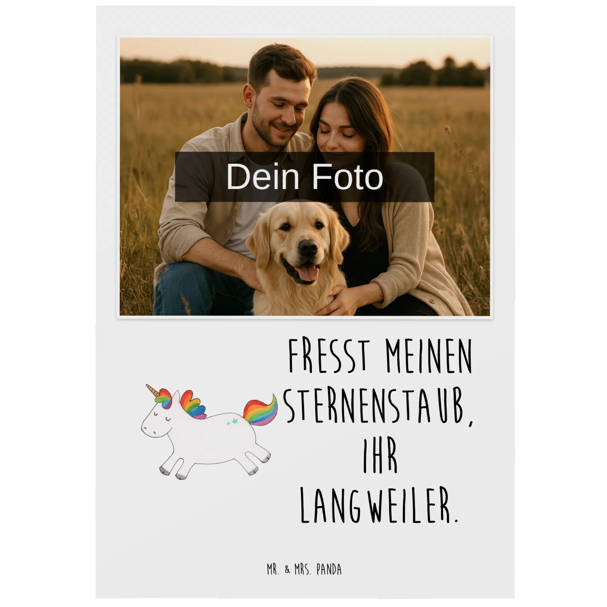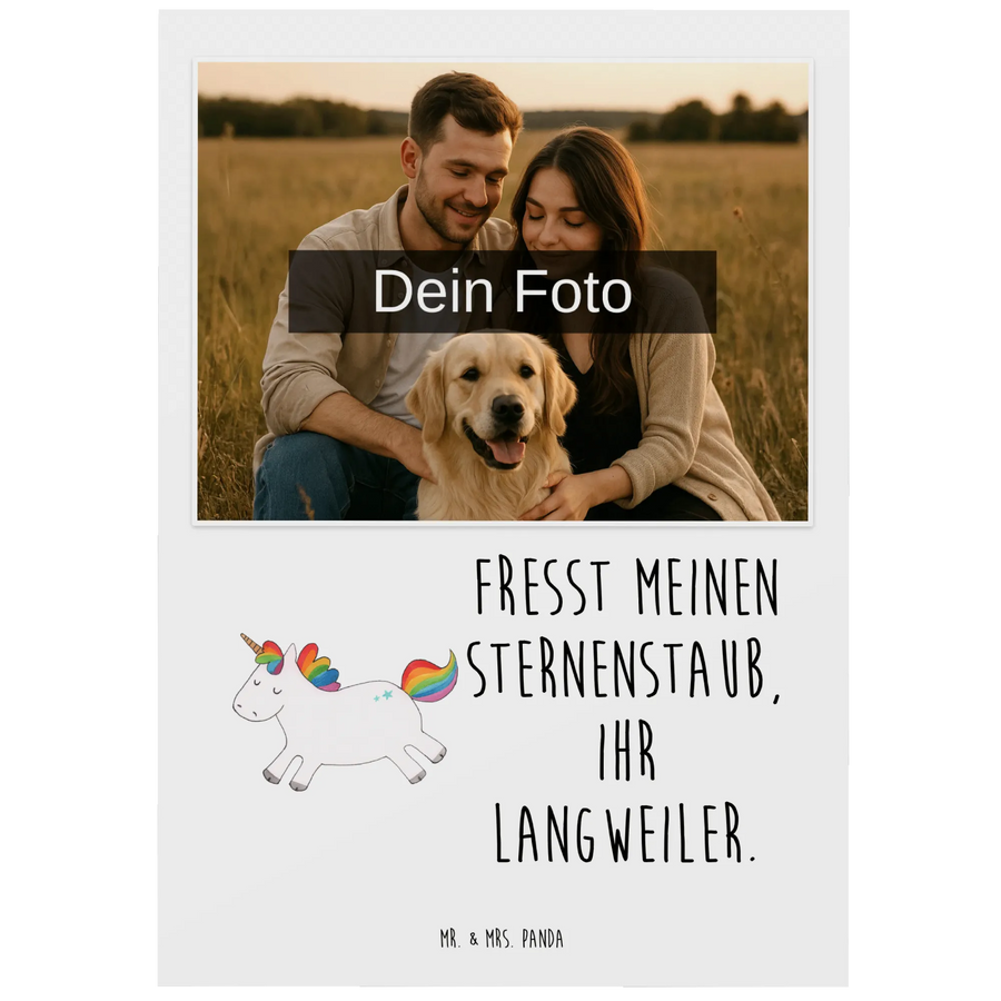 Das süße Einhorn mit seiner bunten Regenbogen-Mähne ist das Symbol für Freude und Lebensfreude. Mit dem witzigen Spruch 'Fresst meinen Sternenstaub, ihr Langweiler.' sorgt es für ein Lächeln und bringt jeden zum Lachen. Ob zum Geburtstag, zur Hochzeit oder als liebevolle Geste zur Taufe – diese personalisierte Postkarte ist ein echter Hingucker und ein ganz persönliches Geschenk.