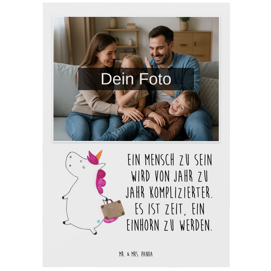 Die personalisierte Foto Postkarte 'Einhorn Koffer' von Mr. & Mrs. Panda ist das perfekte Geschenk für jeden, der ein bisschen Magie in sein Leben bringen möchte! Mit ihrem zauberhaften Einhorn-Motiv und einem hübschen Koffer spricht sie besonders Tierliebhaber und Einhorn-Fans an, sowohl Erwachsene als auch Kinder.