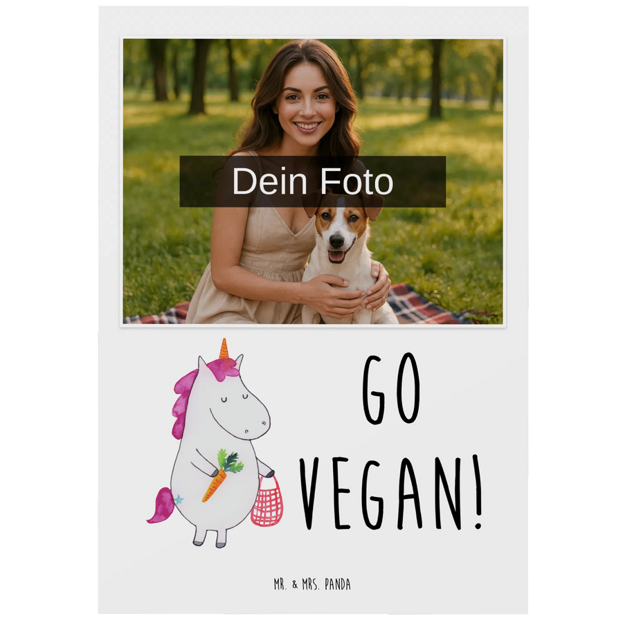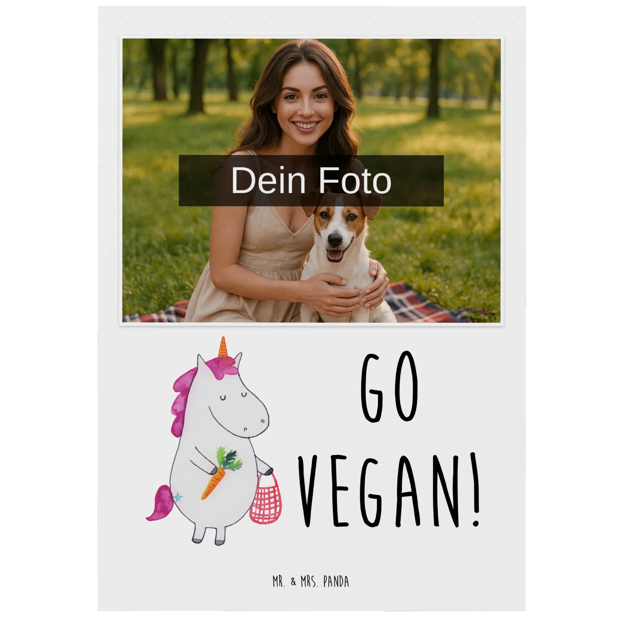 Eine einzigartige personalisierte Foto Postkarte von Mr. & Mrs. Panda, die perfekt für alle Vegan Enthusiasten ist! Das süße Motiv zeigt ein zauberhaftes Einhorn mit einer Einkaufstasche voller leckerer veganer Lebensmittel.