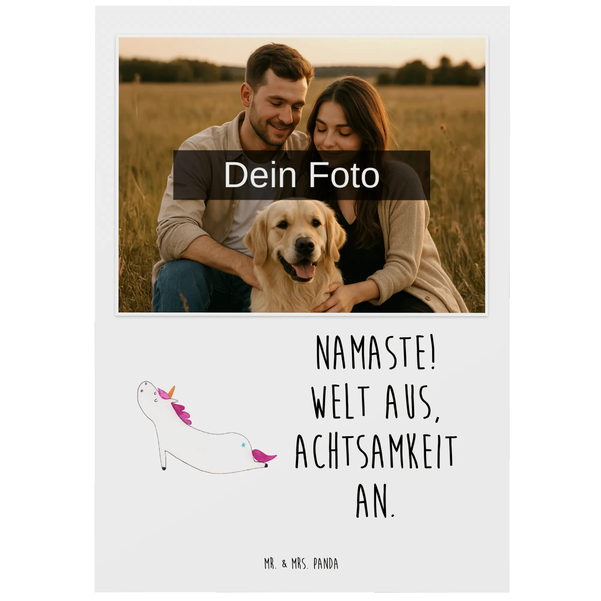 Mit dem witzigen Slogan "Namaste! Welt aus, Achtsamkeit an." bringt das fröhliche Einhorn nicht nur gute Laune, sondern erinnert auch daran, innezuhalten und den Moment zu genießen. Die Postkarte kann ganz nach deinen Wünschen personalisiert werden, indem du dein eigenes Foto hinzufügst – ideal für besondere Anlässe wie Geburtstage, Hochzeiten oder einfach als nette Überraschung.