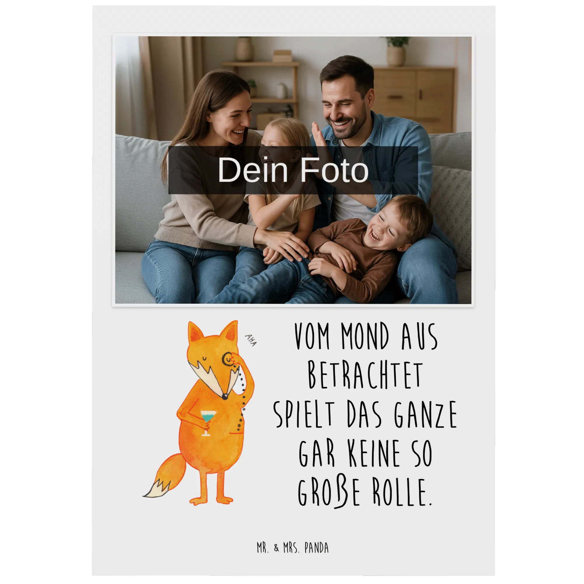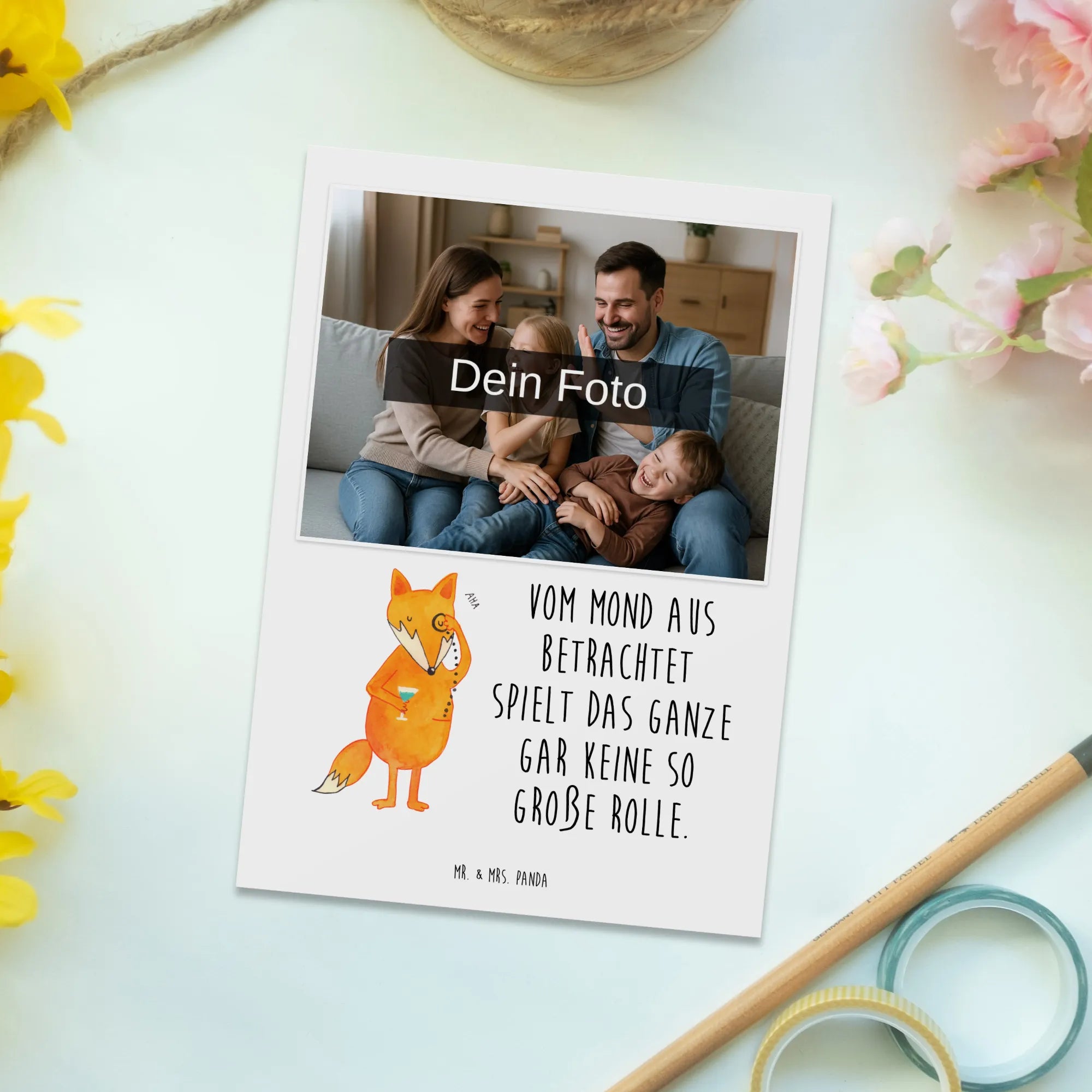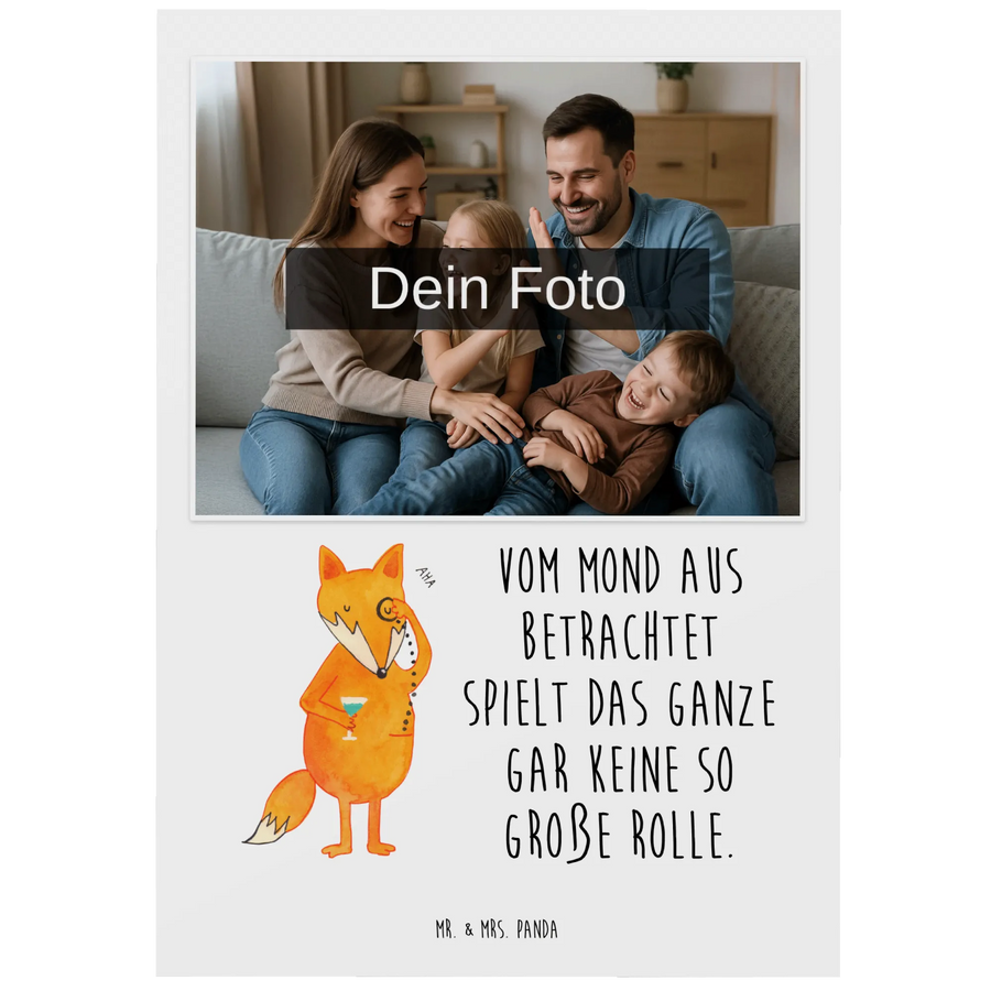 Jede Postkarte wird individuell mit deinem eigenen Foto und einem persönlichen Text gestaltet. Auf der Vorderseite findest du den witzigen Spruch: "Vom Mond aus betrachtet spielt das Ganze gar keine so große Rolle.", der immer ein Lächeln ins Gesicht zaubert. Der stattliche Fuchs mit dem Monokel ist nicht nur niedlich, sondern bringt auch ein wenig Humor in den Alltag.