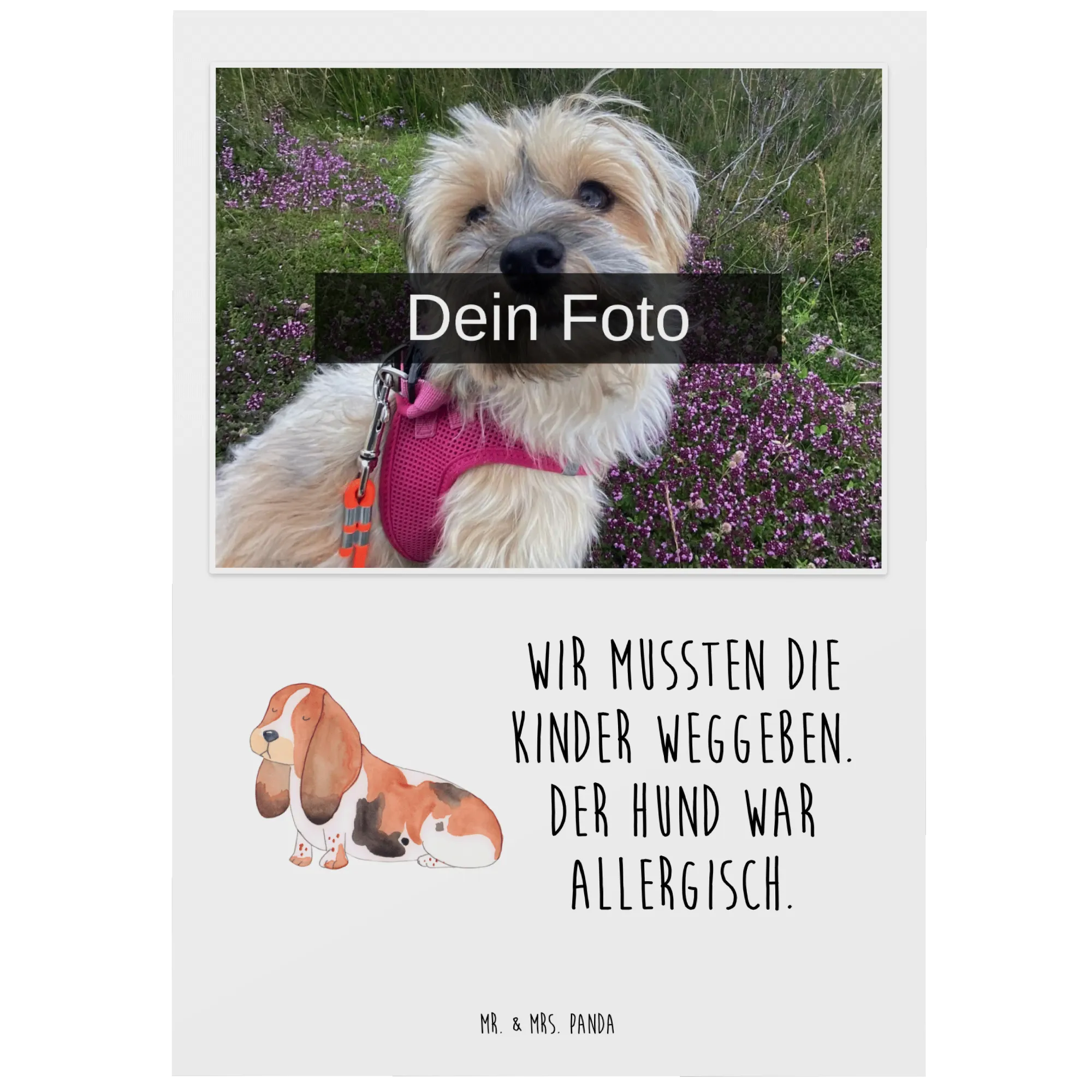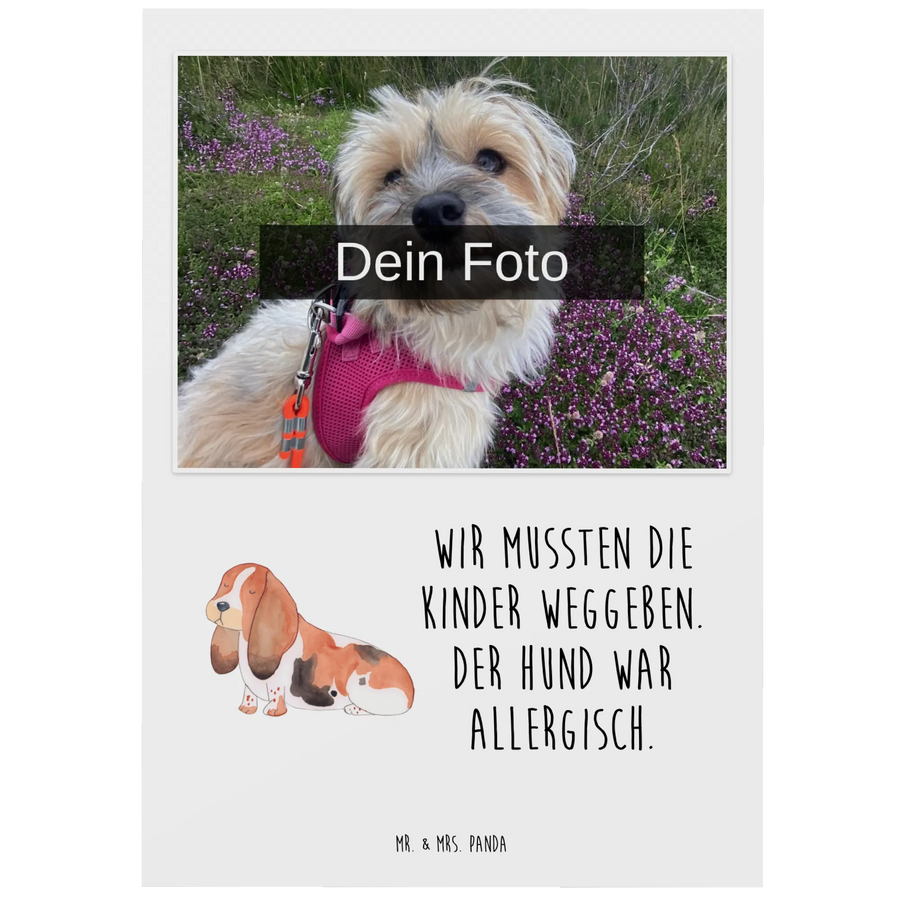 Wenn du auf der Suche nach einem ganz besonderen Geschenk für einen Hundeliebhaber bist, dann ist die personalisierte Foto Postkarte mit dem süßen Basset Hound aus der Hunde Kollektion von Mr. & Mrs. Panda genau das Richtige für dich! Diese einzigartige Postkarte wird mit deinem persönlichen Foto und dem witzigen Spruch "Wir mussten die Kinder weggeben. Der Hund war allergisch." veredelt und bringt nicht nur Freude, sondern auch ein Lächeln auf die Gesichter von Hundebesitzern.