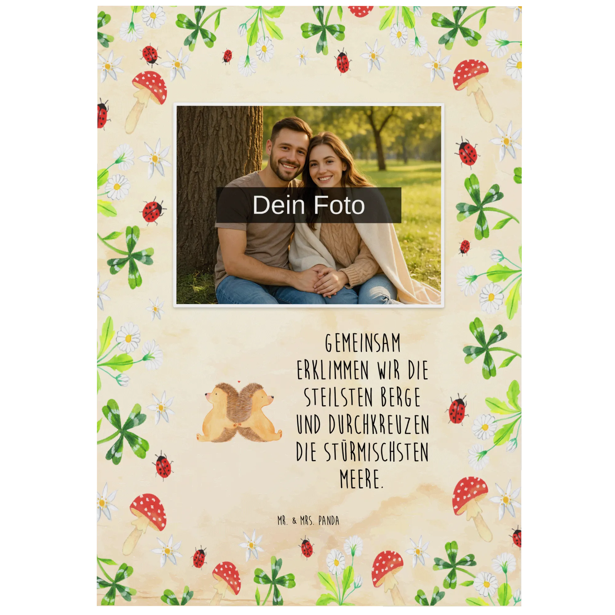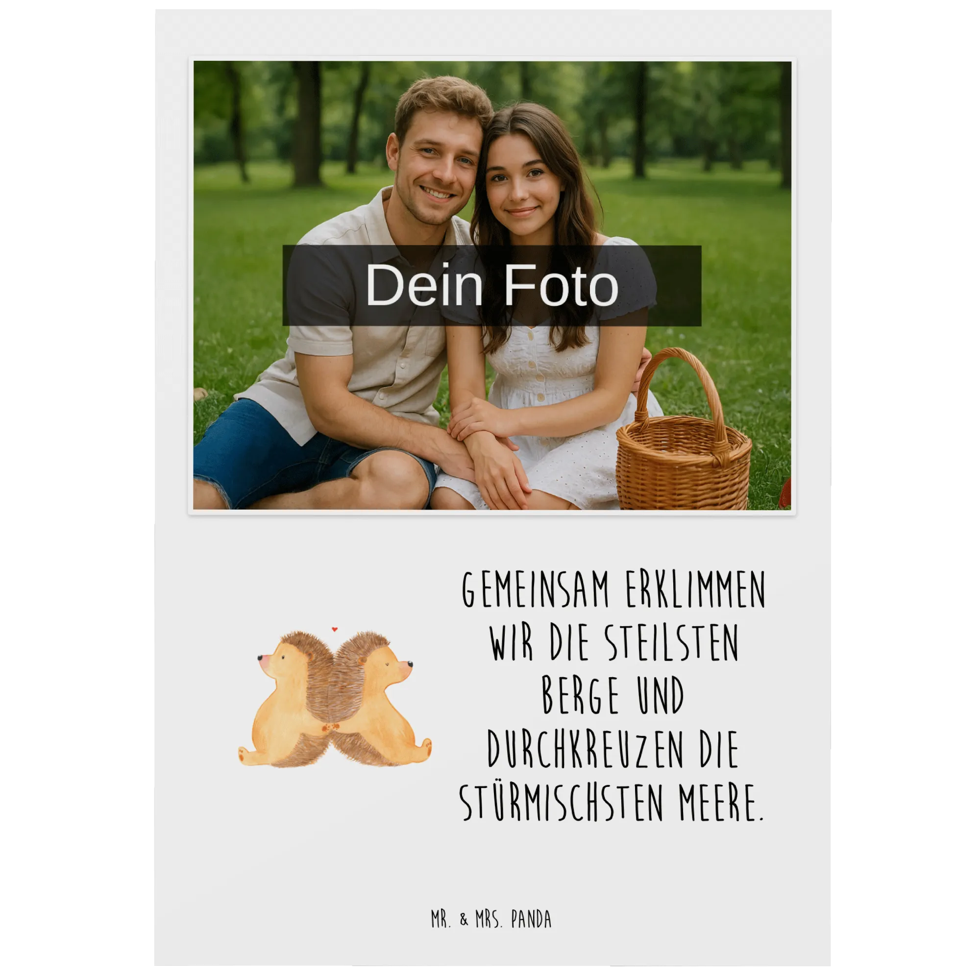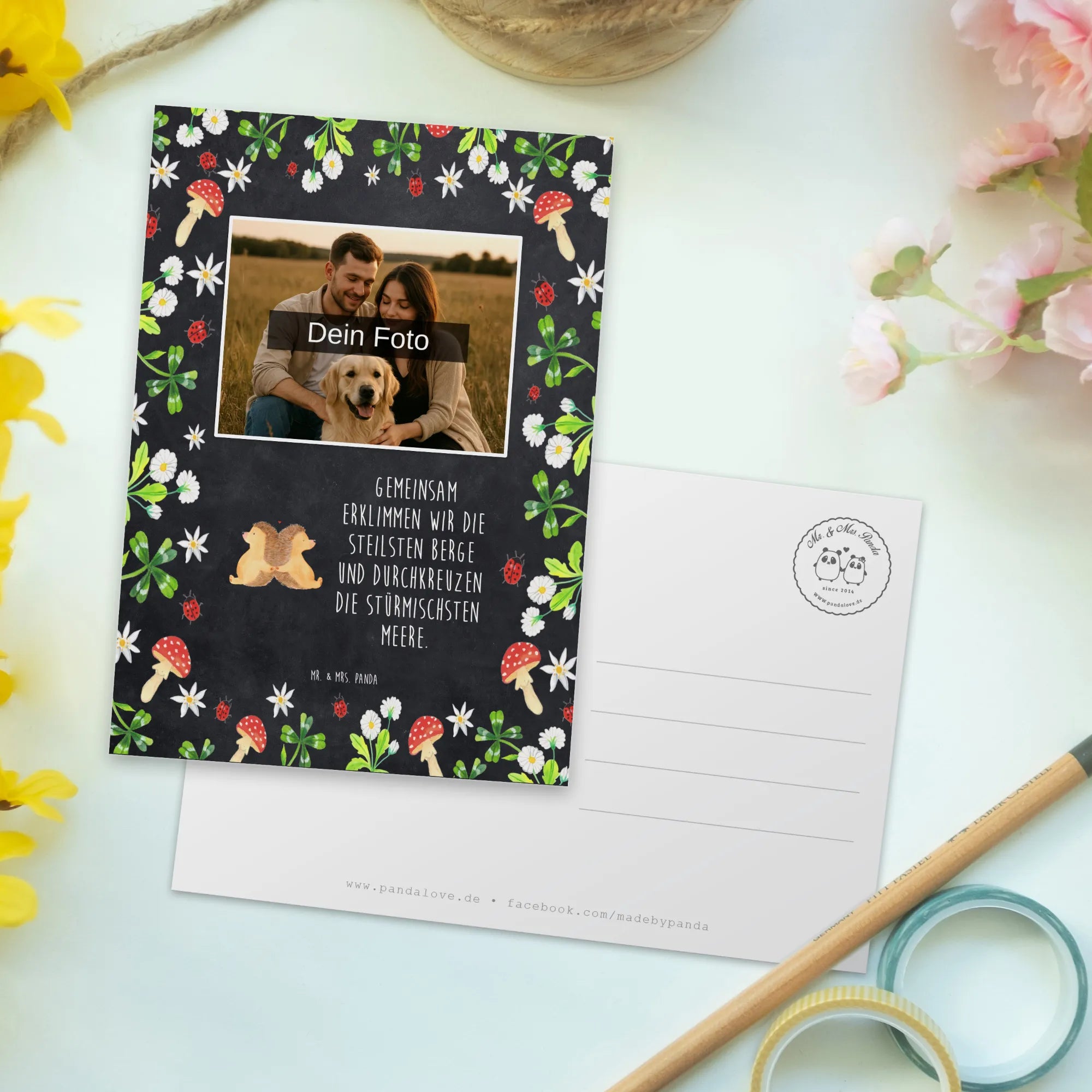 Personalisierte Foto Postkarte „Igel händchenhaltend“ – ein kleines, feines Liebesgeschenk direkt von Mr. & Mrs. Panda. Zwei niedliche Igel halten Händchen, ein rotes Herz schwebt über ihnen und der liebevolle Slogan sagt alles: „Gemeinsam erklimmen wir die steilsten Berge und durchkreuzen die stürmischsten Meere.“ ❤️