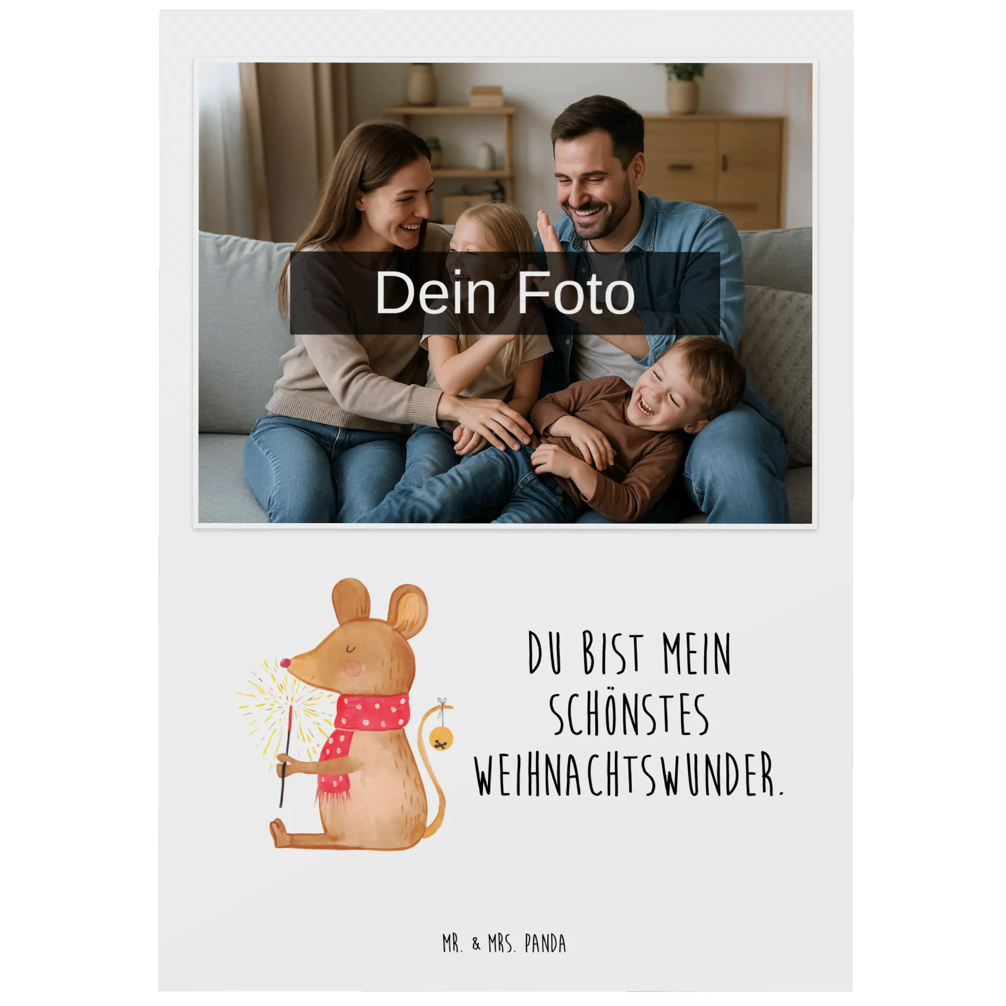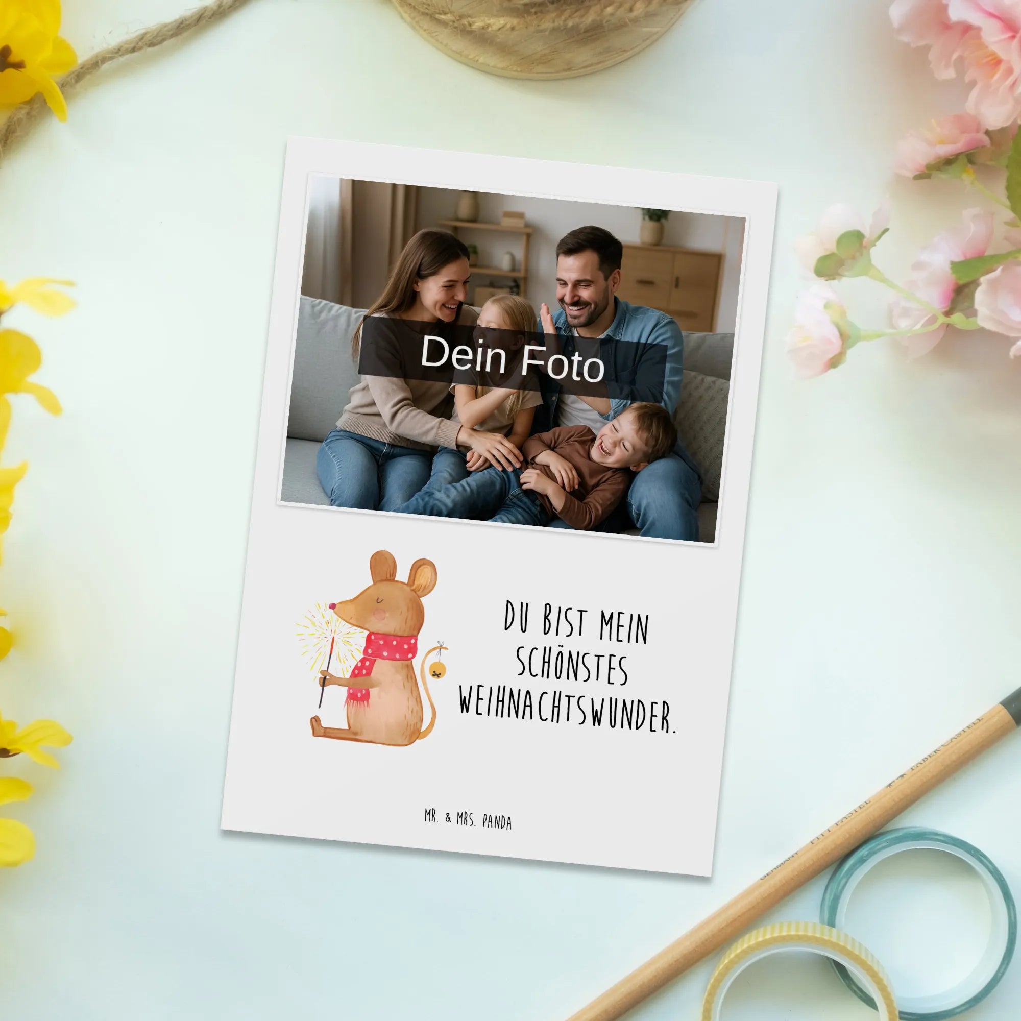 Die personalisierte Foto Postkarte Weihnachtsmaus aus der bezaubernden Winter Kollektion von Mr. & Mrs. Panda ist das perfekte Geschenk für all diejenigen, die die magische Weihnachtszeit lieben! Mit ihrem niedlichen Motiv einer fröhlichen Weihnachtsmaus bringt sie jedes Herz zum Lächeln. Du kannst sie ganz individuell gestalten, indem du dein eigenes Foto und den wunderbaren Spruch "Du bist mein schönstes Weihnachtswunder" hinzufügst. So wird diese Postkarte zu etwas ganz Besonderem, das deinen Liebsten zeigt, wie wichtig sie dir sind.