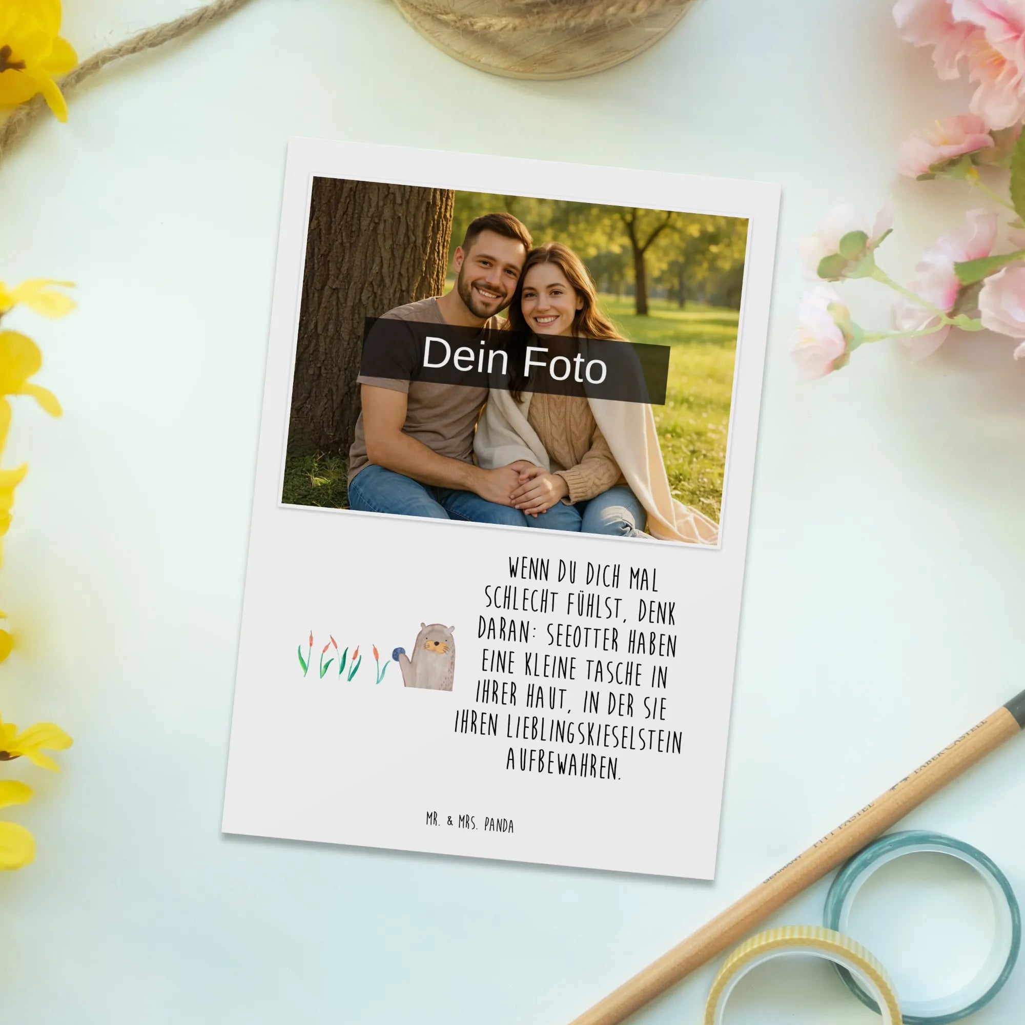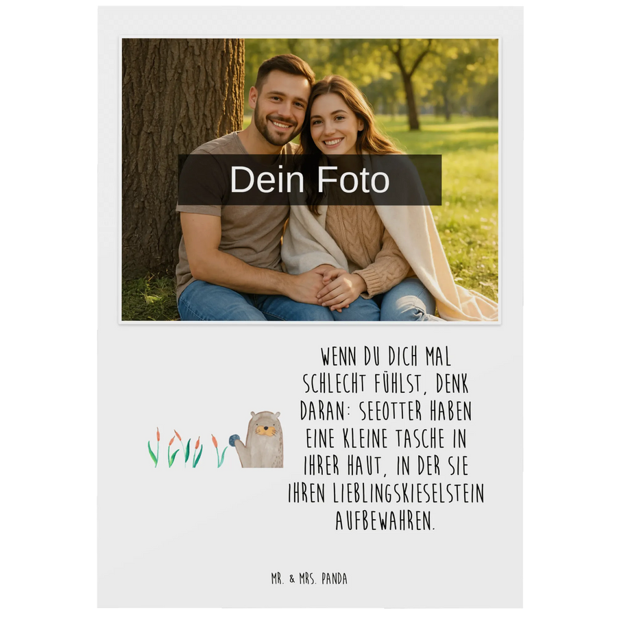 Ob als kleine Deko, als liebevolle Erinnerung oder als besondere Grußkarte – die personalisierte Foto Postkarte „Otter mit Stein" ist ein wundervolles Geschenk für viele Gelegenheiten und ein herzlicher Botschafter aus der Otter - Kollektion von Mr. & Mrs. Panda. 🐾💌