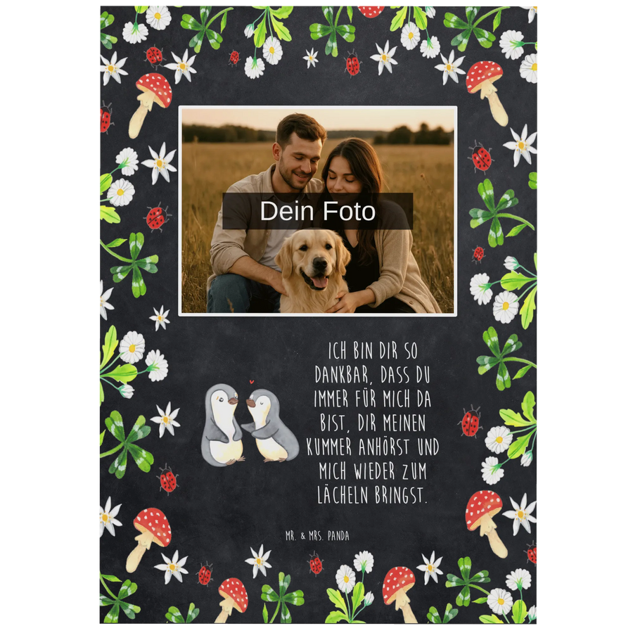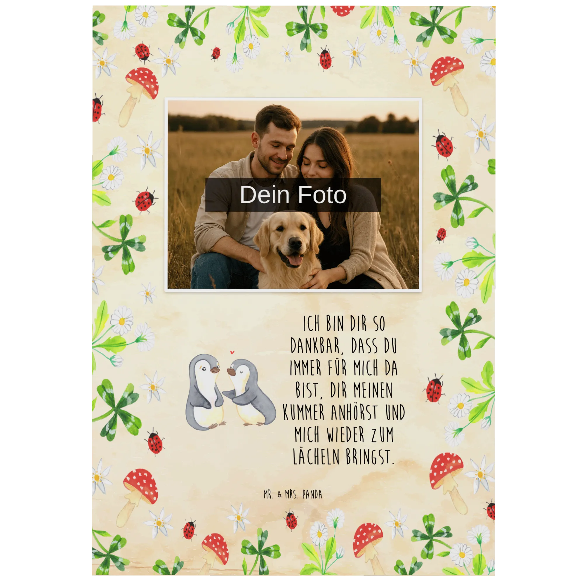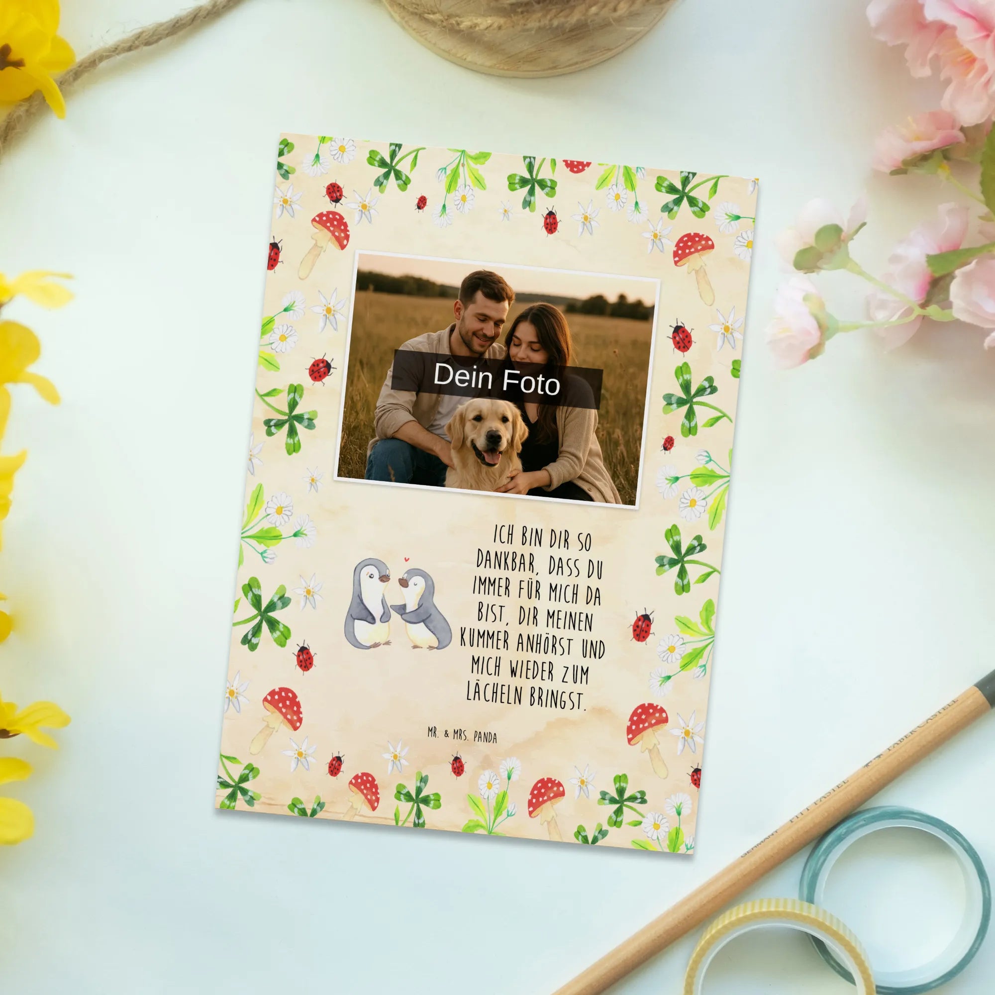 Die beiden niedlichen Pinguine, die sich zärtlich zuneigen, verkörpern Geborgenheit und Trost. Mit dem liebevollen Slogan: "Ich bin dir so dankbar, dass du immer für mich da bist, dir meinen Kummer anhörst und mich wieder zum Lächeln bringst", versendest du nicht nur eine Postkarte, sondern ein Stück deiner Seele. Jeder kann sie personalisieren, indem er ein eigenes Foto hinzufügt.