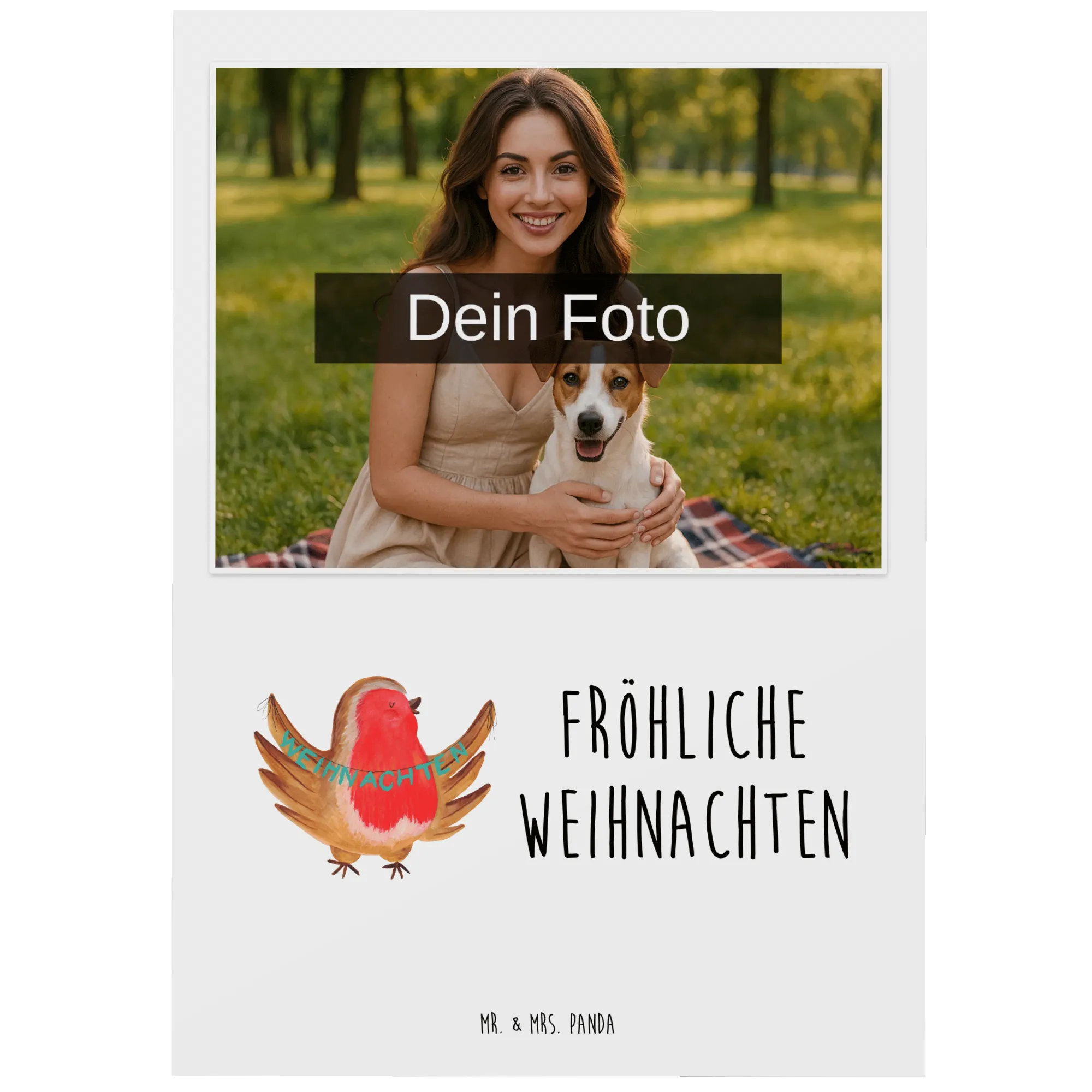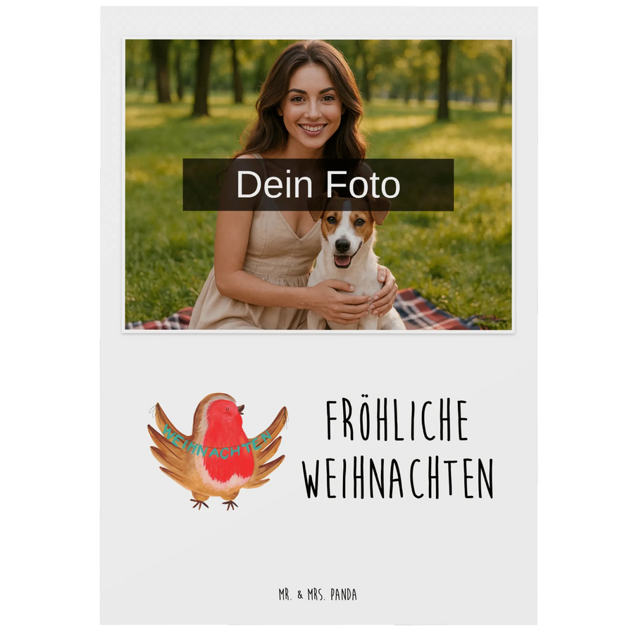 Die personalisierte Foto Postkarte "Rotkehlchen Weihnachten" von Mr. & Mrs. Panda ist das perfekte Geschenk für die schönste Zeit des Jahres. Egal, ob Du sie an Freunde, Familie oder Kollegen verschenkst, diese besondere Karte sorgt garantiert für ein Lächeln und eine herzerwärmende Stimmung.