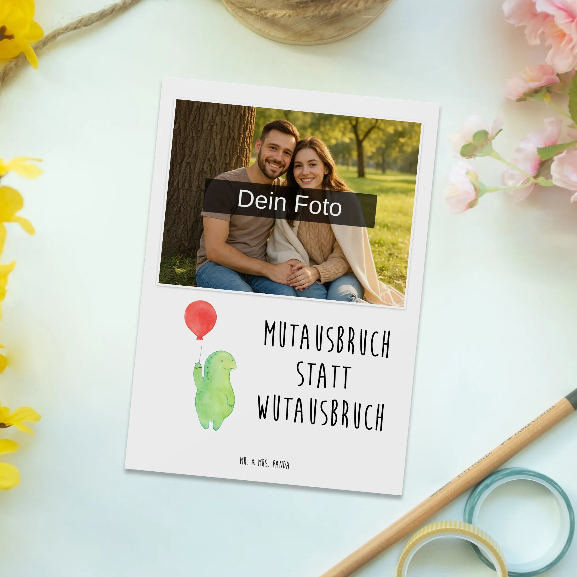 Entdecke die perfekte personalisierte Foto Postkarte mit dem zauberhaften Motiv der Schildkröte Luftballon von Mr. & Mrs. Panda. Diese einzigartige Karte ist ideal für alle, die ihren Liebsten eine besondere Freude bereiten möchten. Ob zum Geburtstag, zur Taufe oder einfach so - diese Postkarte bringt garantiert ein Lächeln ins Gesicht.