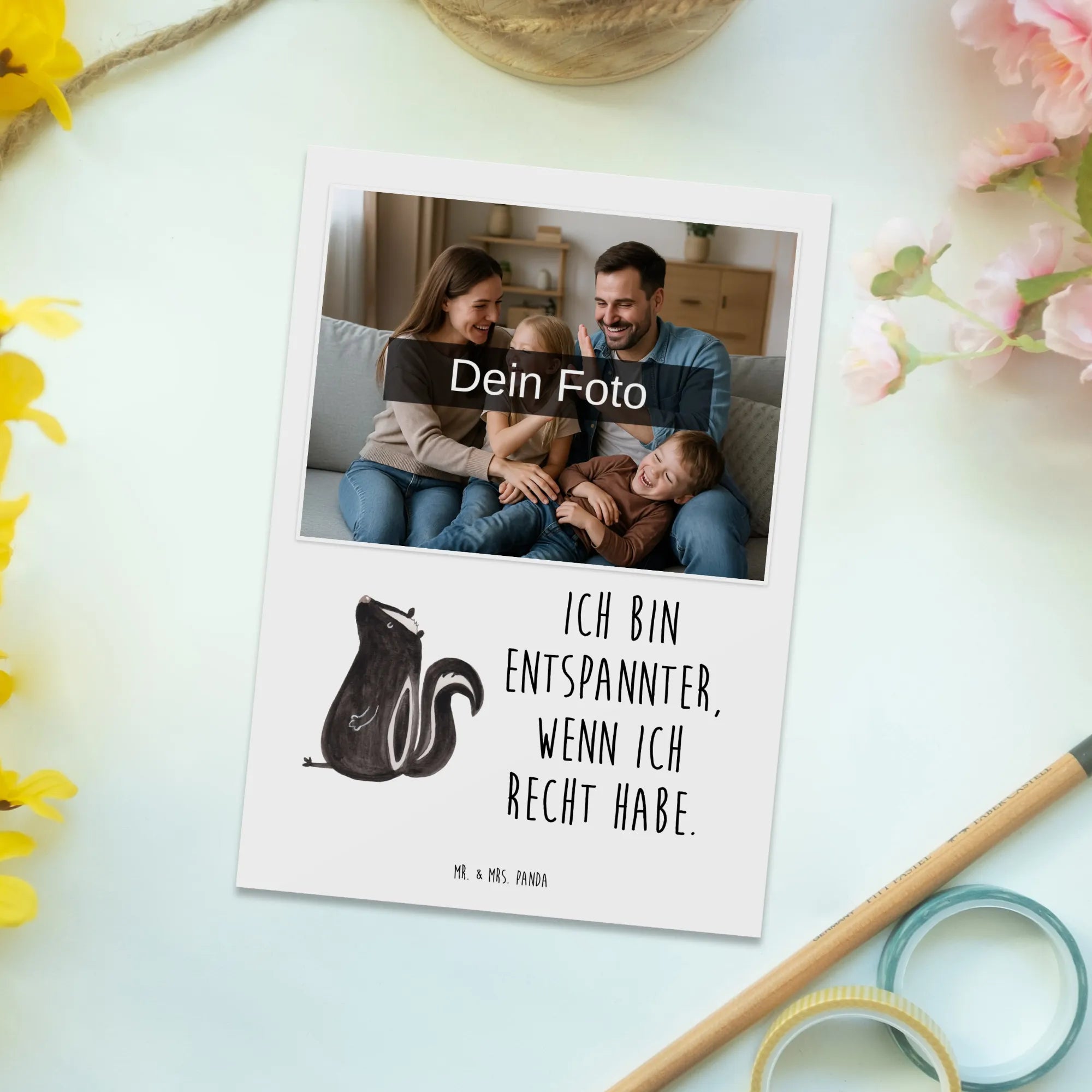 Die personalisierte Foto Postkarte mit dem niedlichen Motiv des sitzenden Stinktiers aus der Stinktier-Kollektion von Mr. & Mrs. Panda ist das perfekte Geschenk für alle, die es lieben, ihren Raum mit einem Hauch von Humor und Natur zu verschönern.