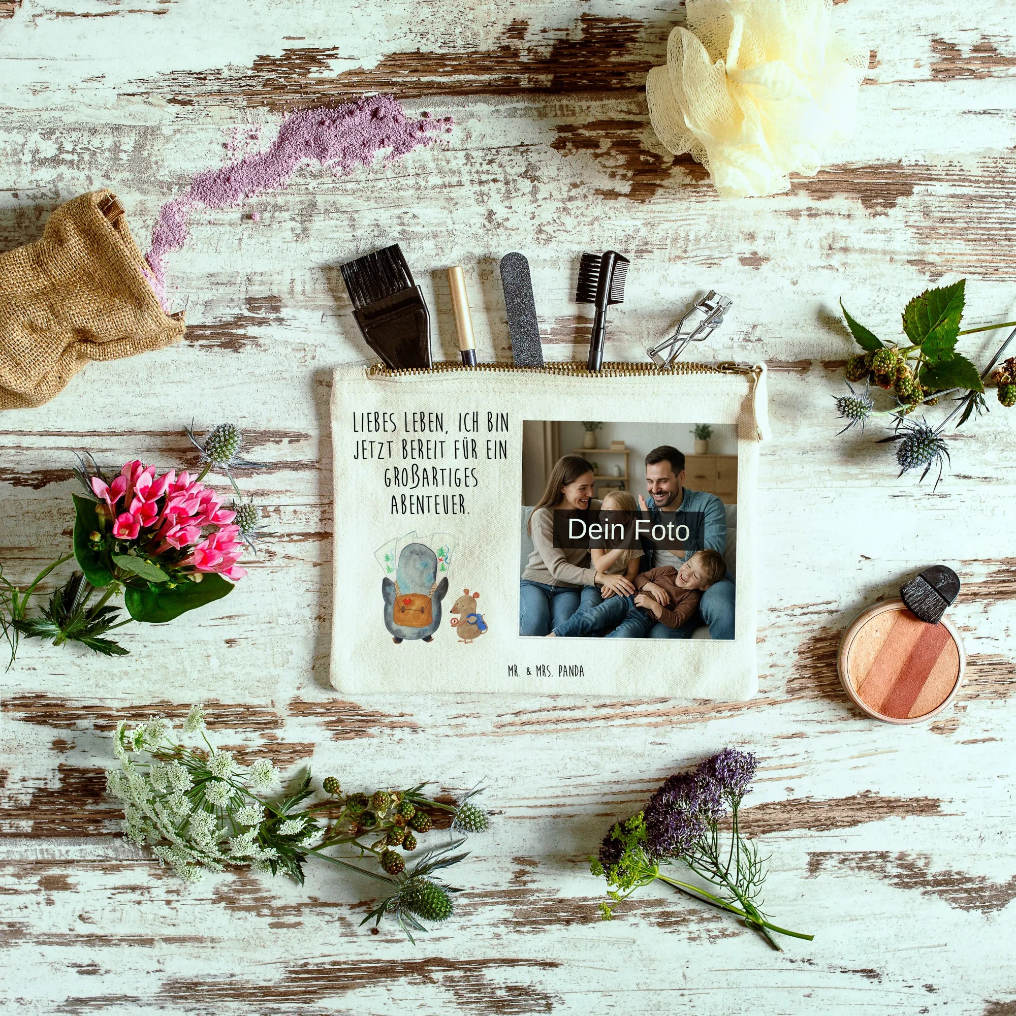 Entdecke die zauberhafte, personalisierte Foto Schminktasche von Mr. & Mrs. Panda! Diese einzigartige Tasche ist nicht nur praktisch, sondern auch ein echter Hingucker. Sie wird hochwertig bedruckt mit unseren süßen Motiven und Sprüchen. Darf es dein persönliches Wunschfoto sein? Lade einfach dein Lieblingsbild hoch und gestalte deine eigene Tasche! Die Maße sind in verschiedenen Größen erhältlich, sodass du die perfekte Größe für all deine Kosmetikartikel findest. Ob für den Alltag, Reisen oder als stilvolles Aufbewahrungstalent für deine Stifte – diese Tasche ist vielseitig einsetzbar! Das Material ist 100% weiche Baumwolle, was die Tasche zusätzlich besonders angenehm macht. Der Clou: Die umsäumten und eingeschlagenen Innennähte sorgen dafür, dass die Tasche formbeständig bleibt, egal was du hineinlegst. Pflege? Kein Problem! Eine lauwarme Handwäsche wird empfohlen, damit deine Tasche lange wie neu aussieht. Bitte achte darauf, dass das hochgeladene Foto eine hohe Auflösung hat, damit das Druckergebnis traumhaft wird. Außerdem solltest du darauf achten, den richtigen Bildausschnitt zu wählen, damit deine besten Momente perfekt in Szene gesetzt werden. Mache jeden Tag zu etwas Besonderem mit dieser einzigartigen, personalisierten Schminktasche!