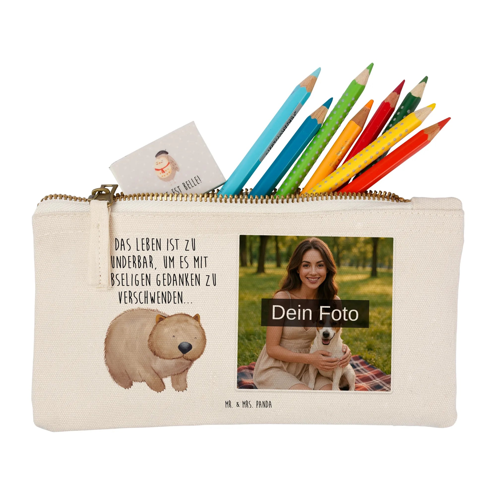 Entdecke die personalisierte Foto Schminktasche von Mr. & Mrs. Panda! Sie verleiht deinem Alltag eine persönliche Note, denn du kannst sie mit deinem Wunschfoto bedrucken lassen. Diese schmucke Tasche bietet Platz für all deine Kosmetikartikel und eignet sich auch bestens als Stiftemäppchen oder für kleine Aufbewahrungen. Das hochwertige Material aus 100% weicher Baumwolle sorgt für ein angenehmes Gefühl auf der Haut. In verschiedenen Größen erhältlich, um deinen Bedürfnissen gerecht zu werden. Die Innennähte sind umsäumt und eingeschlagen, was der Tasche eine formbeständige Struktur verleiht. Pflegehinweise: Eine lauwarme Handwäsche ist empfohlen, um die Farben und das Design zu erhalten. Achte darauf, dass das Bild, das du hochlädst, in hoher Auflösung vorliegt, damit das Druckergebnis klar und hochwertig wird. Lass dich von deiner Kreativität leiten und kreiere eine Tasche, die so einzigartig ist wie du!