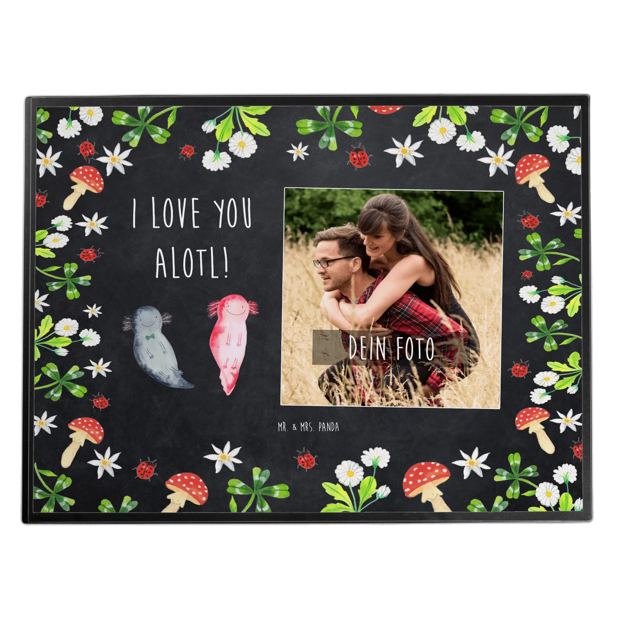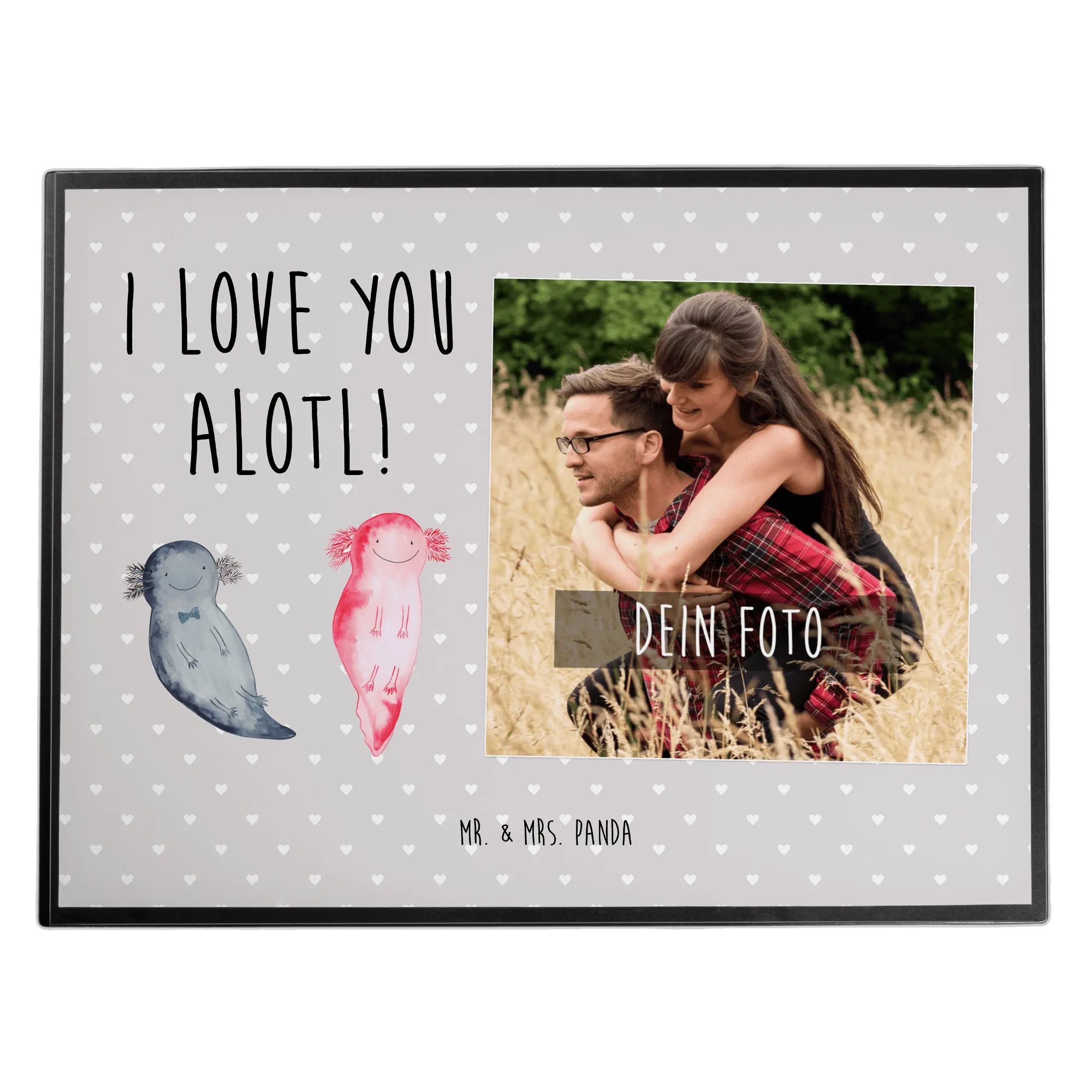 Entdecke die zauberhafte personalisierte Foto Schreibtischunterlage "Axolotl Liebe" von Mr. & Mrs. Panda – das perfekte Liebesgeschenk für deinen Partner oder deine Partnerin! Diese Schreibtischunterlage ist nicht nur praktisch, sondern auch eine wundervolle Möglichkeit, den Schreibtisch mit einer persönlichen Note zu verschönern.