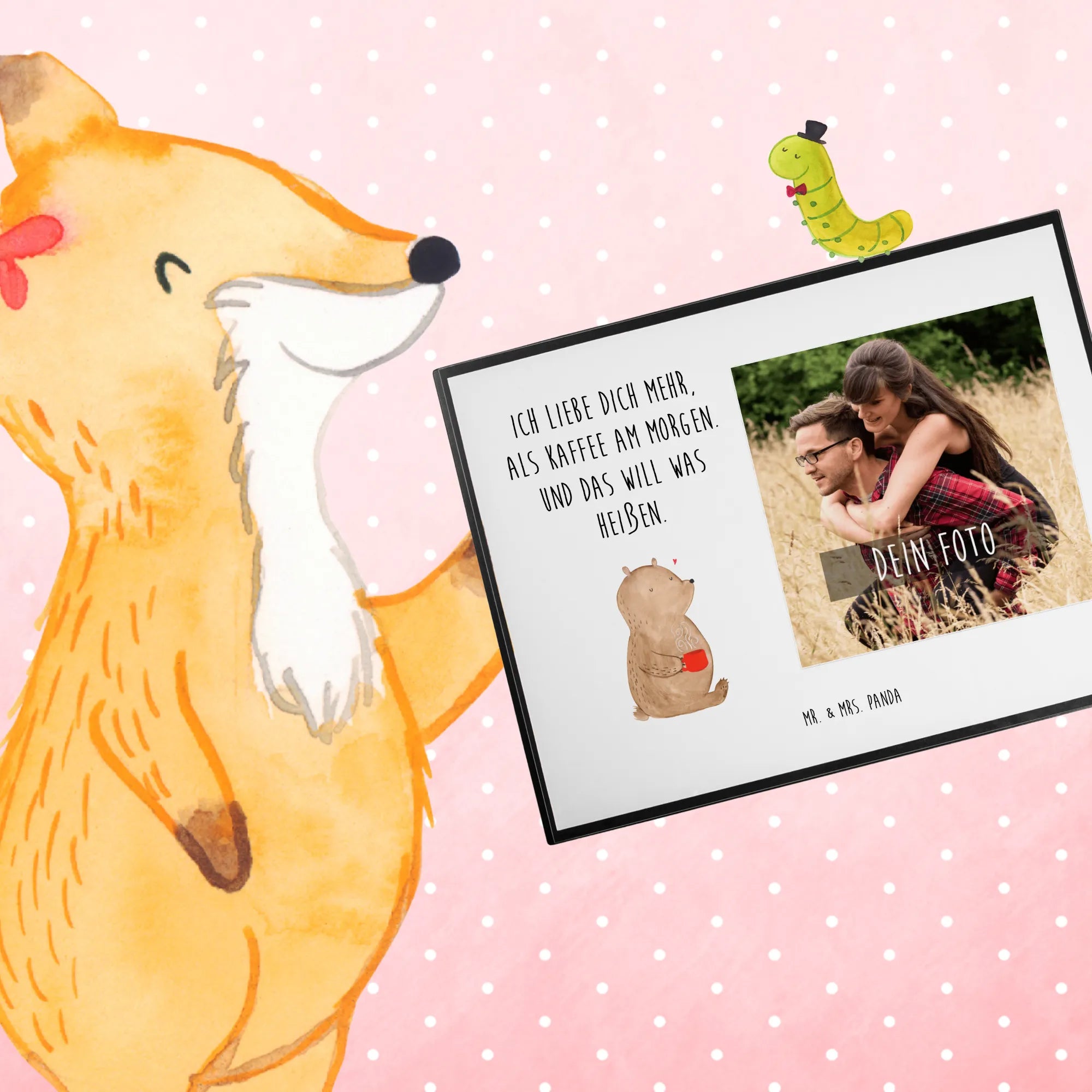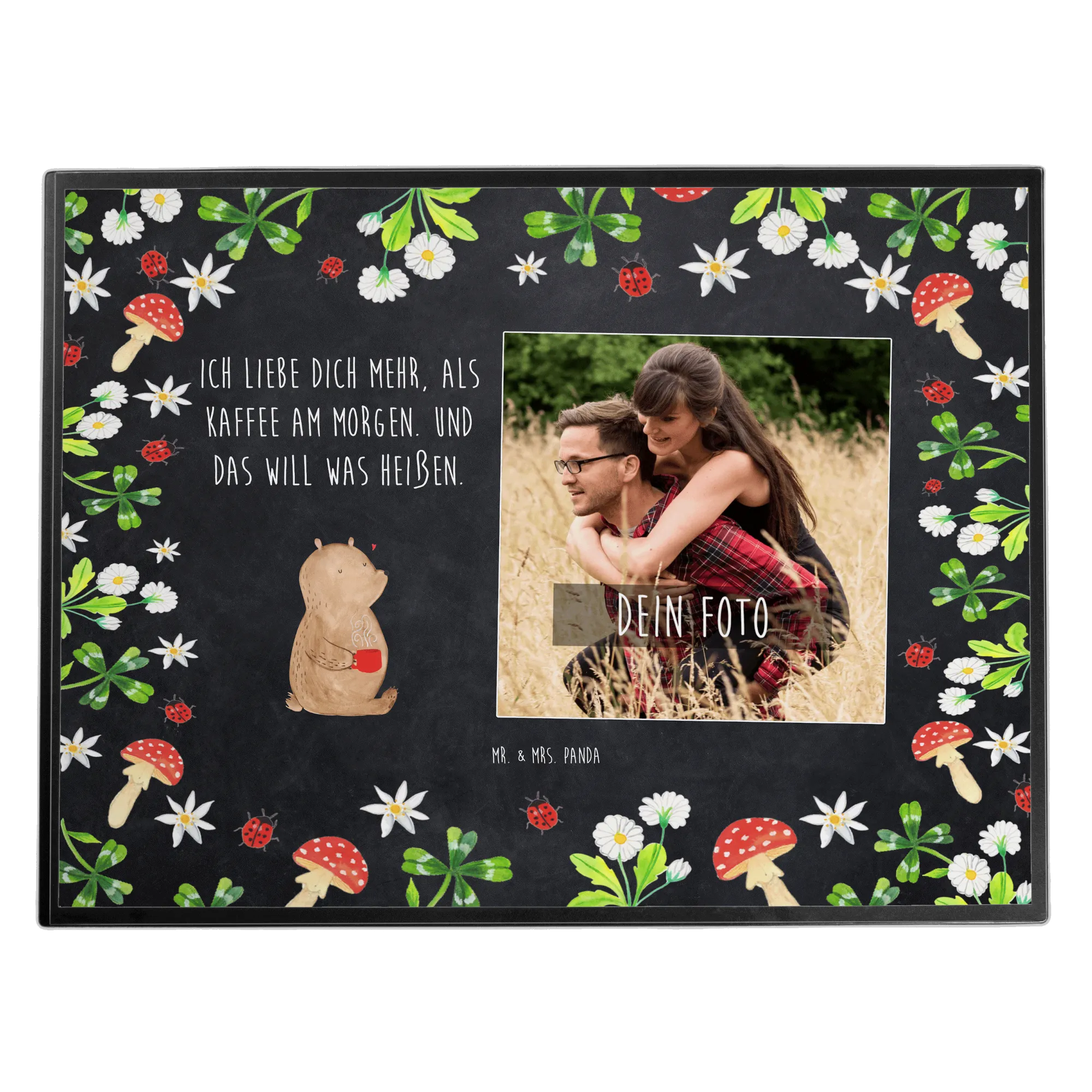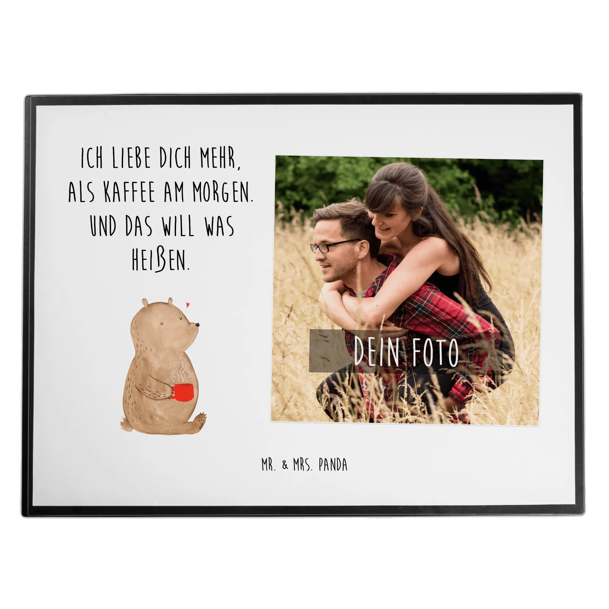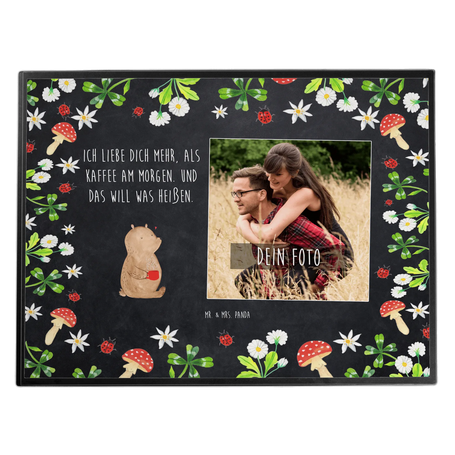Die personalisierte Foto Schreibtischunterlage "Bär Morgenkaffee" aus der Liebe Kollektion von Mr. & Mrs. Panda ist das perfekte Geschenk für alle, die ihre Zuneigung auf liebevolle Art und Weise zeigen möchten.