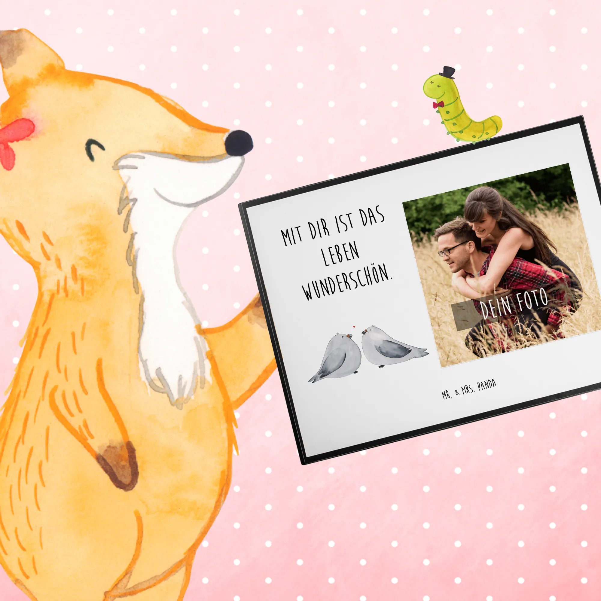 Die personalisierte Foto Schreibtischunterlage von Mr. & Mrs. Panda ist nicht nur ein praktisches Büromöbel, sondern auch ein wunderschönes Liebesgeschenk für all jene, die das Gefühl der Zuneigung in ihren Alltag bringen möchten. Mit dem zauberhaften Motiv der Turteltauben, die sich liebevoll zu einander neigen, ist diese Unterlage ein echtes Statement für die Liebe. Zwischen den Schnäbeln der Vögel schwebt ein kleines rotes Herz, das die romantische Verbindung symbolisiert. Die Schreibtischunterlage hat mit den Maßen 400 mm x 530 mm die perfekte Größe, um als Schreibtischschutz zu dienen und gleichzeitig als dekoratives Element zu fungieren.