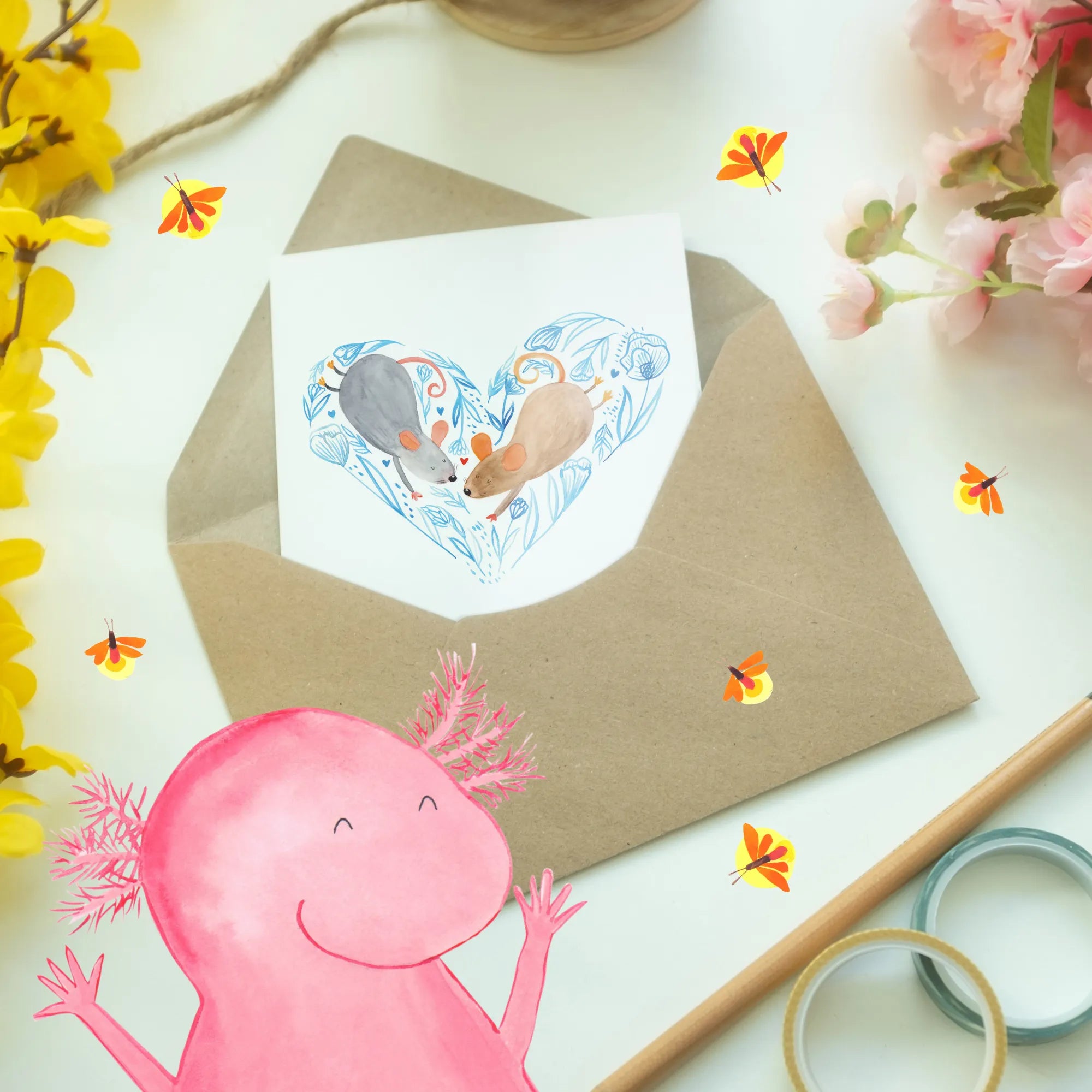 Die personalisierte Grußkarte "Hochzeit Mäuse Herz" von Mr. & Mrs. Panda ist das perfekte Geschenk für frisch Vermählte und Liebespaare! 💖 Mit ihrem bezaubernden Motiv, das zwei süße Mäuse in einem Herz aus bunten Blumen zeigt, ist diese Karte nicht nur ein schöner Blickfang, sondern auch eine ganz persönliche Art, Glückwünsche zu übermitteln.