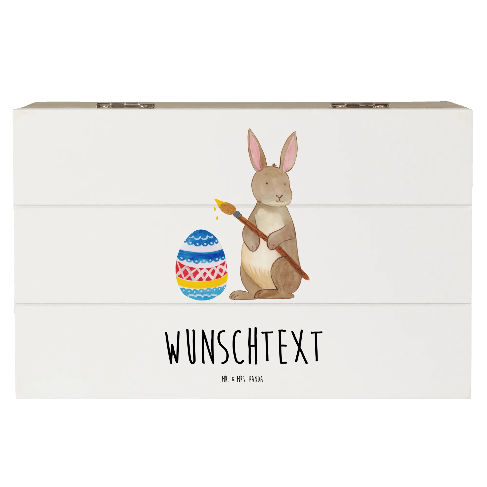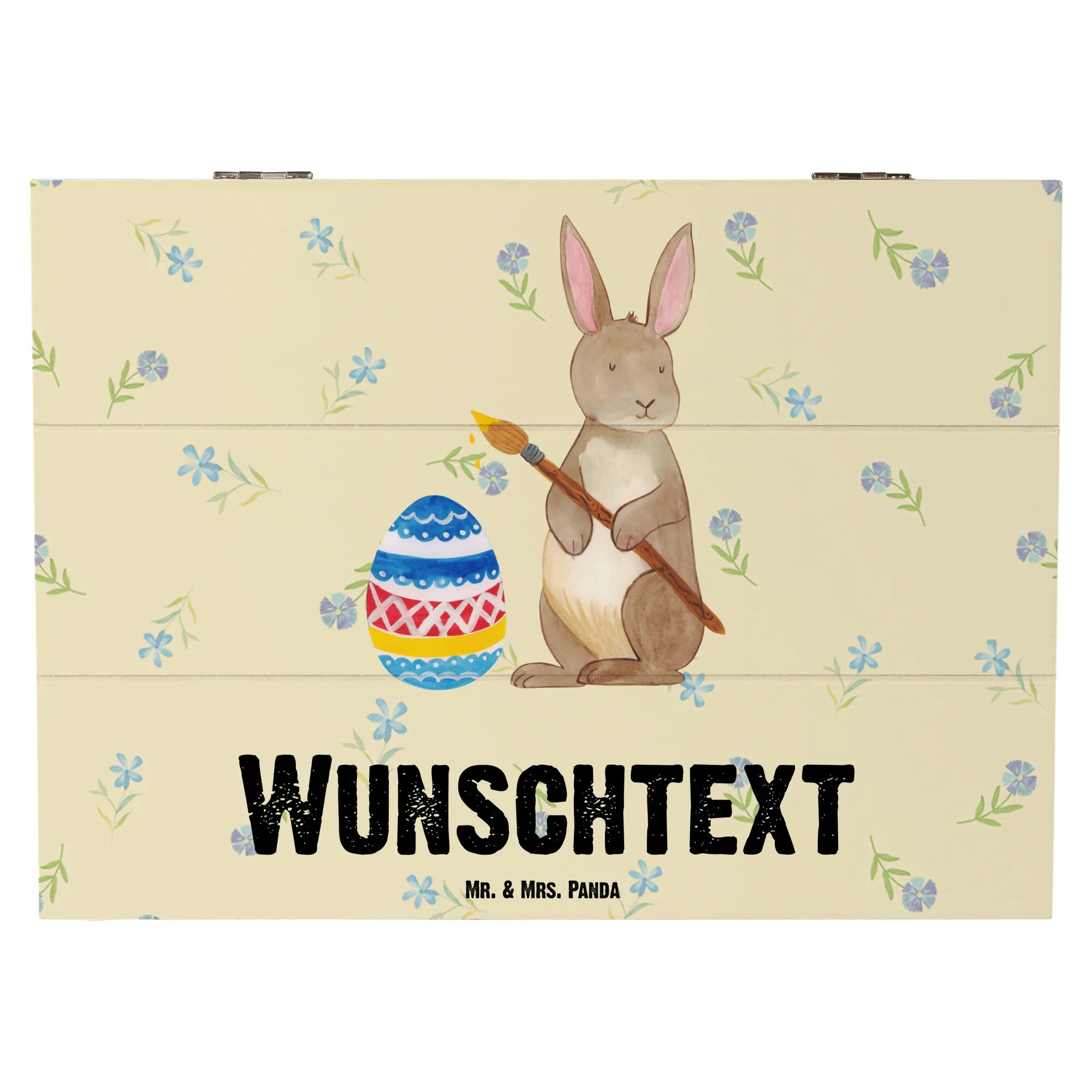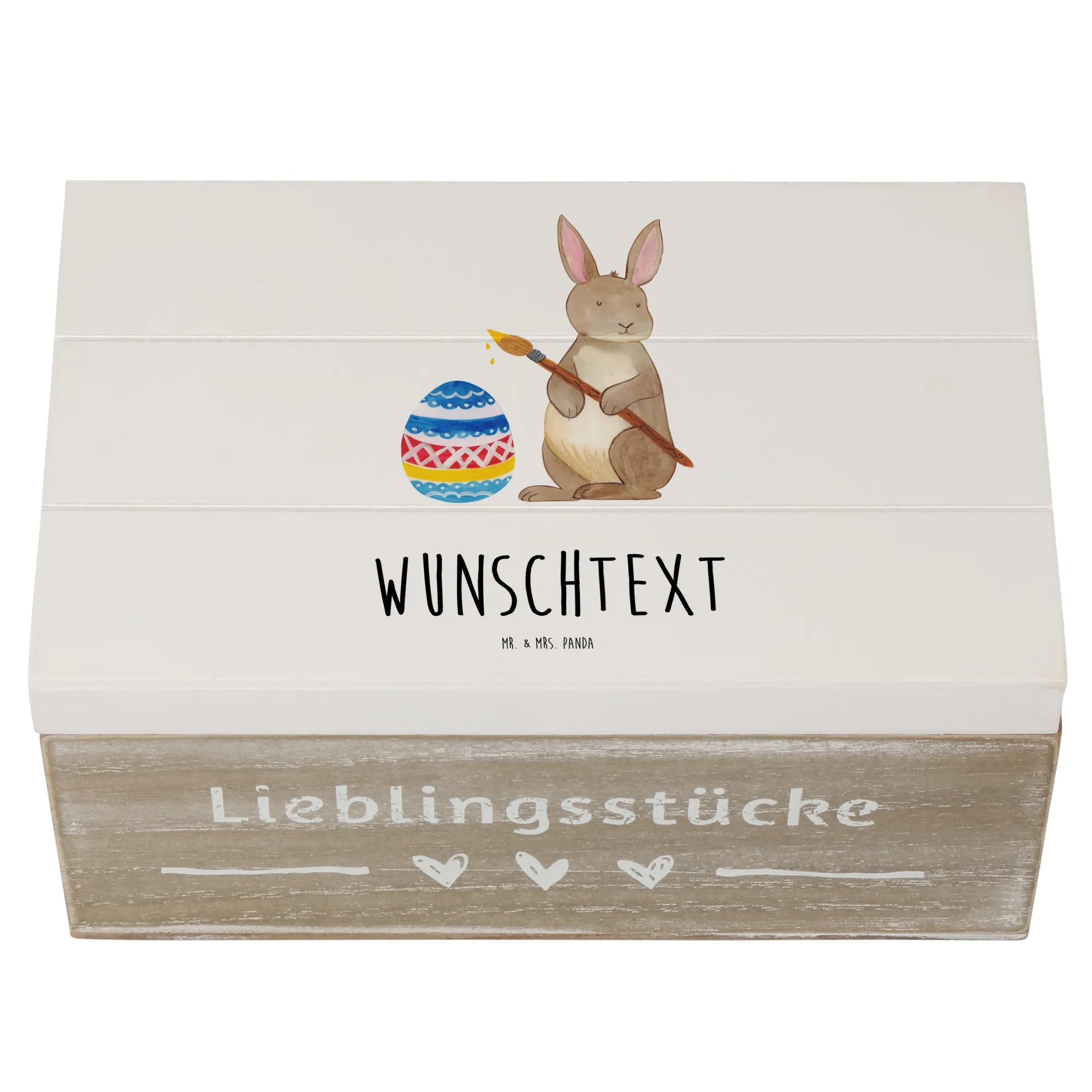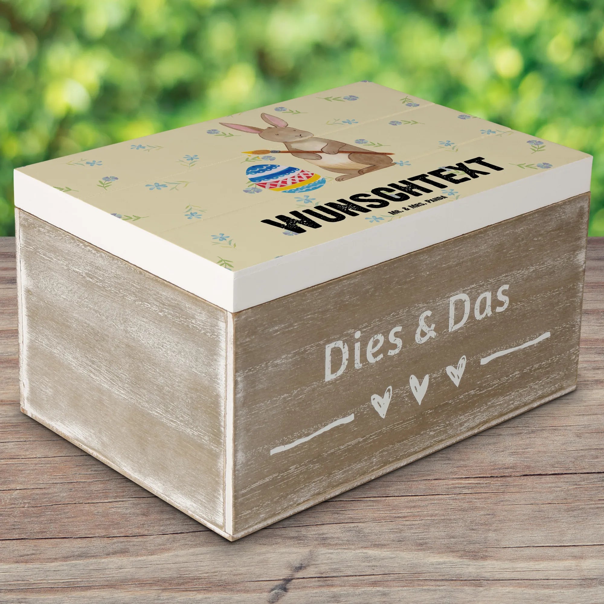 Die personalisierte Holzkiste mit dem süßen Motiv Hase Eiermalen von Mr. & Mrs. Panda ist das perfekte Geschenk für die Osterzeit!