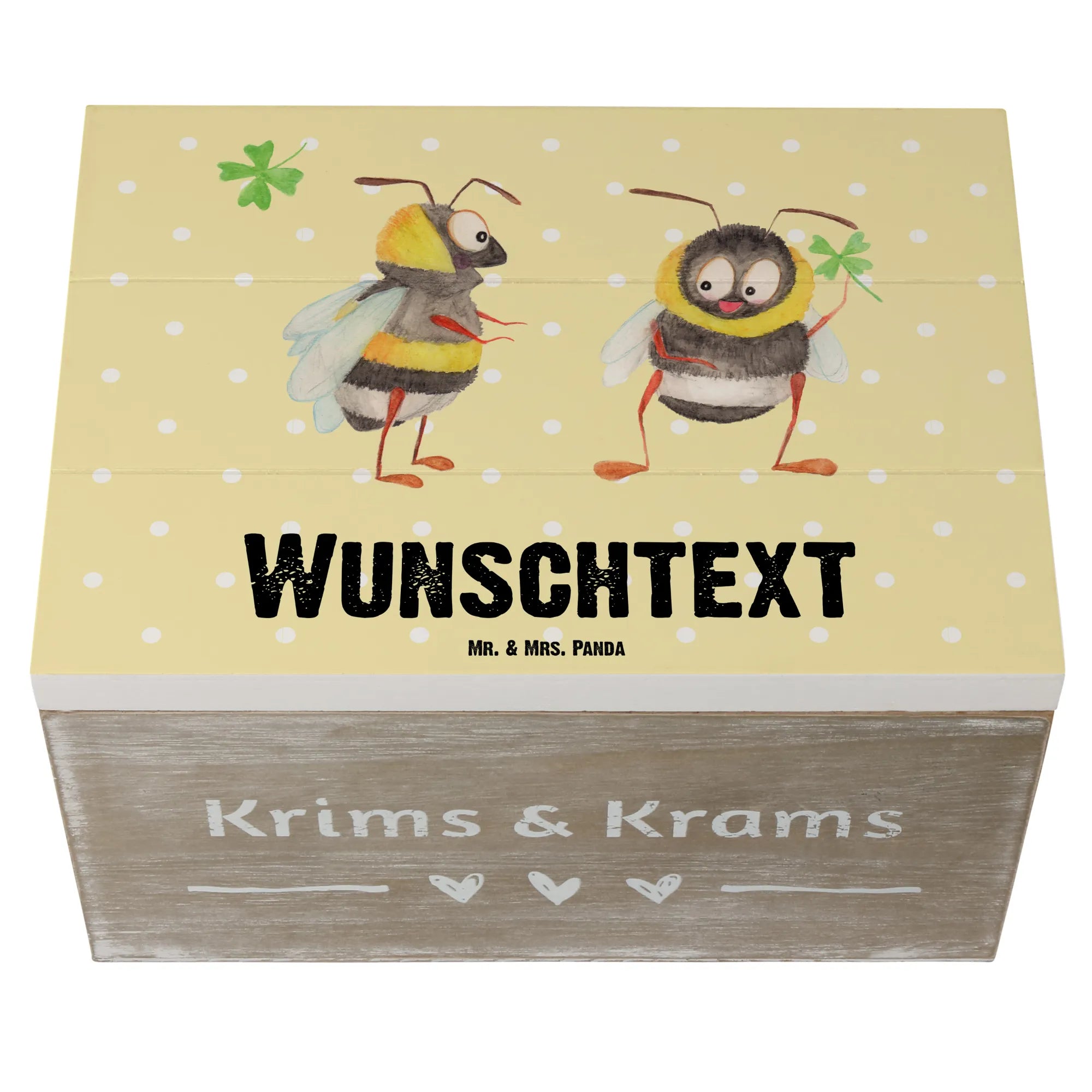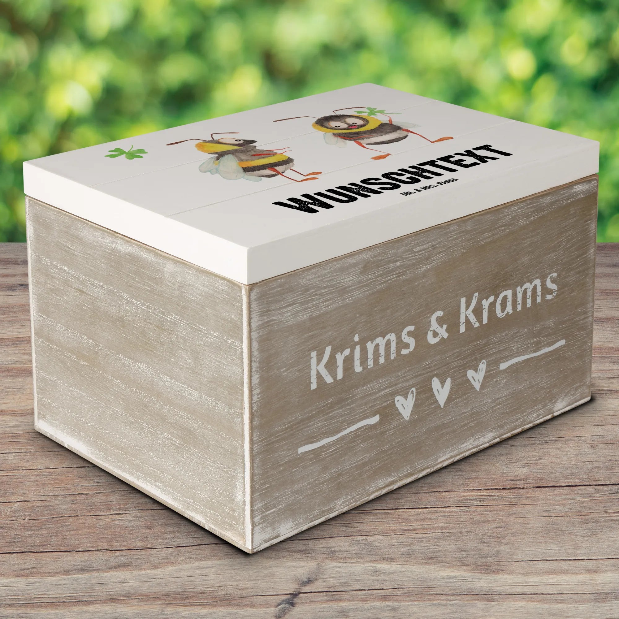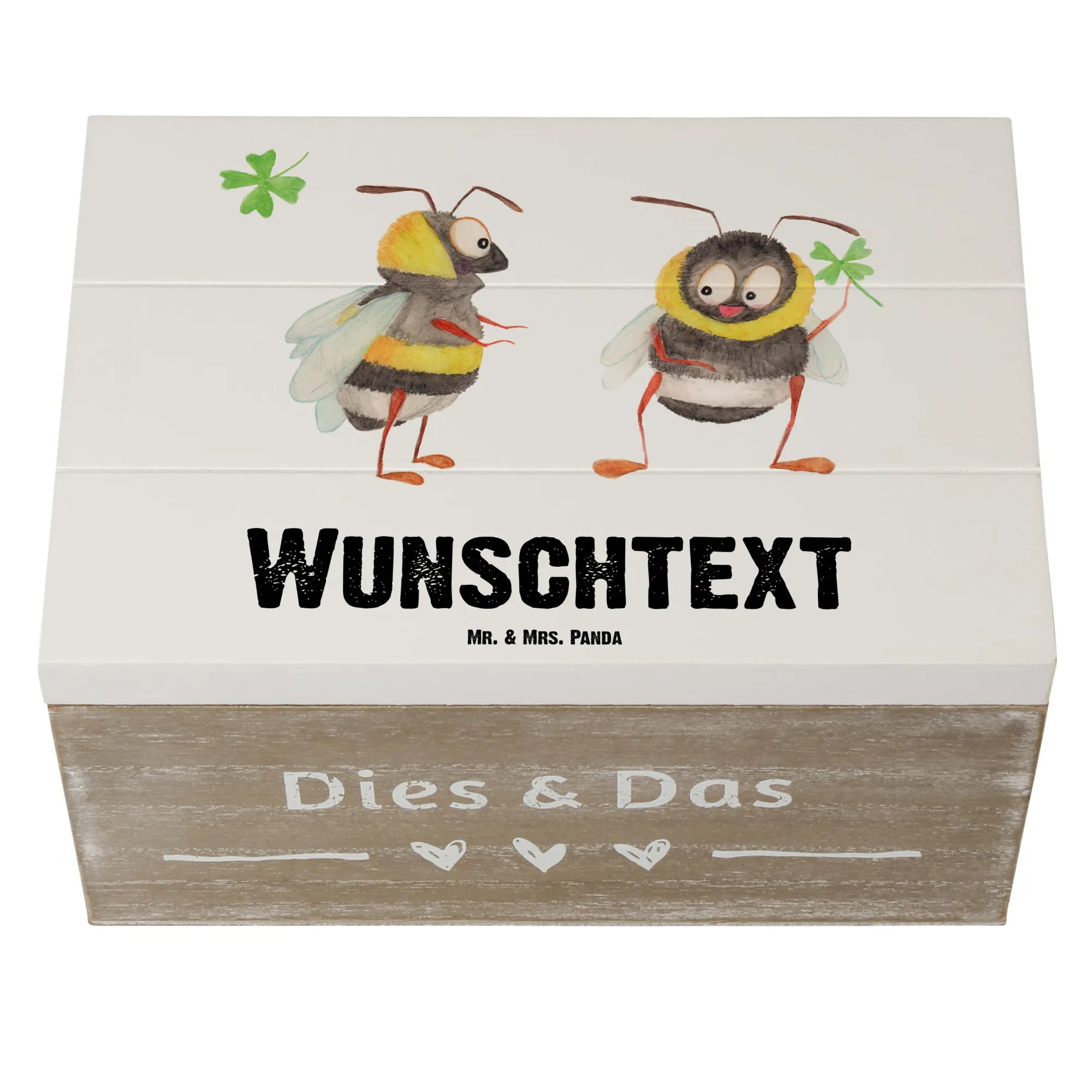 Wenn Du auf der Suche nach einem ganz besonderen Geschenk bist, dann ist die personalisierte Holzkiste mit dem bezaubernden Motiv der Hummeln mit Kleeblatt aus der Small World Kollektion von Mr. & Mrs. Panda genau das Richtige für Dich!