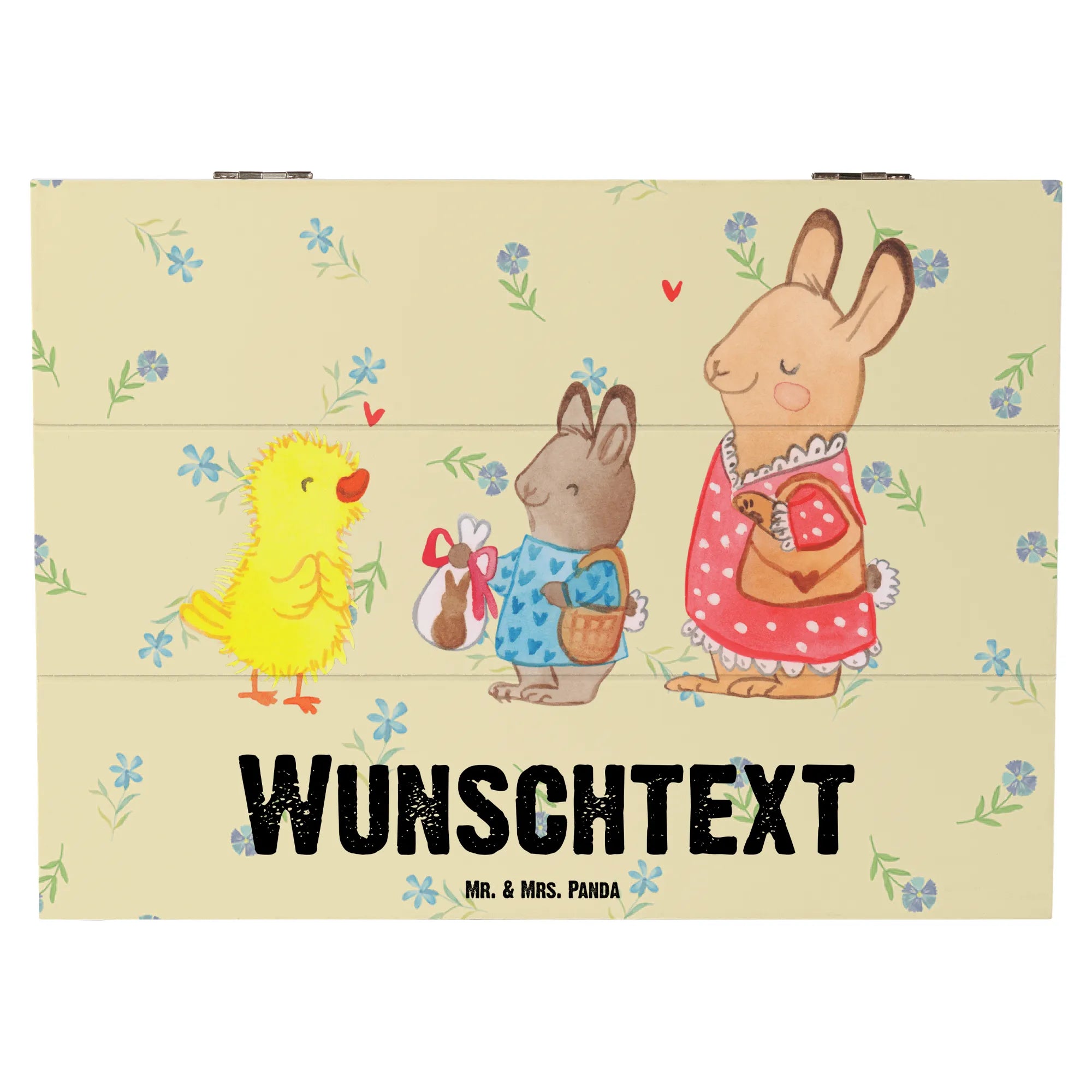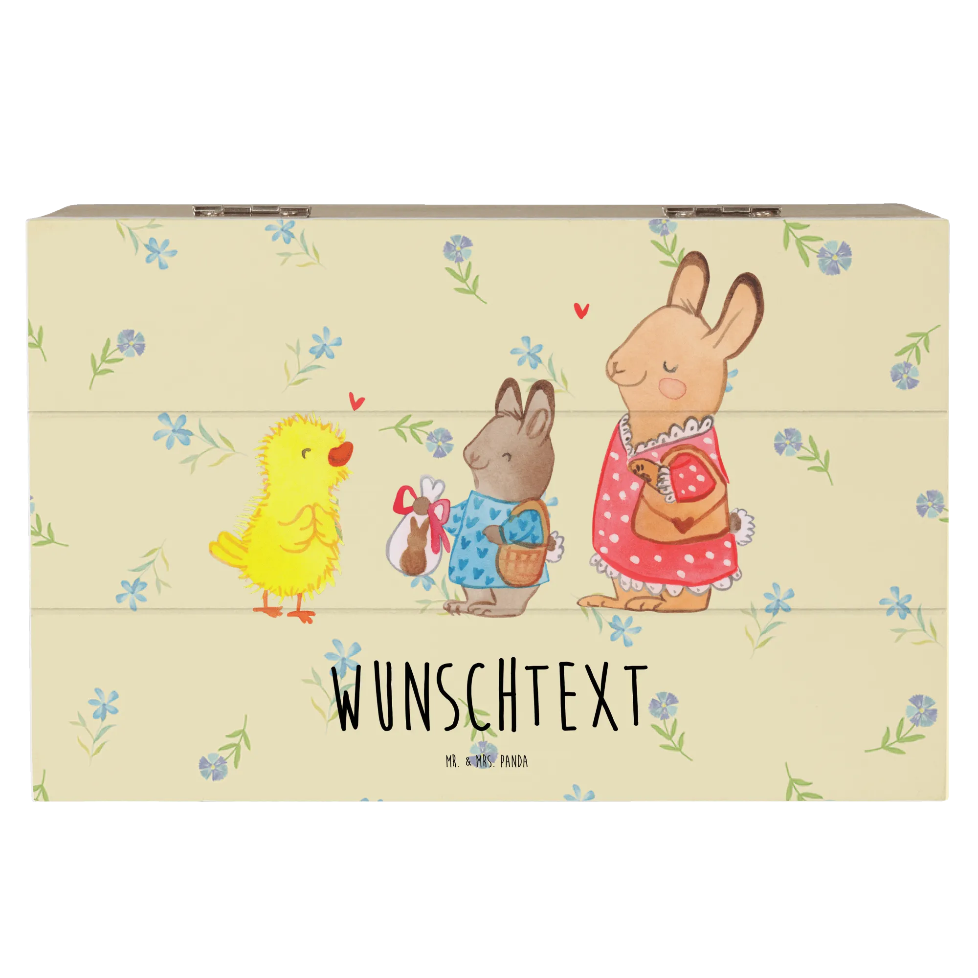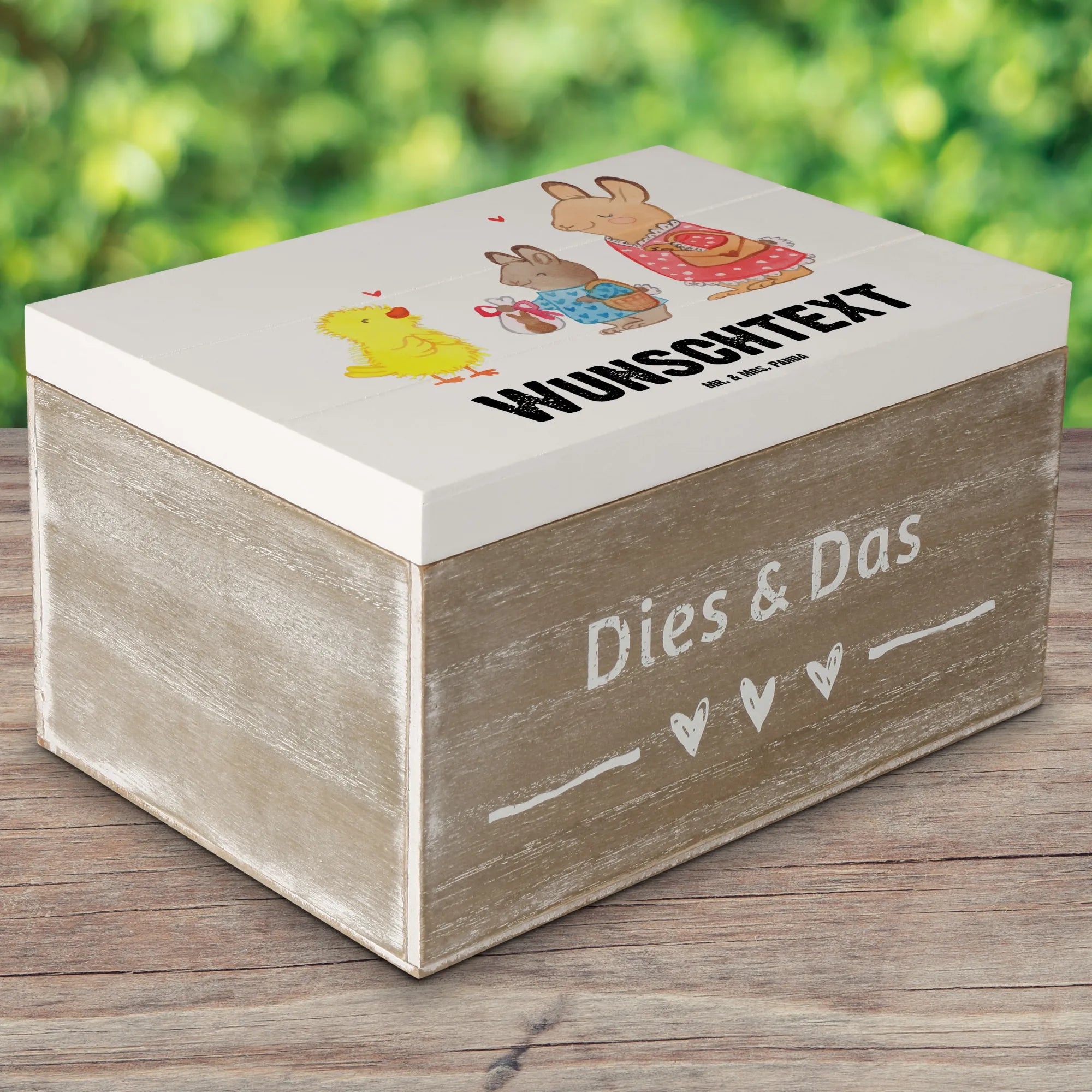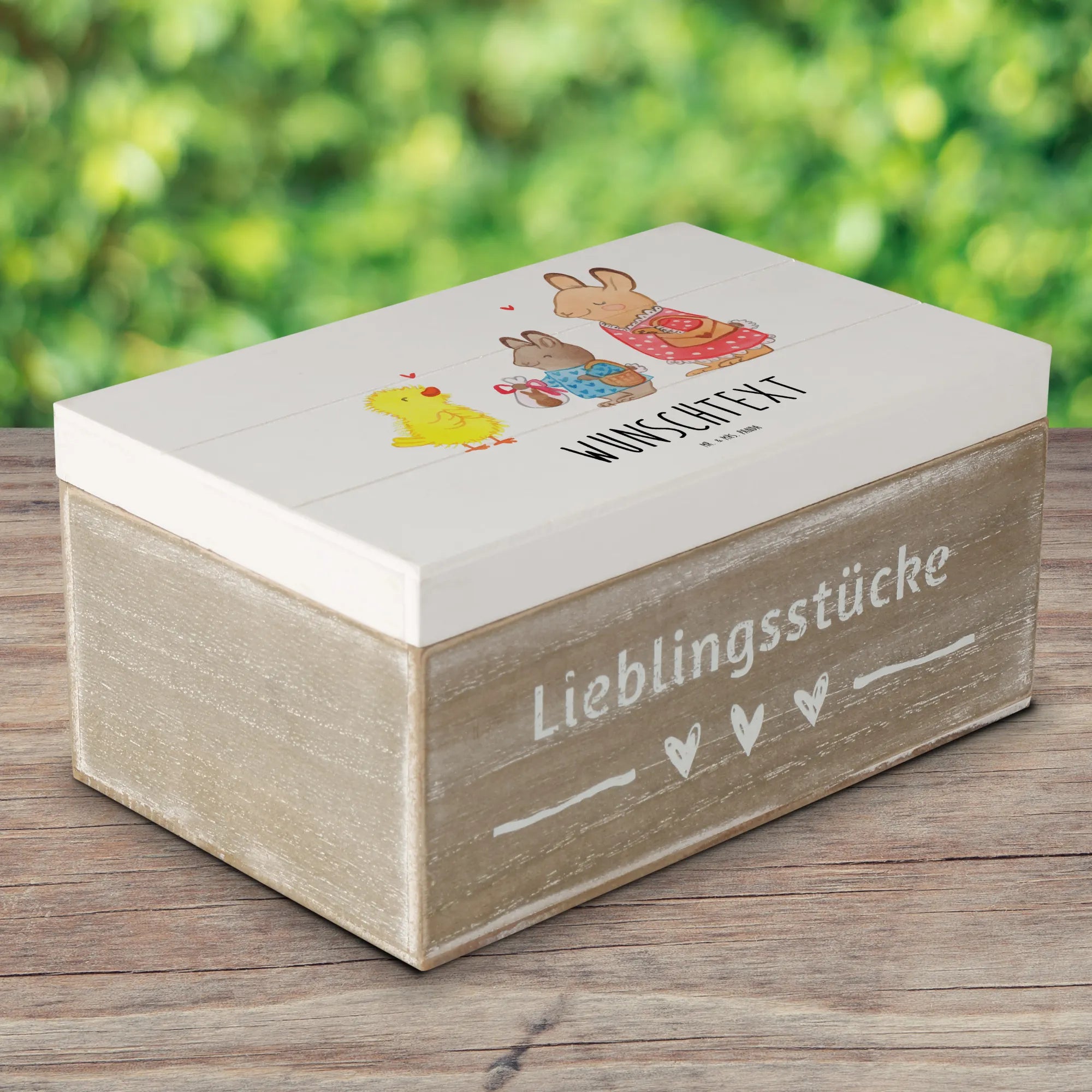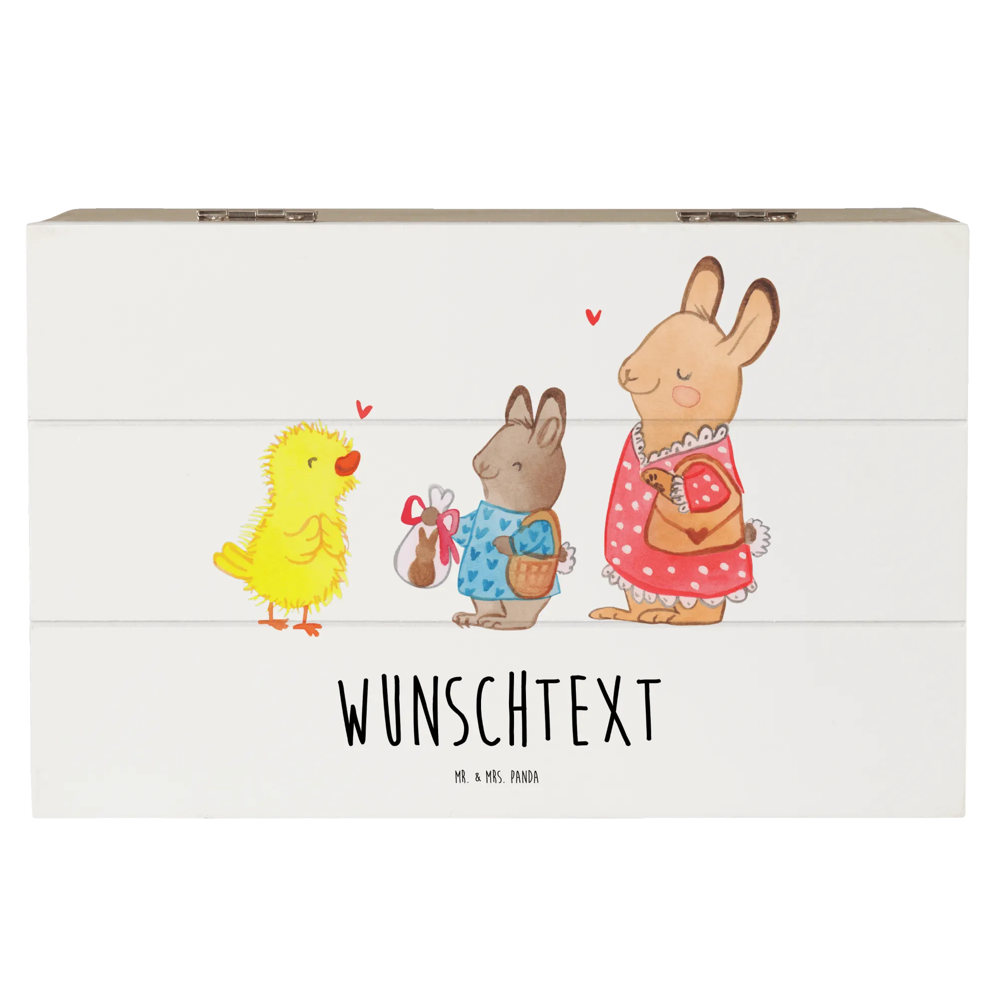 Jede Kiste ist mit dem wunderbaren Motiv von der Hasen-Mama und ihrem kleinen Kind verziert, die gerade einen Schokoladen-Osterhasen überreichen. Dies macht jede Kiste zu einem Geschenk, das das Herz höher schlagen lässt. Die Kiste ist auf Wunsch personalisierbar – so kannst du sie mit deinem Namen oder einem besonderen Spruch versehen! Ein ganz persönliches Geschenk, das zu besonderen Anlässen wie Ostern, Geburtstagen oder einfach nur so verschenkt werden kann, um Freude zu verbreiten.