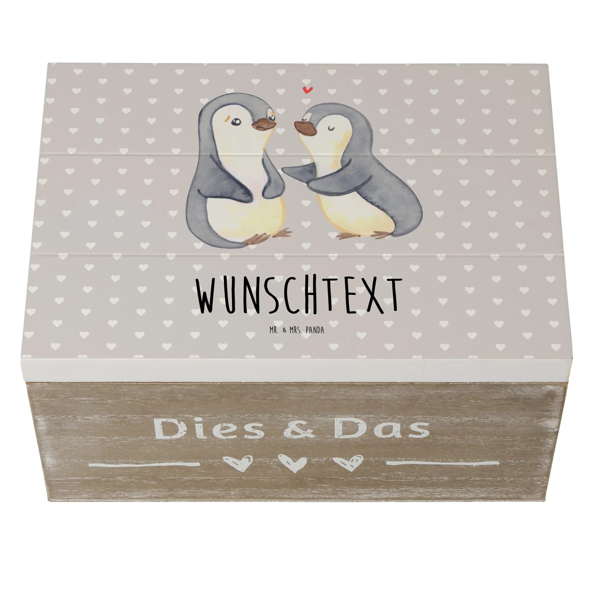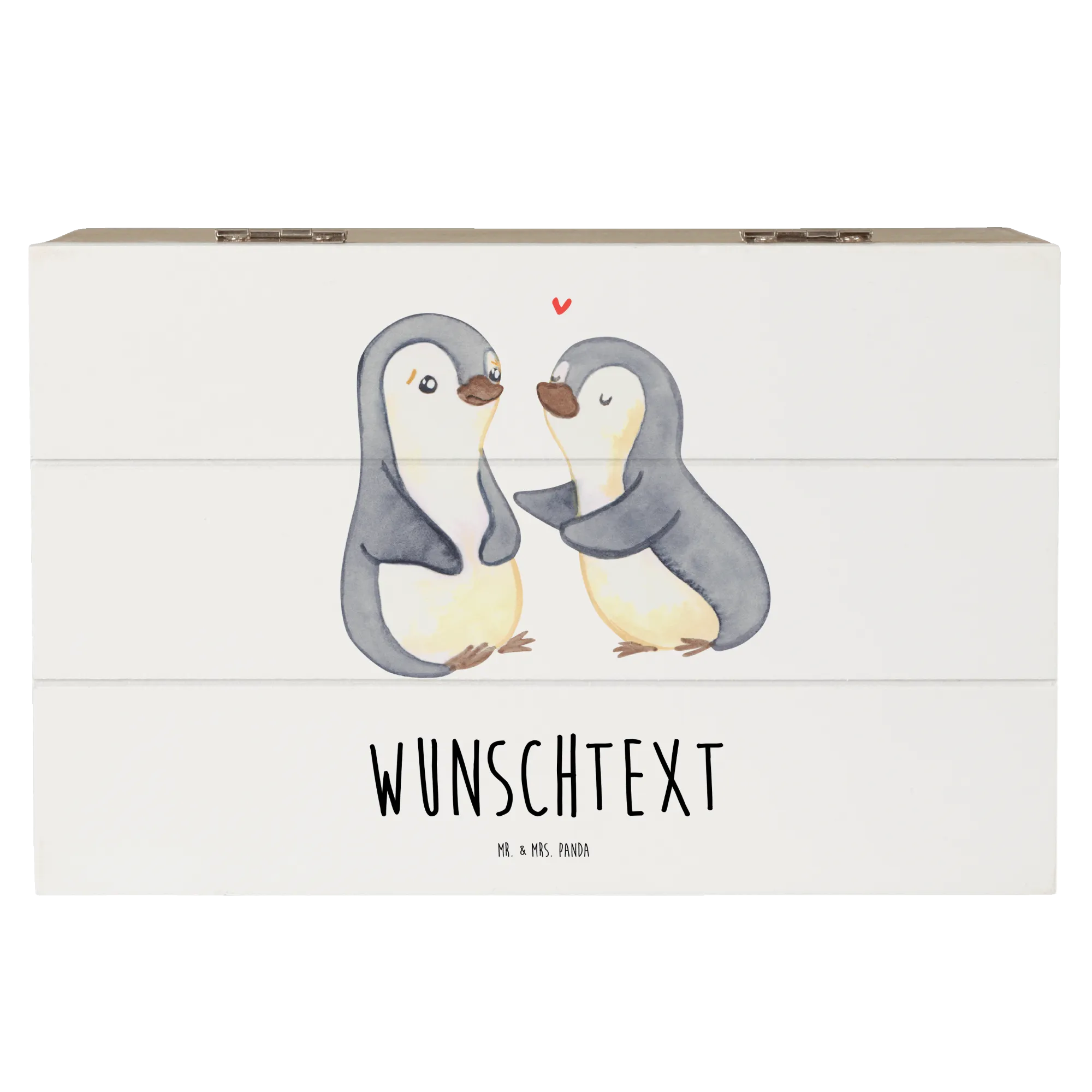Entdecke die liebevoll gestaltete personalisierte Holzkiste mit den zauberhaften Pinguinen, die Trost spenden. Diese besondere Kiste von Mr. & Mrs. Panda ist nicht nur wunderschön, sondern auch sehr praktisch. Sie bietet einen idealen Aufbewahrungsort für deine liebsten Schätze, Erinnerungen oder kleine Geschenke. Ob für den Jahrestag, den Valentinstag oder einfach so, diese Kiste ist das perfekte Liebesgeschenk. Mit ihrem einzigartigen Motiv von zwei Pinguinen, die sich zärtlich zuneigen, vermittelt sie Geborgenheit und Verbundenheit.