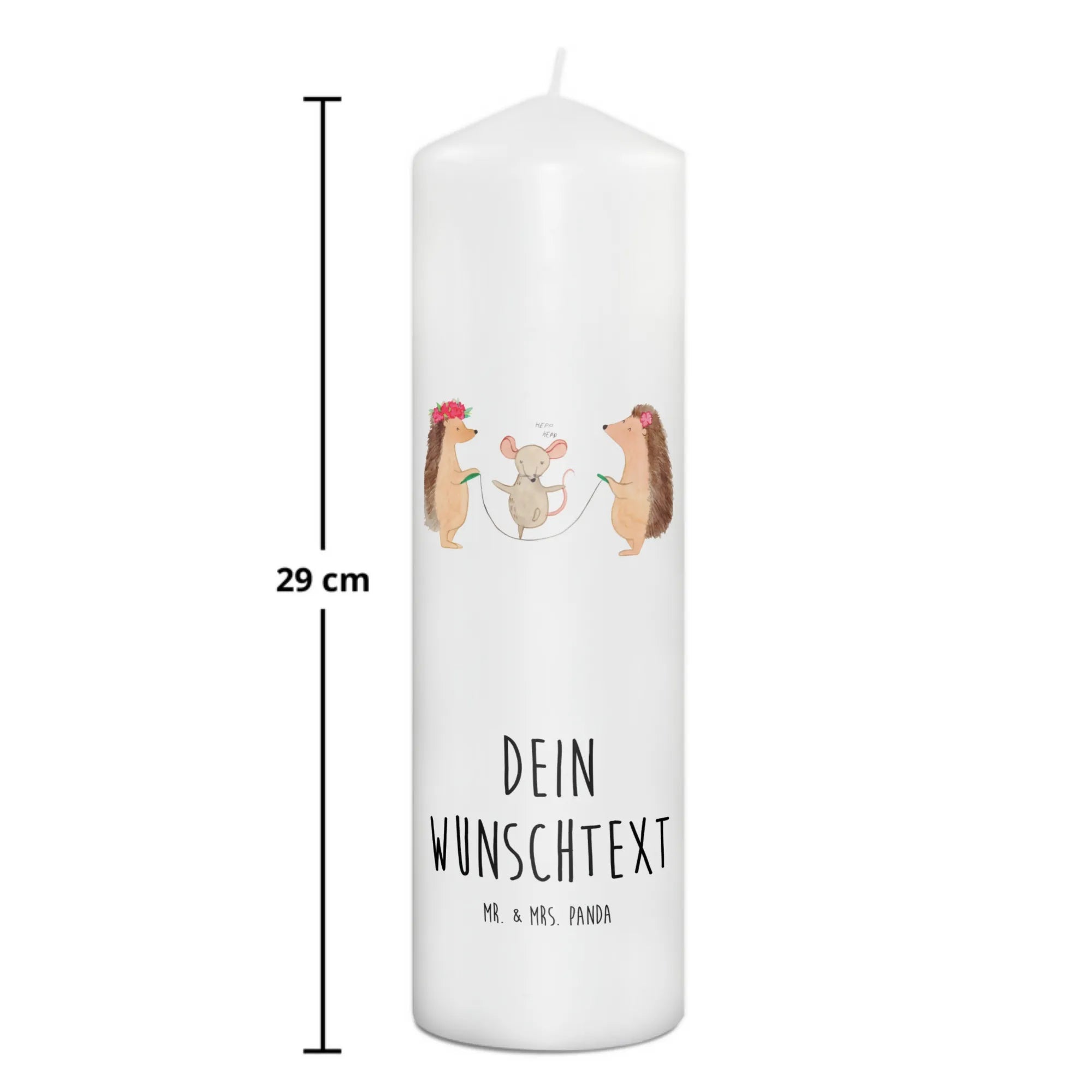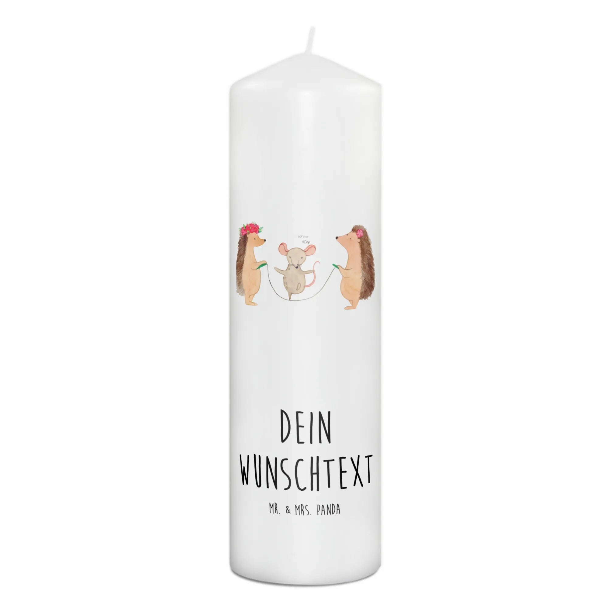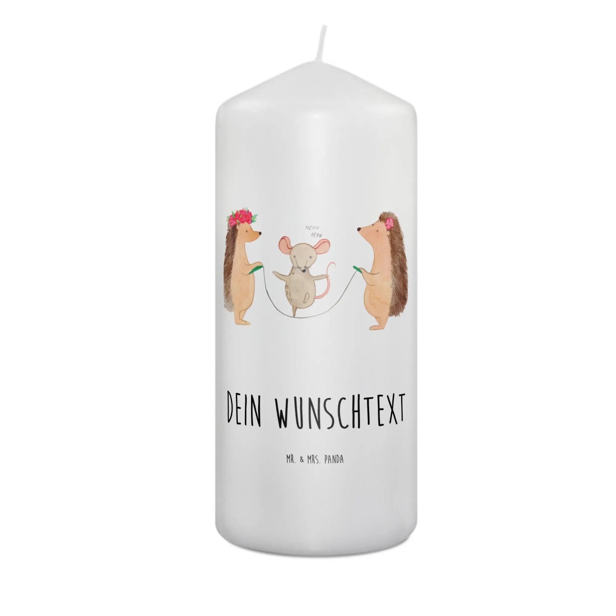Ob zu Geburtstagen, Taufen oder Kommunionen, diese Kerze wird mit einem fröhlichen Igelpaar und einer kleinen Maus bedruckt, die gemeinsam Seil springen. Das Motiv versprüht gute Laune und verleiht jedem Raum eine positive Stimmung. Die Kerze hat die Maße von 15 x 7 cm und besteht aus hochwertigem Paraffinwachs, das für eine ultralange Brenndauer sorgt.
